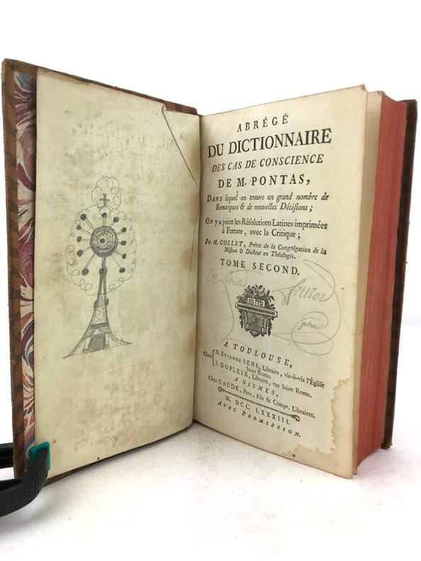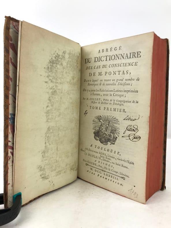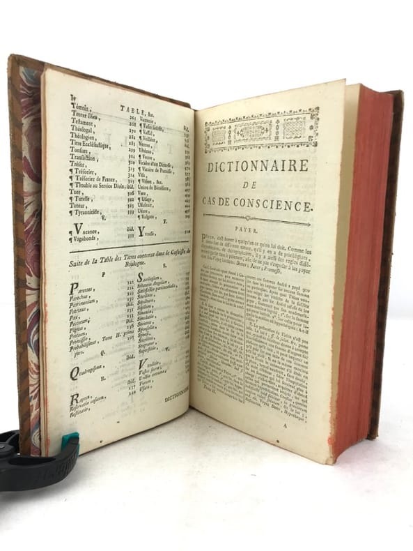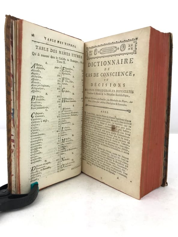 Les Libraires Associés, Paris, 1764. Trois parties en deux volumes in quarto reliés basane marbrée, reliures usagées, petits manques de peaux par endroits et coiffes recollées avec manques, mais ensemble satisfaisant. Bel exemplaire de travail. XII pp 328 ff et IV pp, 348 feuillets non paginés. Texte sur une colonne pour les définitions et sur deux colonnes pour l'exposé des cas ; la numérotation correspond aux colonnes et va donc de 4 en 4 à chaque feuillet.