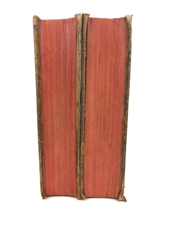 Petits manques de cuir aux coupes et coins, manque les coiffes supérieures, manque de cuir au 1er plat du Tome 1 le long de la charnière en tête ( sur 5 cm) et le long de la charnière du 2ème plat du Tome 2 ( 2 cm X 5 cm); quelques feuillets jaunis. Bon état général.(P095) ( Reu-Bur)