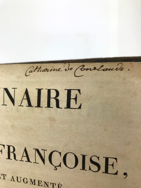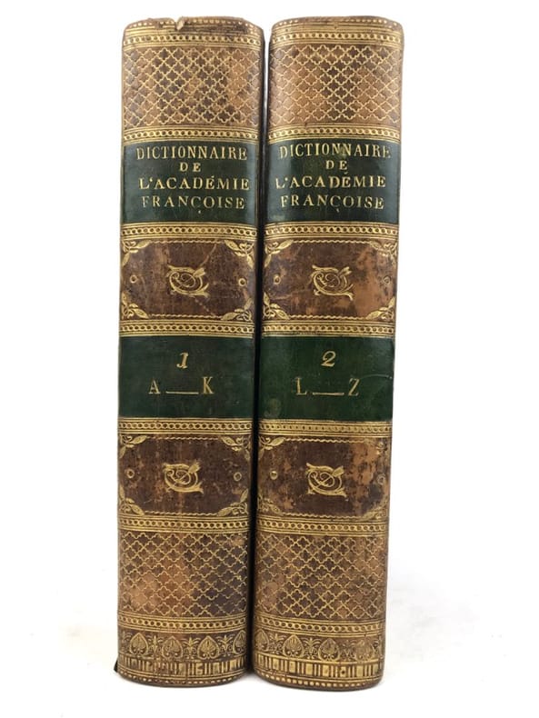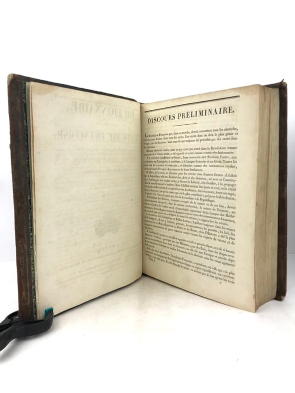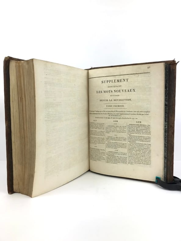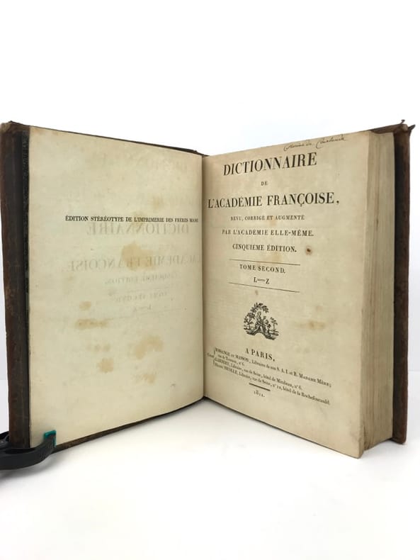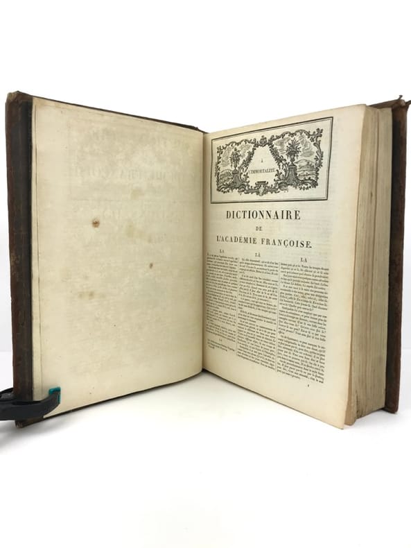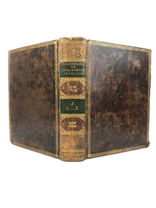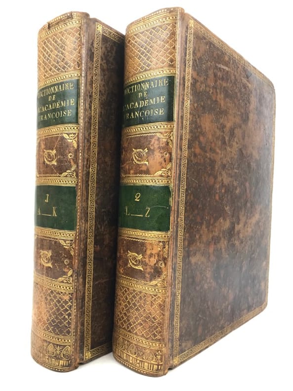 2 volumes in-4 (26 cm x 19,5 cm), veau brun marbré (reliure de l’époque), dos lisse à motifs dorés, pièce de titre et de tomaison verte, roulette dorée en encadrement des plats, ex-libris de Catherine de Courlande manuscrit sur la page de titre, ex-libris contrecollé sur le contreplat. [4]-xii-774 ; [4]-784 pages (complet). Frottements à la reliure, coins émoussés, feuillets brunis. État très correct. Cinquième édition. Selon la tradition, le Dictionnaire de l'Académie avait pour but de donner la définition correcte et l'usage commun des mots français non-techniques. Mais le violent bouleversement politique de la Révolution a troublé cette vision de la fonction du Dictionnaire, et celui-ci a rapidement revêtu une grande signification politique. Dans les débats de l'époque, les politiciens attribuaient une importance considérable au rôle des mots dans la formation de la pensée politique ; le langage de la monarchie était dès lors suspect. Dans beaucoup de cas, il y avait un désir de réforme et de purification linguistiques qui devaient seconder la transformation politique de la nation. Plutôt que de complètement réécrire le Dictionnaire de l'Académie, il a été finalement conclu que la forte influence de l'esprit philosophique parmi les académiciens pendant la deuxième moitié du siècle avait amené des progrès considérables. Ainsi, la 5ème édition a été considérée comme un document de transition entre le langage de l'Ancien Régime et celui de la nouvelle République. Agréable exemplaire.