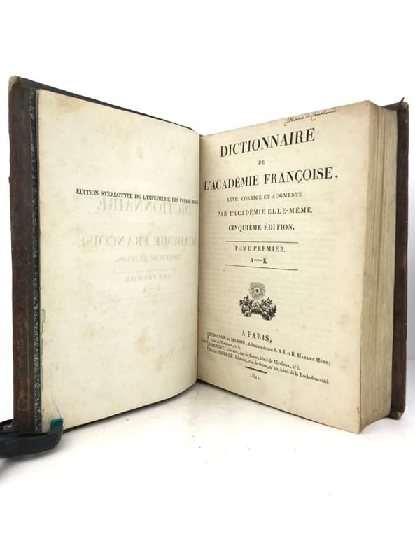 À Paris, chez la veuve de Jean-Baptiste COIGNARD, imprimeur ordinaire du Roy, & de l'Académie françoise, rue S. Jacques, à la Bible d'or, et chez Jean-Baptiste COIGNARD, imprimeur & libraire ordinaire du Roy, rue S. Jacques, près S. Séverin, au Livre d'or 1694 Deux tomes en un fort volume in folio relié en plein veau brun dos à six nerfs ornés en à froid, usures, quelques manques, mors supérieur faible.(2bl), un frontispice allégorique gravé représentant Louis XIV couronné par les muses, titre, 9 ff ; 676pp, (32ff tables, 1bl) ; TII : 671 pp, (23ff tables, 1 bl)Edition Originale du premier dictionnaire de l’Académie Française, dont la gestation dura 60 ans, surmontant des difficultés successives, décès de Vaugelas, troubles de la fronde et bien sûr l’innovation d’une écriture collective. L’Académie parvint enfin à produire cette imposante somme qui devait révolutionner la perception de la langue française. Bien que succédant à deux dictionnaires de la langue, Furetière en 1680 et Richelet en 1690, il est véritablement le livre de référence par lequel la langue française va peu à peu s’imposer dans toute son ampleur. Au XVIIe siècle, l’usage du latin, le dispute au français pour l’établissement de textes officiels, dans un pays de dix-sept millions d’habitant ou seulement trois millions d’entre eux parlent le français. Le dictionnaire de l’académie va devenir le maitre étalon du langage parlé et écrit, et concourir à faire de la France la référence universelle tant en littérature qu’en philosophie. Ce dictionnaire est en fait un monstre, massif, peu maniable il regroupe les mots par racines, ce qui désoriente le lecteur, réorganisé en 1718 selon l’ordre alphabétique, il va au fil des siècles et de ses neuf éditions, rendre compte des subtilités et du génie de notre langue. Devenu fort rare car peu tiré (500 exemplaires), encombrant et obsolète les exemplaires de cette édition originelle sont de nos jours fort recherchés.Agréable exemplaire ayant appartenu à l’académicien Jean Bouhier (1673-1746) élu membre de l’académie en 1727, exlibris armorié, ainsi qu’un exlibris imprimé et manuscrit « Trembley », et un ex-dono à l’ami Boudeille.