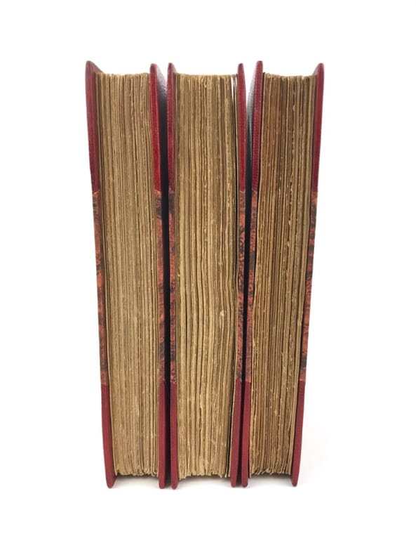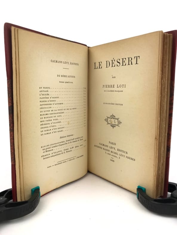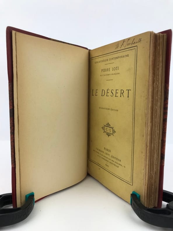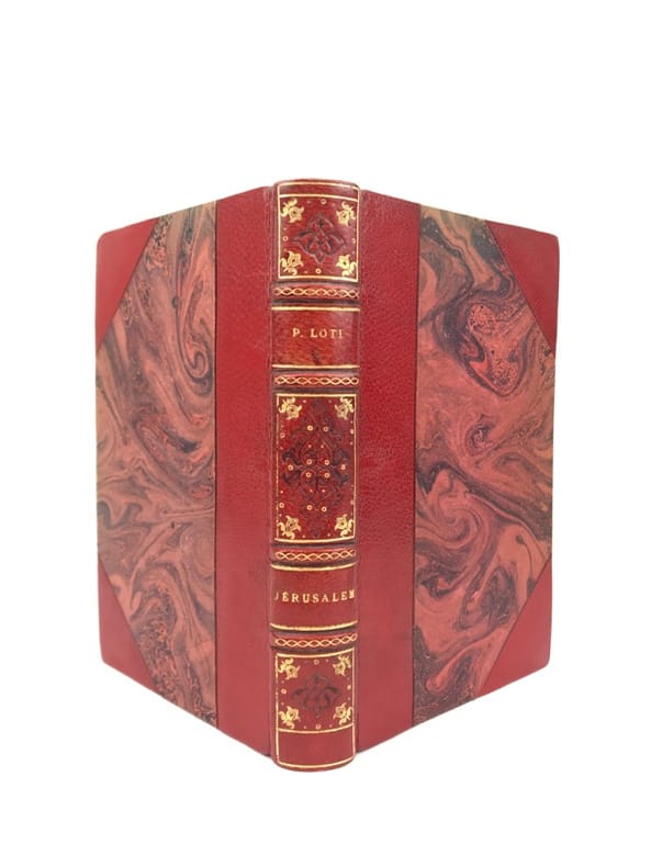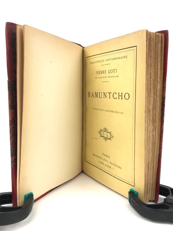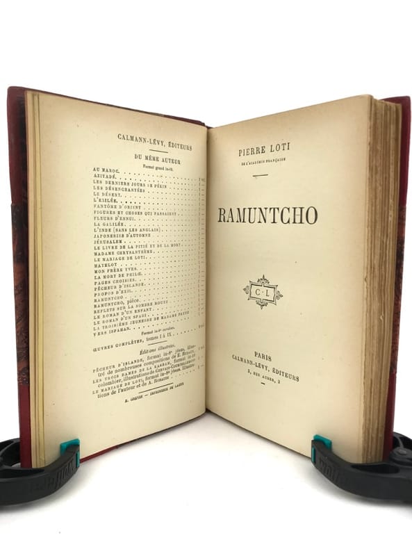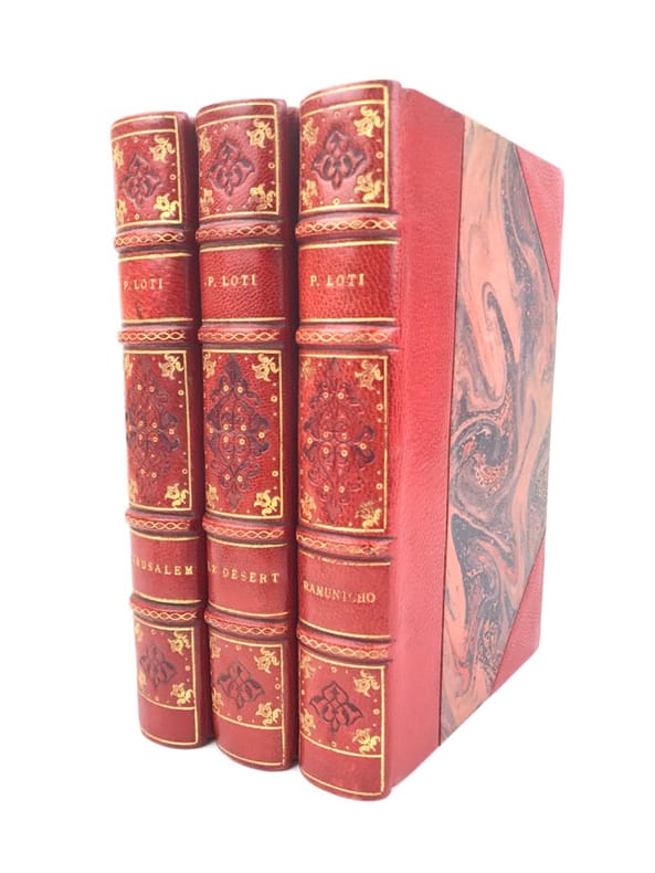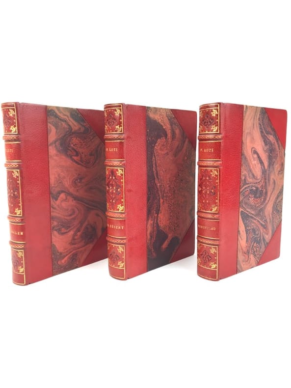 3 volumes in-8 (18 x 11,5 cm), demi maroquin rouge à coins (reliure de l’époque), couverture conservée, dos à nerfs orné et estampé à froid), tranche de tête dorée, ex-libris manuscrit de M. F. Imbault, [8]-351-[1] ; [6]-258 ; [6]-220-[2] pages (complet). Quelques rousseurs. État très correct.Nouvelles éditions de ces trois ouvrages rédigés par Pierre Loti (1850-1923), né Louis-Marie-Julien Viaud, écrivain et officier de marine français. La plupart de ses œuvres naît de ses propres expériences, de sa vie privée, ou encore de ses voyages : il évoque par exemple le Pays basque au sein de Ramuntcho. Agréables exemplaires.