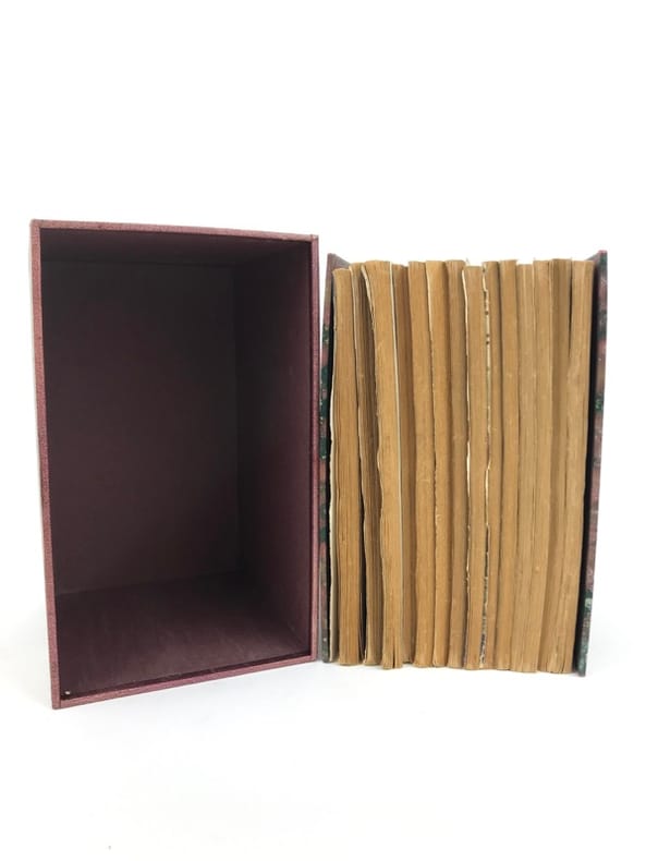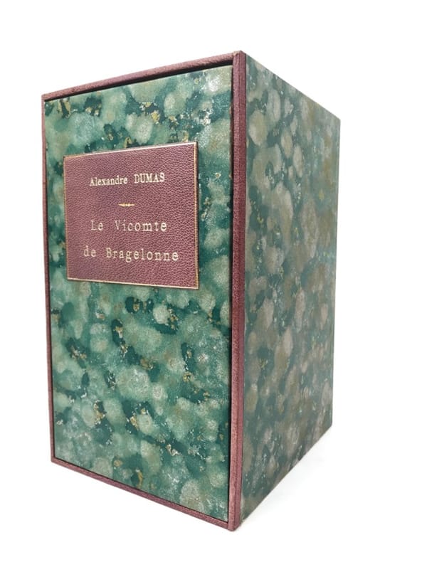 14 feuilletons in-12 (18 cm x 12 cm), broché sous jaquette et étui marbrés vert et rose, pièce de titre rose. 128 ; 129 à 256 ; 257 à 384 , 385 à 512 ; 513 à 640 ; 641 à 768 ; 769 à 896 ; 897 à 1024 ; 1025 à 1152 ; 1153 à 1280 ; 1281 à 1408 ; 1409 à 1536 ; 1537 à 1664 ; 1665 à 1792 pages (complet). Couverture frottée et partiellement détachée du dos, feuillets brunis. État très correct tout de même. Nouvelle édition. Le Vicomte de Bragelonne parut d’abord en feuilleton dans Le Siècle du 20 octobre 1847 au 12 janvier 1850 avec quelques interruptions. La première édition en librairie fut publiée en 26 volumes in 8° de 1848 à 1850 chez Michel Lévy. Le roman fait suite aux Trois mousquetaires et à Vingt ans après, alors que D'Artagnan, toujours mousquetaire, a 50 ans, Athos et Porthos se sont retirés, chacun sur ses terres et Aramis, de plus en plus puissant, est évêque de Vannes. Plaisant exemplaire. Vendu 02/10/2025