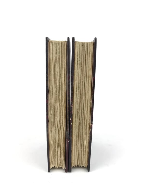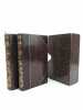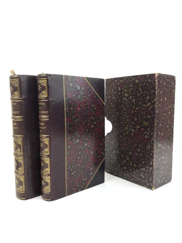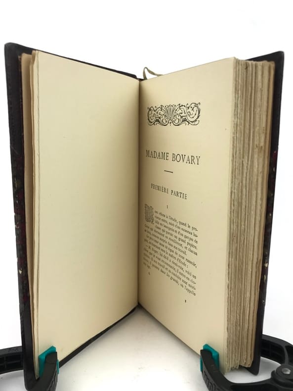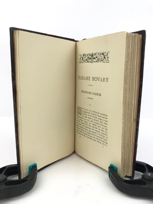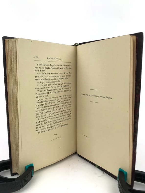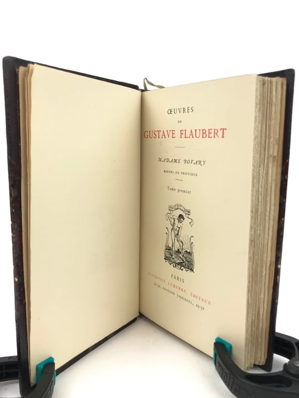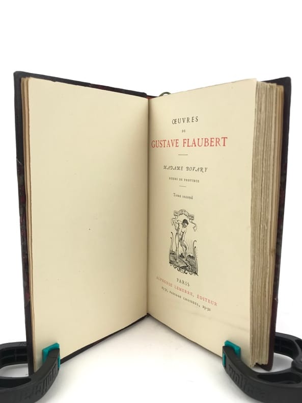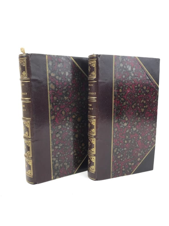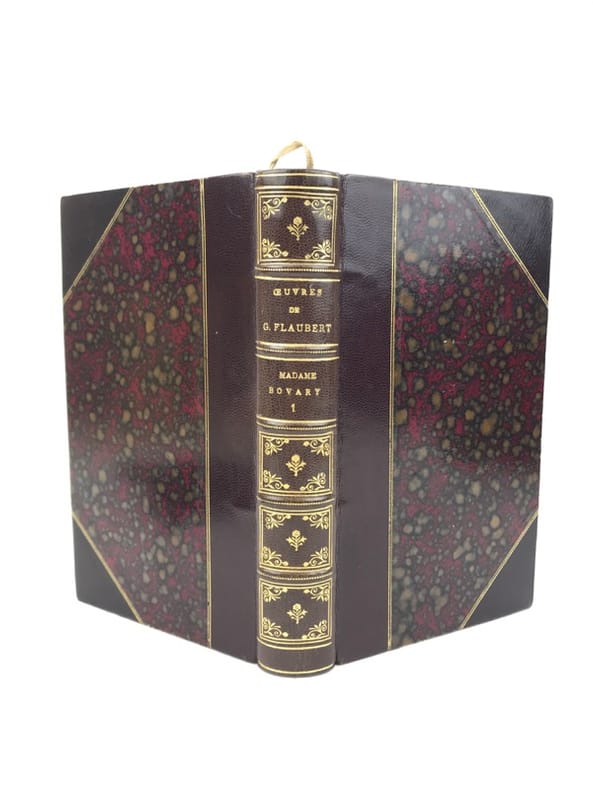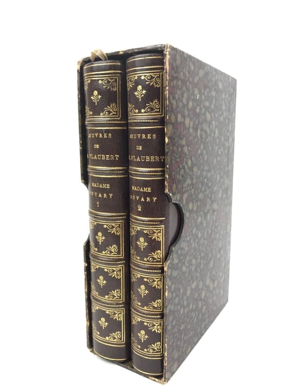 2 volumes in-16 (15,5 x 9 cm), demi basane aubergine à coins (reliure de l’époque), sous étui, dos à nerfs orné, double filet doré en bordure, tranche de tête dorée, titre en rouge et noir, [6]-252-[2] ; [4]-278-[2] pages (complet). Étui frotté. État très correct. Nouvelle édition. Œuvre emblématique de la littérature française, Madame Bovary paraît en 1857, et est alors attaquée par le procureur de Paris du Second Empire pour immoralité et obscénité. L’affaire fit beaucoup de bruit, et permit à Gustave Flaubert, très vite acquitté, d’acquérir une nouvelle renommée certaine. Agréable exemplaire.