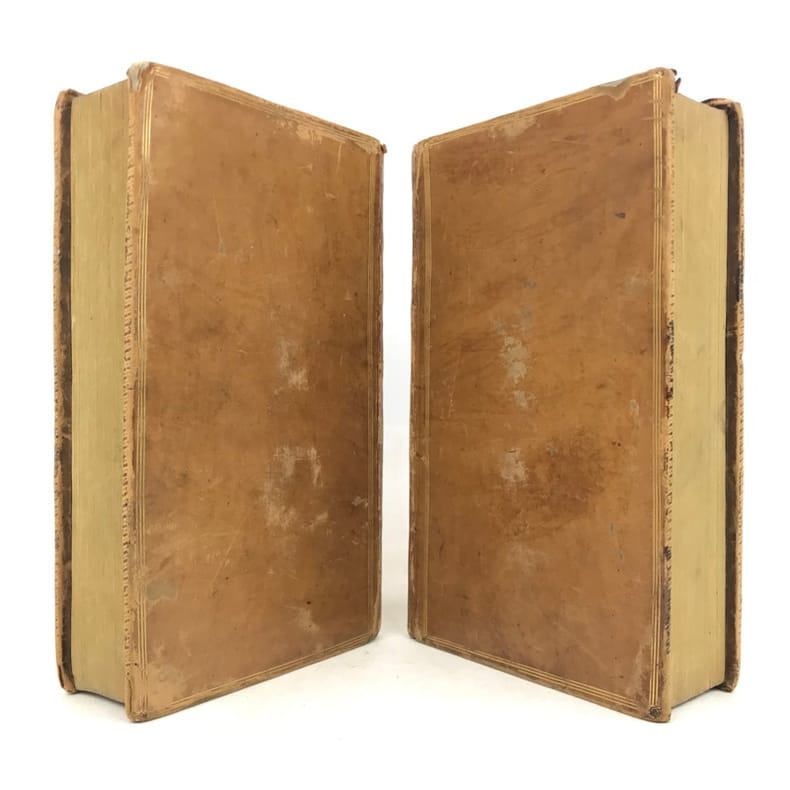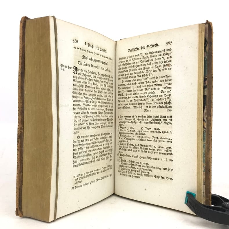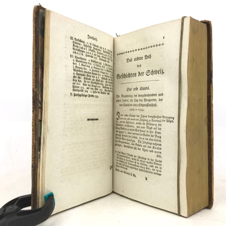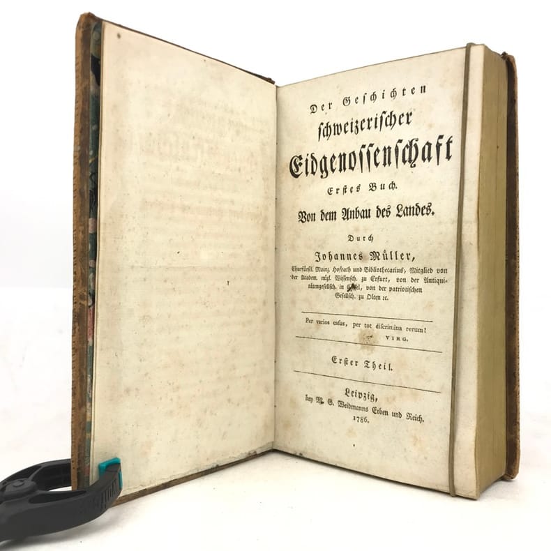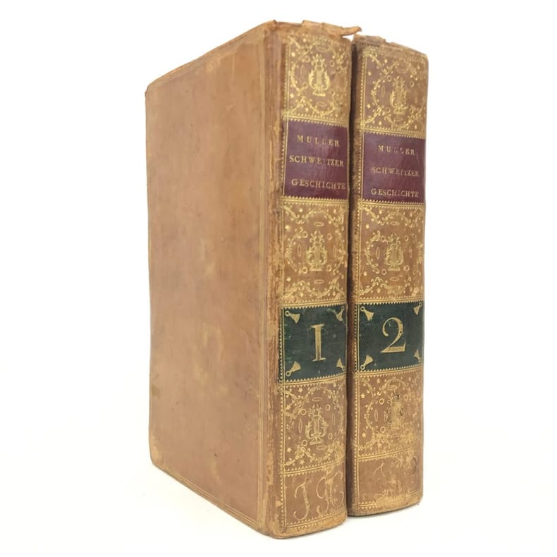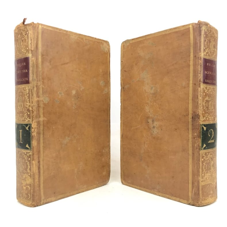 2 volumes (sur 5) in-8 (20,8 x 12 cm), veau blond (reliure de l’époque), dos lisse à riche décor aux petits fers, chiffre en pied (J. G. C.), pièces de titre de maroquin rouge et de tomaison vert, triple filet doré encadrant les plats, roulette doré sur les coupes, texte en allemand en caractères gothiques. xl-614-[2] ; [12]-740-[2] pages. Manque les 3 derniers volumes. Couvrure frottée, coiffes accidentées, coins émoussés, rousseurs éparses. État correct. ÉDITION ORIGINALE de cette histoire de la Suisse, parue de 1786 à 1808, véritable grand œuvre de son auteur. Johannes von Müller (1752-1809) est un historien suisse. Après des études de théologie et parallèlement à divers emplois de bibliothécaire, pour le prince-évêque de Mayence ou l’empereur d’Autriche François Ier, Müller publie son unique grande œuvre : l’Histoire de la Suisse. En 1806, après avoir rencontré Napoléon, il est nommé secrétaire d’État pour le royaume de Westphalie. Son Histoire universelle fut publiée après sa mort par son frère. Bon exemplaire.
