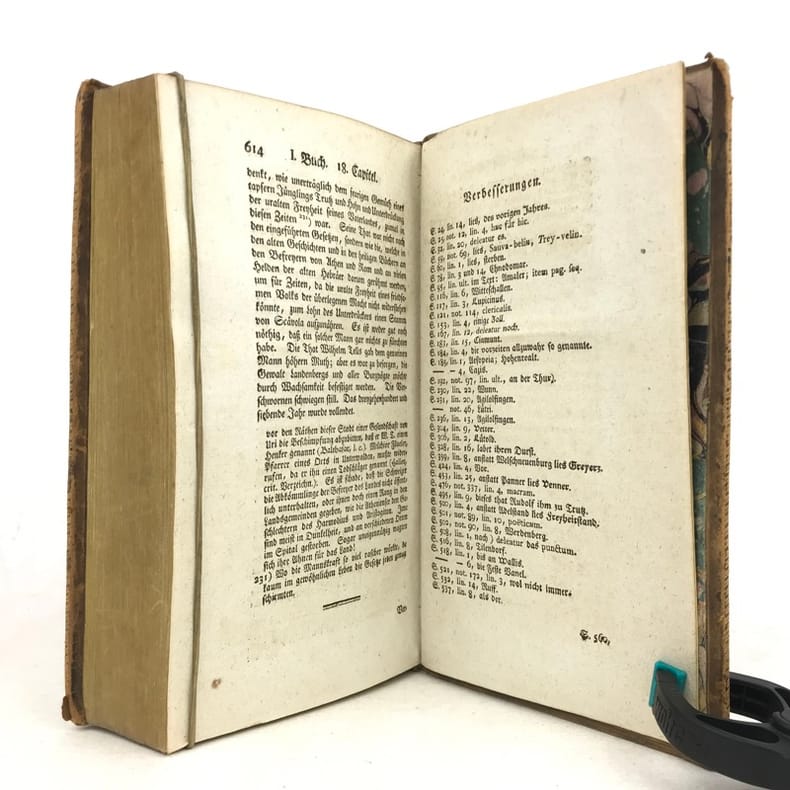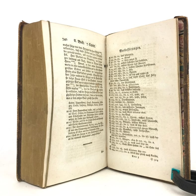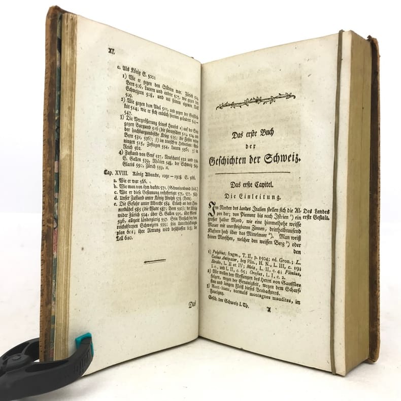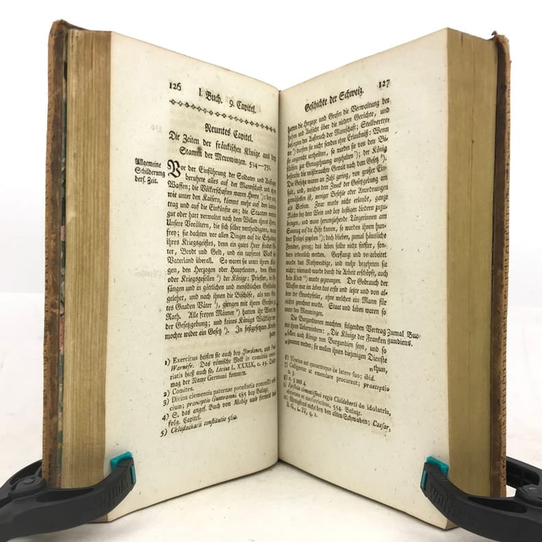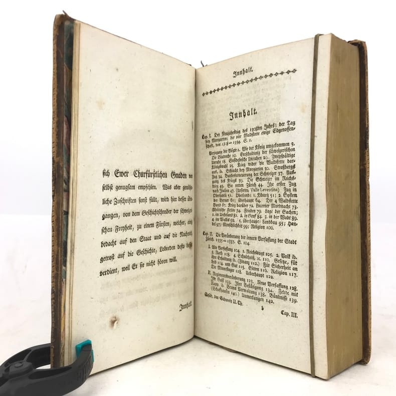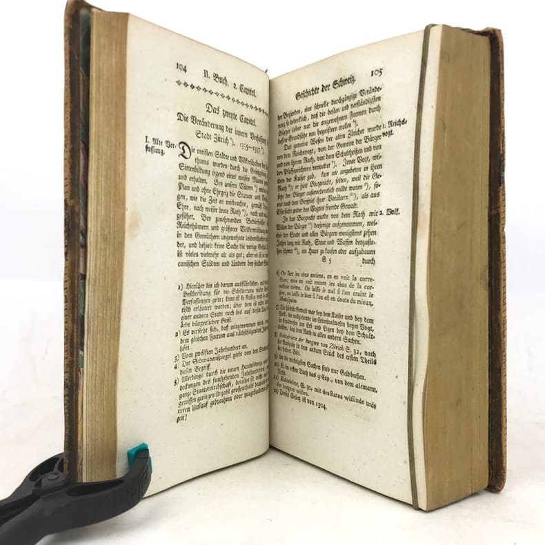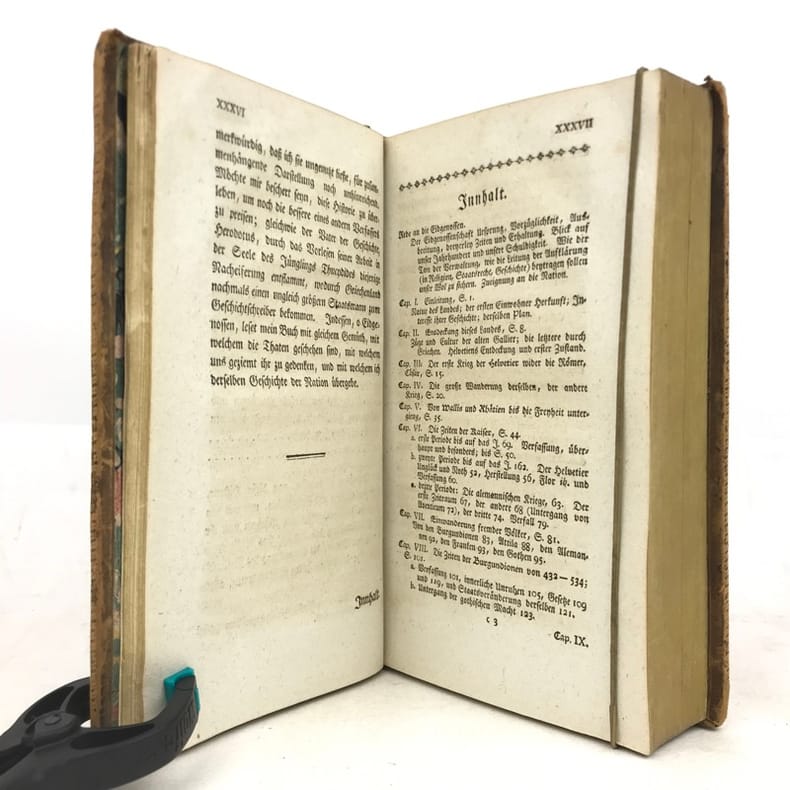 2 volumes (sur 5) in-8 (20,8 x 12 cm), veau blond (reliure de l’époque), dos lisse à riche décor aux petits fers, chiffre en pied (J. G. C.), pièces de titre de maroquin rouge et de tomaison vert, triple filet doré encadrant les plats, roulette doré sur les coupes, texte en allemand en caractères gothiques. xl-614-[2] ; [12]-740-[2] pages. Manque les 3 derniers volumes. Couvrure frottée, coiffes accidentées, coins émoussés, rousseurs éparses. État correct. ÉDITION ORIGINALE de cette histoire de la Suisse, parue de 1786 à 1808, véritable grand œuvre de son auteur. Johannes von Müller (1752-1809) est un historien suisse. Après des études de théologie et parallèlement à divers emplois de bibliothécaire, pour le prince-évêque de Mayence ou l’empereur d’Autriche François Ier, Müller publie son unique grande œuvre : l’Histoire de la Suisse. En 1806, après avoir rencontré Napoléon, il est nommé secrétaire d’État pour le royaume de Westphalie. Son Histoire universelle fut publiée après sa mort par son frère. Bon exemplaire.