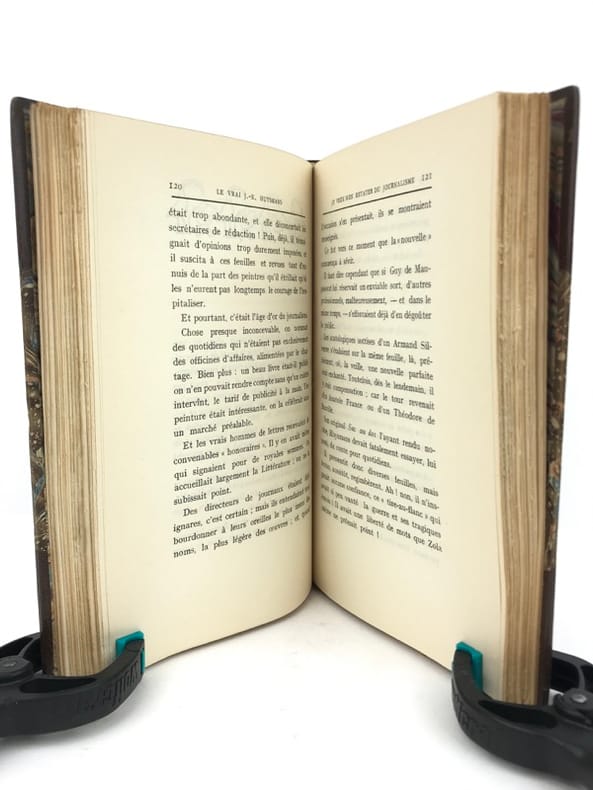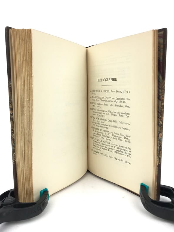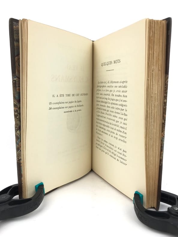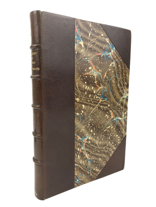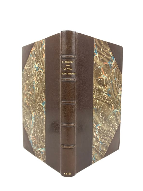 1 volume in-12 (18,5 x 11,5 cm), demi-chagrin marron à coins (Reliure de l’époque, signée Stroobants), dos à nerfs, tête dorée, couverture et dos conservés. [4]-246-[2] pages (complet). Très bon état. ÉDITION ORIGINALE de cette biographie sur Joris-Karl Huysmans (1848-1907); illustrée d’un portrait-frontispice gravé sur cuivre par J.-F. Raffaëlli, et de vignettes et ornements gravés sur bois, dessinés par Lucien Laforge. Préface de Huysmans en fac-similé du manuscrit. Bel exemplaire.