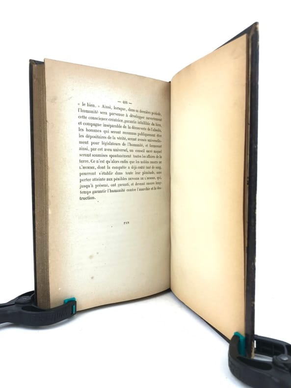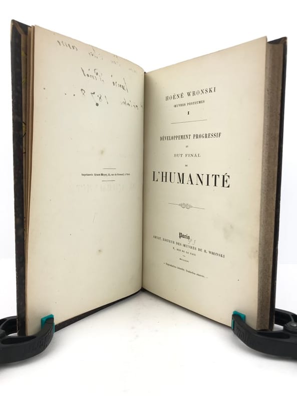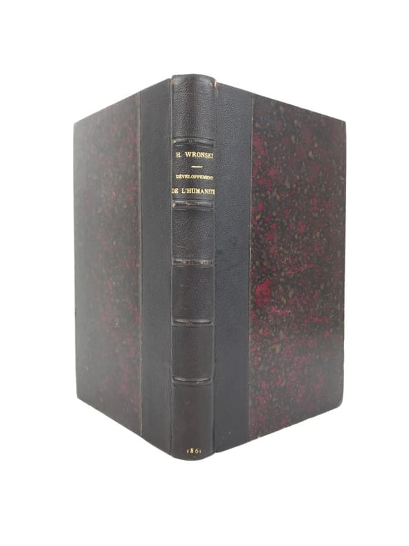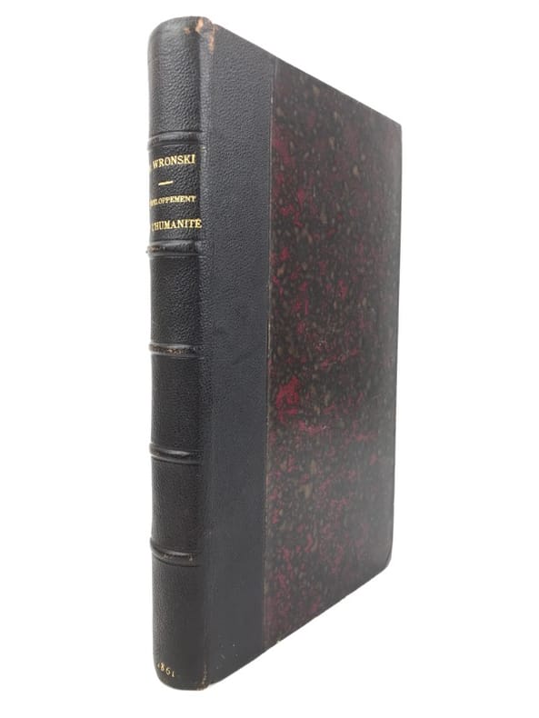 1 volume in-8 (21,3 x 13,3 cm), demi-chagrin bordeaux (reliure de l’époque), dos à nerfs. xv-1bl.-416 pages (complet). Quelques frottements aux coiffes, sur les chants et sur les coins. Rousseurs éparses à quelques feuillets sans gêne de lecture. Bon état. TRÈS RARE ÉDITION ORIGINALE POSTHUME. Exemplaire portant un ex-dono manuscrit à l’encre noire sur le faux-titre : "à mon bien cher ami / Henri Pinet / 1er octobre 1878". Józef Hoene-Wro ski (1776-1853), mathématicien, technicien, philosophe, mystique, etc., ses travaux touchent aussi bien la politique, la religion et la philosophie que les sciences et l'industrie. Son but était une « Réforme du savoir humain » comprenant aussi bien la théorie du mouvement spontané que l'art de gouverner. Bon exemplaire.