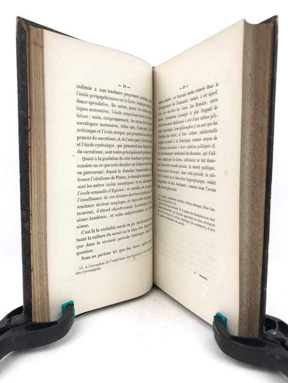 "Oeuvres posthumes I." - Caillet 11500. - Erste Ausgabe. - Herausgegeben aus den nachgelassenen Unterlagen von der Witwe des 1853 verstorbenen Philosophen und Mathematikers. Hoëne, Mitbegründer des polnischen Messianismus, verbrachte die meiste Zeit seines Lebens in Frankreich und verfasste seine Werke ausschliesslich in französischer Sprache. In seiner Geschichtsphilosophie bildet die Gegenwart die letzte Geschichtsepoche, an deren Ende der Messianismus die Verwirklichung der absoluten Vernunft bewirkt. "Aber man kann nicht leugnen, dass er ein origineller Denker war, dessen Werke eine Fundgrube von interessanten Gedanken bleiben" (Ueberweg/Heinze V, S. 314). - Einband fleckig und berieben. Stellenweise schwach fleckig. Handschriftlicher Besitzvermerk auf dem Vortitel. S. 52 mit Notizen von alter Hand. S. 366-378 mit feinen roten Unterstreichungen. - "Oeuvres posthumes I." - Caillet 11500 - Première édition. Publié à partir des documents légués par la veuve du philosophe et mathématicien, co-fondateur du messianisme polonais, qui mourut en 1853 et passa la plus grande partie de sa vie en France, écrivant ses œuvres exclusivement en français. Dans sa philosophie de l'histoire, le présent est la dernière période de l'histoire, à la fin de laquelle le messianisme entraîne la réalisation de la raison absolue. "Mais on ne peut pas nier qu'il était un penseur original, les œuvres mangent restent un trésor de pensées intéressantes" (Ueberweg/Heinze vol. 5, p. 314). - Couverture tachée et frottée. Faibles rousseurs. Note manuscrite de propriété sur le prétitre. Anciennes notations à la page 52. Soulignements en rouge aux pages 366-378.