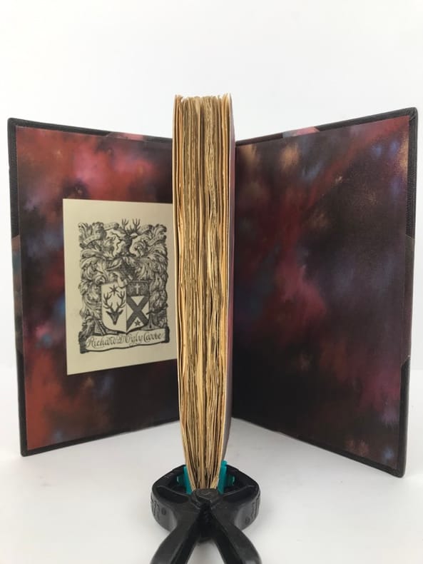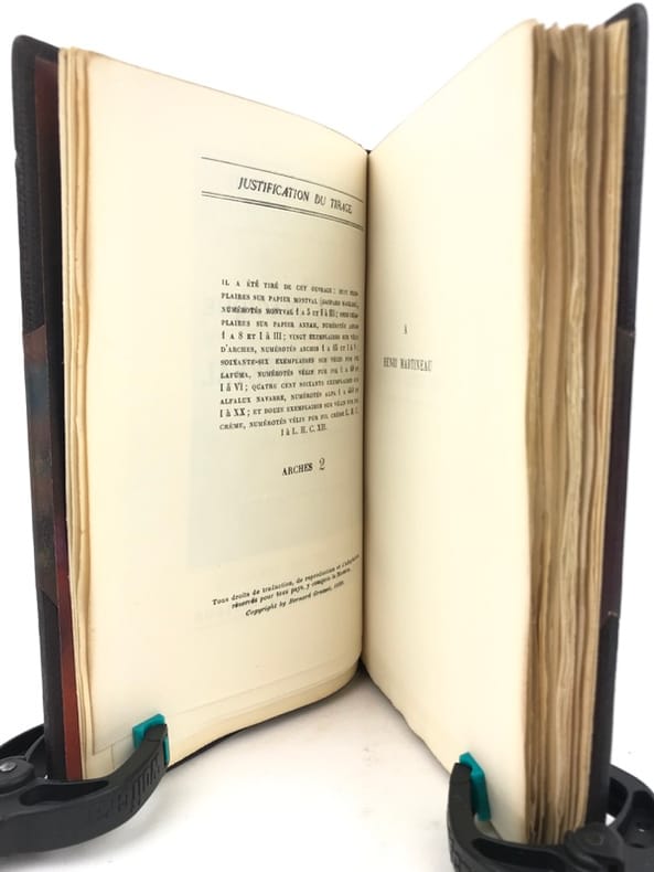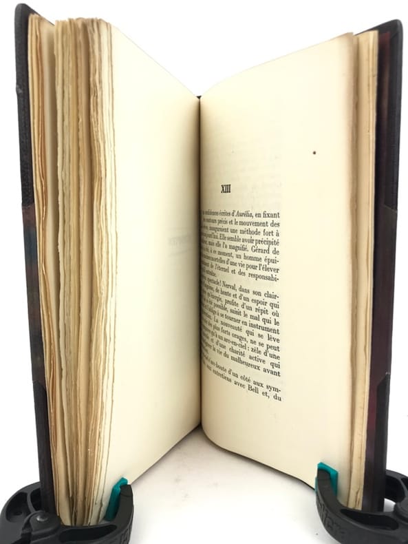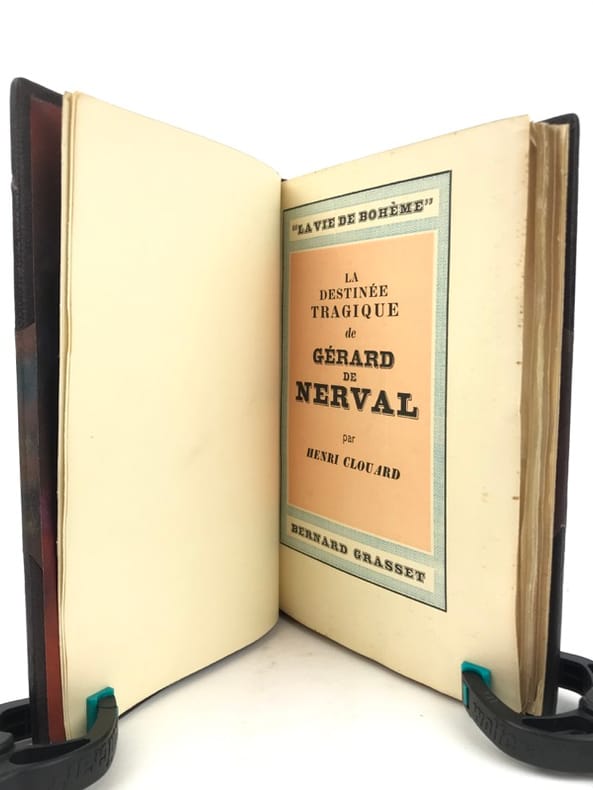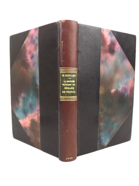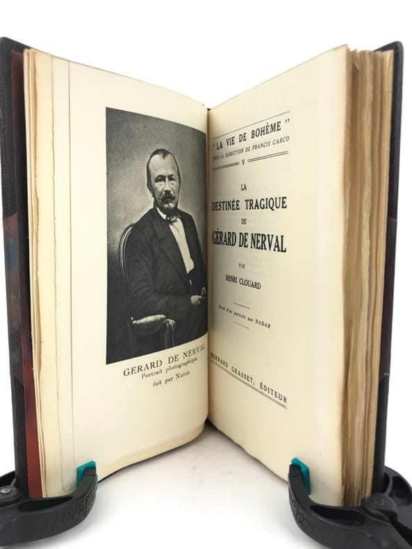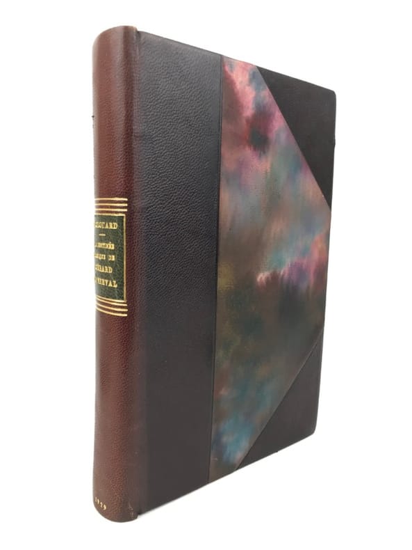 1 volume in-8 (19,5 x 13 cm), demi chagrin aubergine (reliure signée Van West), couverture et dos conservés, dos lisse orné, pièce de titre en maroquin olive, filet à froid en bordure, tranche de tête dorée, tranches non ébarbées, ex-libris aux armes de Richard d’Oyly Carte, xii-254-[4] pages (complet). Dos légèrement insolé. État très correct. ÉDITION ORIGINALE, avec une photographie de Nerval en frontispice, prise par Nadar. Le tirage de cette édition a été limité, entre autres, à 20 exemplaires sur vélin d’Arches, numérotés “Arches 1 à 15” et I à V (exemplaire “Arches 2”). Henri Clouard (1885-1974) est un journaliste, critique littéraire et traducteur français. Il retrace ici le parcours de Gérard de Nerval (1808-1855), écrivain romantique français, et en particulier la fin de sa carrière littéraire, avant son suicide. Agréable exemplaire.