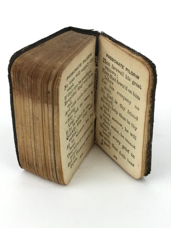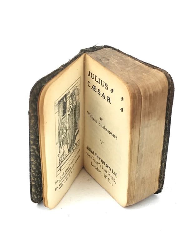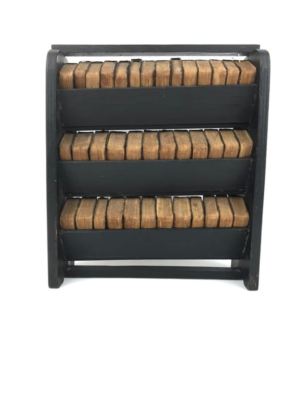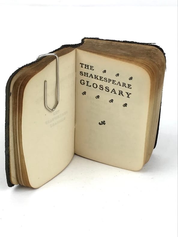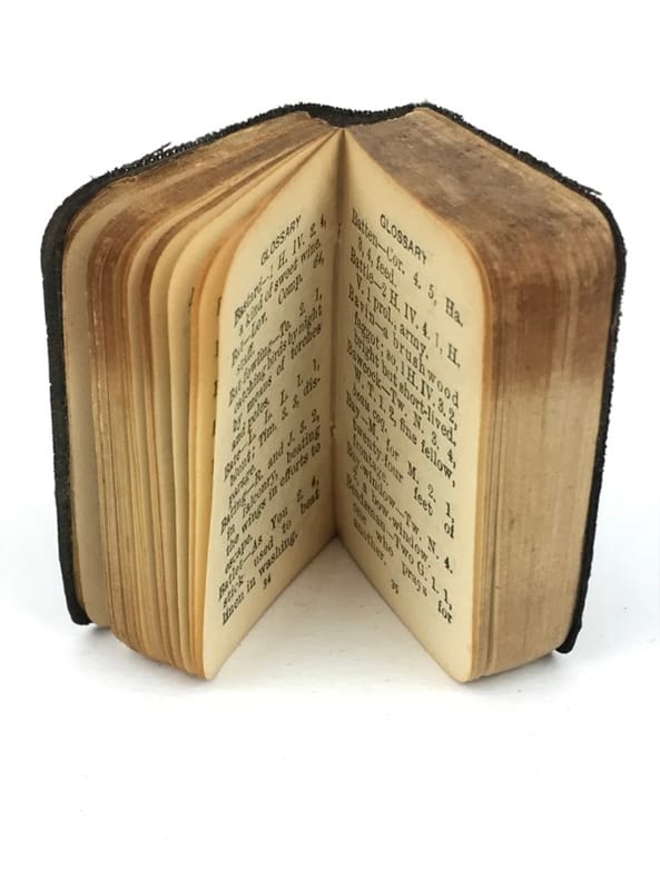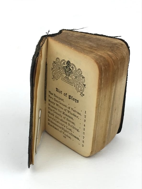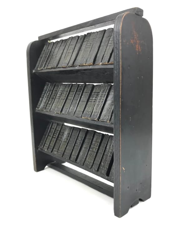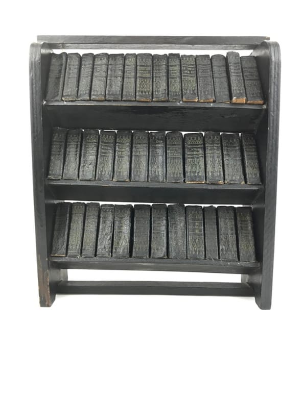 38 volumes (sur 41 et non 40, car un est ici présent en double) minuscules (5 x 3 cm) dans une bibliothèque en bois peinte en noir, cuir moderne noir, dos lisse estampé à froid, un volume en double : King Henry VI 3rd part, et trois volumes manquants : Merchant of Venice, King Henry IV 2nd part et Troilus and Cressida, un volume démis de sa reliure, quelques rousseurs. État très correct tout de même. Nouvelle édition des œuvres théâtrales de Shakespeare, communément appelée le “Vest-Pocket Shakespeare Set”. Chaque pièce est illustrée d’un frontispice. Au début de chaque volume de cet ensemble figure la mention « soigneusement édité avec les meilleurs textes ». Voici le détail des pièces présentes : The Tempest, Two Gentlemen of Verona, Merry Wives of Windsor, Measure for Measure, Comedy of Errors, Much ado about Nothing, Love’s Labour’s Lost, Midsummer Night’s Dream, As You Like It, Taming of the Shrew, All’s Well That Ends Well, Twelfth Night, Winter’s Tale, King John, King Richard II, King Henry IV 1st part, King Henri V, King Henry VI 1st part, King Henry VI 2nd part (en deux exemplaires identiques), King Henry VI 3rd part, King Richard III, King Henry VIII, Coriolanus, Titus Andronicus, Romeo and Juliet, Timon of Athens, Julius Caesar, Macbeth, Hamlet Prince of Denmark, King Lear, Othello the Moor of Venice, Antony and Cleopatra, Cymbeline, Pericles Prince of Tyre, Venus and Adonis - The Rape of Lucrece, Sonnets et enfin un volume de glossaire. Curieux et très agréable ensemble.