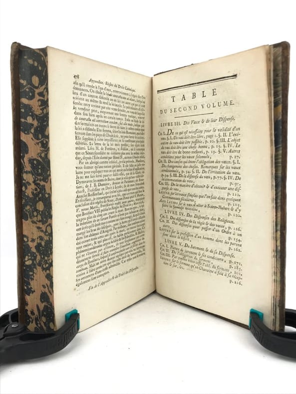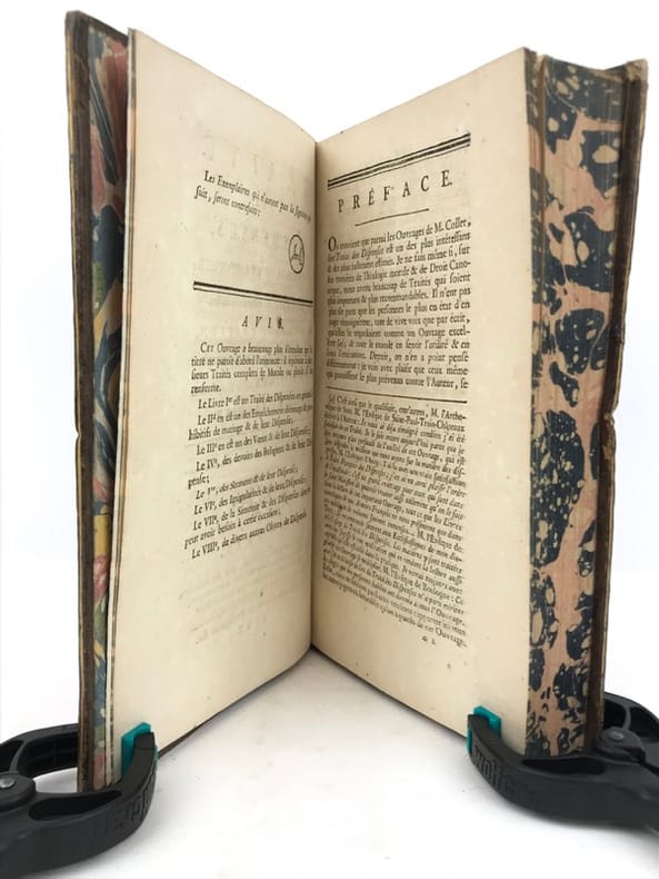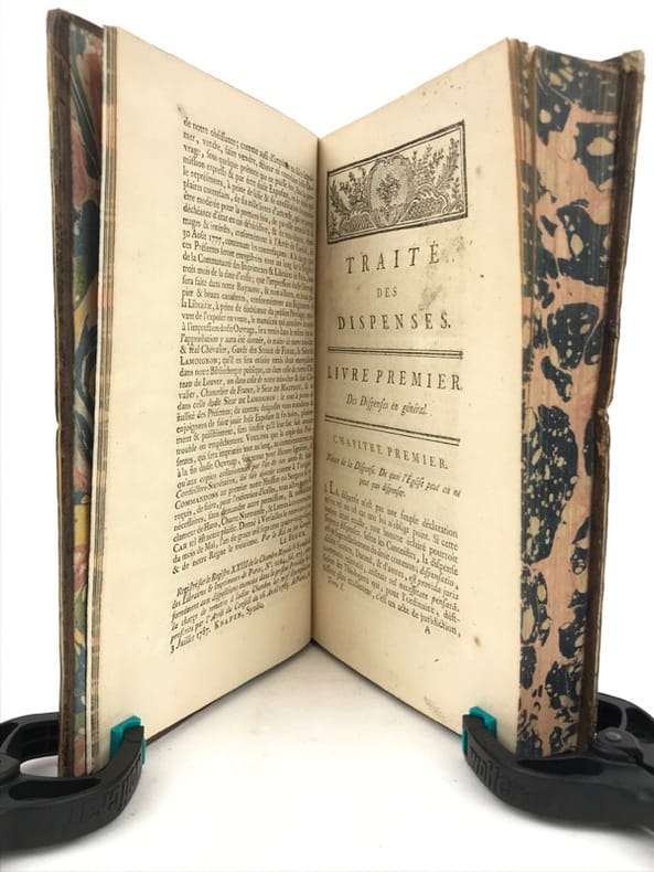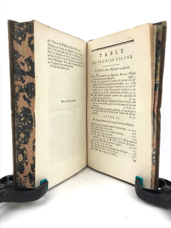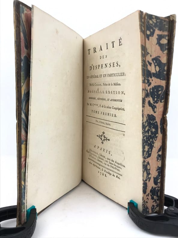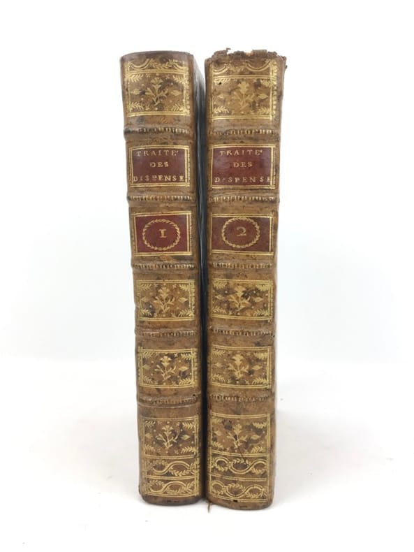 2 volumes in-8 (19,5 x 12 cm), veau marbré (reliure de l’époque), dos à nerfs orné, pièces de titre et de tomaison en maroquin grenat, filet à froid encadrant les plats, filet doré sur les coupes, tranches marbrées, vi-[2]-462 ; [2]-480 pages (complet). Coins frottés, quelques rares rousseurs. État très correct tout de même. Nouvelle édition. Pierre Collet (1693-1770) est un théologien Lazariste, supérieur du séminaire Saint-Firmin à Paris et également professeur de théologie. Il rédige ici un traité mêlant théologie et droit canonique, et développe tous les cas de dispense existant : empêchements au mariage, à un vœu monacal, aux devoirs de la vie religieuse, etc. Agréable exemplaire.