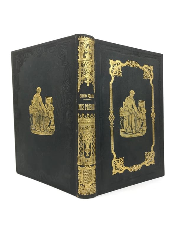 1 volume grand in-8 (26 x 18 cm), cartonnage éditeur, dos lisse avec motif romantique doré, décor à la plaque dorée sur les plats, tranches dorées, ex-libris manuscrit, xxii-[2]-335-[1] pages (complet). Rousseurs. État correct. Nouvelle édition, illustrée d’un portrait de l’auteur en frontispice, d’un titre gravé, et de nombreuses vignettes in-texte. De plus, une page de texte (37-38) est présente en double. Silvio Pellico (1789-1854) est un écrivain et poète italien. Il publie ses mémoires pour la première fois en 1832, après dix ans passés en prison en Moravie, au sein de la forteresse du Spielberg. Il y narre sa détention, après avoir été arrêté pour conspiration, le 13 octobre 1820, condamné à mort, puis gracié par l’empereur. Il partage sa détention avec Piero Maroncelli, également auteur. L'œuvre connut un tel succès auprès des contemporains de l'écrivain qu'elle devint le livre italien le plus célèbre et le plus lu en Europe au XIXe siècle.