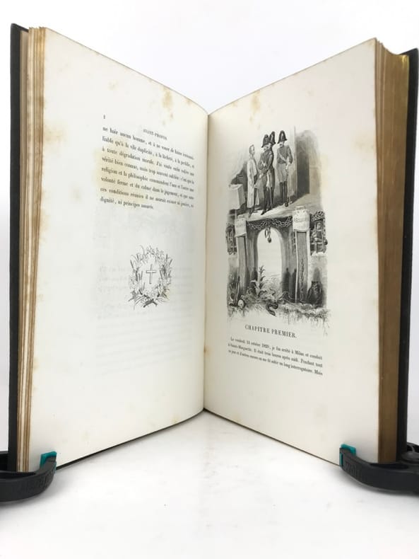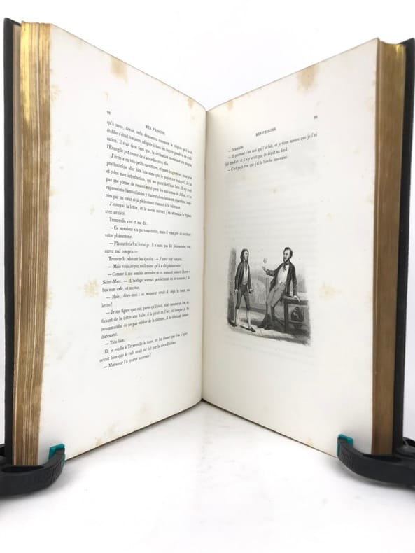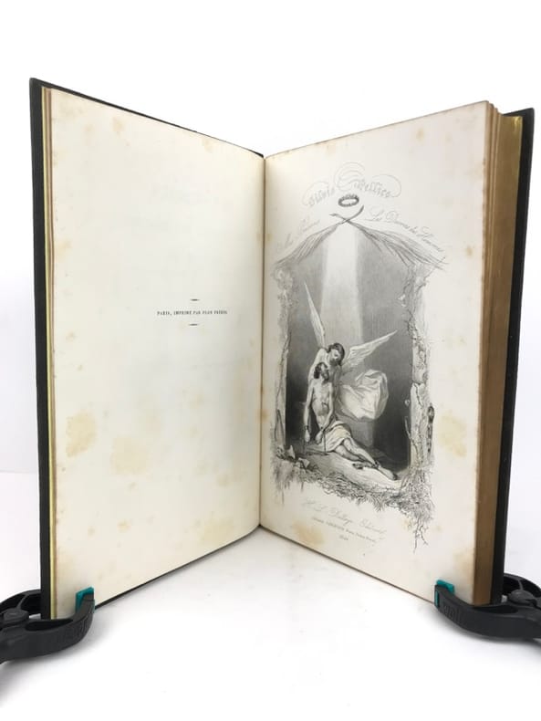 Traduction nouvelle par le comte H. de Messey, revue par le vicomte Alban de Villeneuve. Avec Notice biographique et littéraire sur Silvio Pellico et ses ouvrages par Philipon de La Madelaine. Édition illustrée d'après les dessins de MM. Gérard Séguin, D'Aubigny, Steinheil, etc., etc. Paris. Delloye. 1844. Gd in-8 (190 x 271mm) dos à 5 nerfs violet foncé, filets, caissons et titre or, plats et gardes marbrées, tête dorée, XXII (fx-titre, titre, préface et notice) et 335 pages. Portrait de Silvio Pellico et frontispice gravé hors texte, nombreuses vignettes sur acier ou sur bois dans le texte. 1°tirage des illustrations. Cette édition a été réimprimée en 1846 avec des changements notables dans les illustrations (Vicaire VI, 515 pour tous les détails). Très bel exemplaire à grandes marges malgré un léger affaiblissement des mors dans leur partie supérieure (3cm), exempt de rousseurs. Rare, surtout dans cet état.