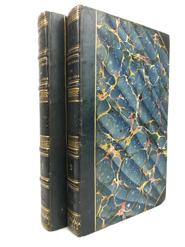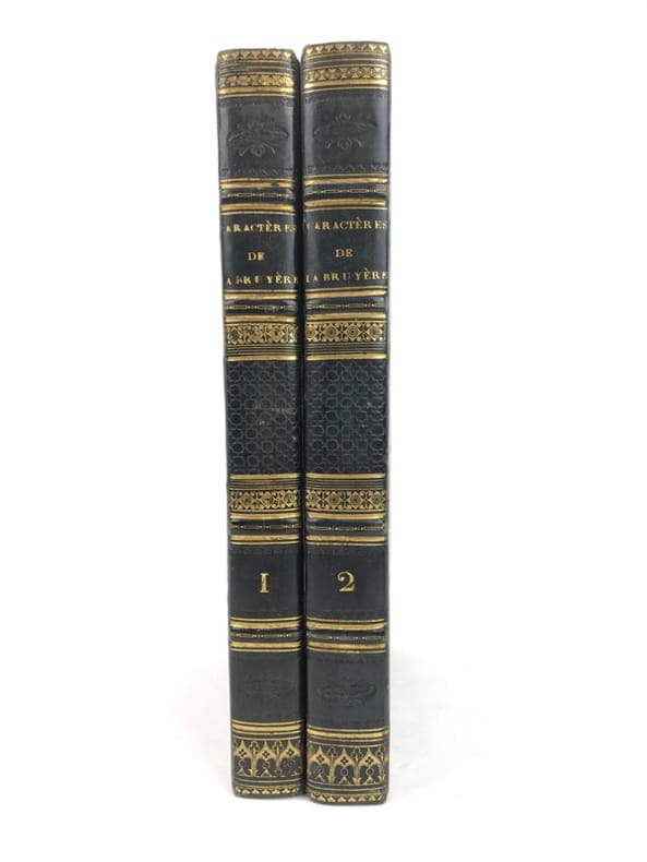2 volumes in-8 (22 cm x 13 cm), demi-veau bleu à coins (reliure de l’époque), dos à nerfs orné, [4]-4-v à xxvi-1 bl.-[1]-356 ; [4]-424-[2] pages (complet). Frottements à la reliure, rousseurs éparses. État très correct. Nouvelle édition. C’est à l'abri d'une traduction anonyme d’un auteur grec, Théophraste, que va se révéler et se développer un des textes les plus fascinants du XVIIe siècle français. La Bruyère avait commencé la rédaction de « caractères » dès 1670, observant finement les mœurs de son époque. En 1688, paraît chez le libraire Michallet Les Caractères de Théophraste, avec les caractères ou les mœurs de ce siècle : 420 remarques, relevant du genre à la mode qu’est la « maxime », une quarantaine de jugements littéraires ou de réflexions, et une douzaine de portraits, souvent très brefs. Le livre devient l’emblème du débat entre les Anciens et les Modernes, puisqu'il associe cent pages de traduction de Théophraste et deux cents pages de La Bruyère. Le succès est tel que les éditions se succèdent à un rythme accéléré (neuf en huit ans), chacune voyant se réduire proportionnellement et typographiquement la part de l'Ancien, et s'étoffer, s'organiser, s'affirmer celle du Moderne. Agréable exemplaire.