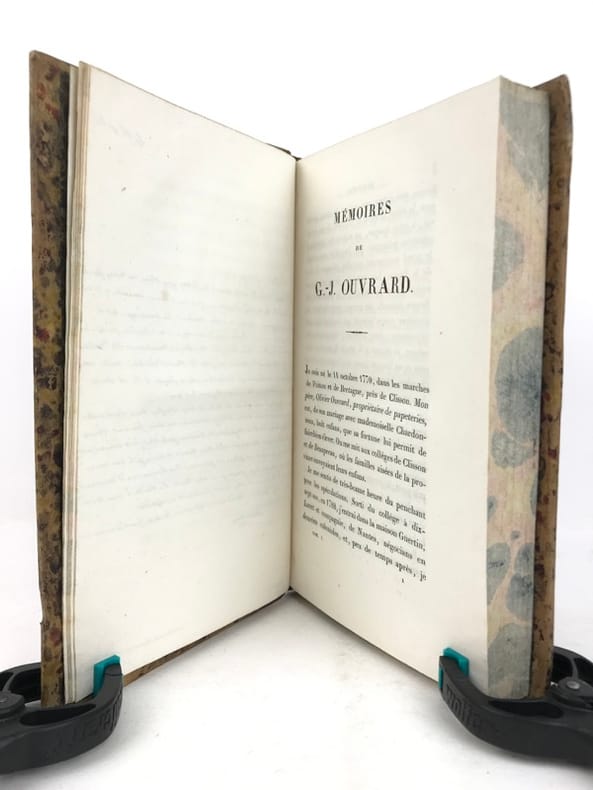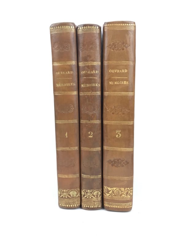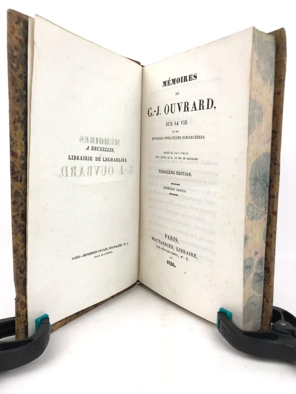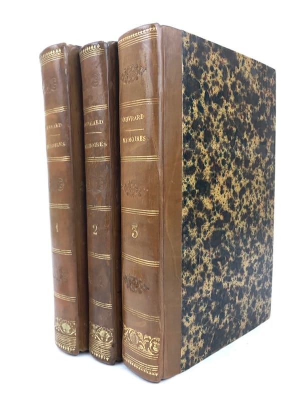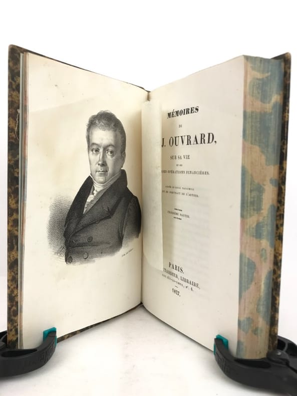 Tulard 1109 : « Mémoires décevants si l'on en attend d'importantes révélations bancaires sur la période, mais riches en portraits (Barbé-Marbois, Barras, Fouché) et en détails curieux sur les opérations financières relatives aux campagnes napoléoniennes. On lira particulièrement le chapitre sur Waterloo. Mais on n'oubliera pas qu'il s'agit d'un plaidoyer et que les chiffres avancés par Ouvrard ne correspondent pas aux chiffres officiels. » Le portrait manque ; 2 fac-similés dont 1 dépliant. Mention de quatrième édition au tome I, de troisième édition au tome II, de deuxième édition au tome III. Bel exemplaire.