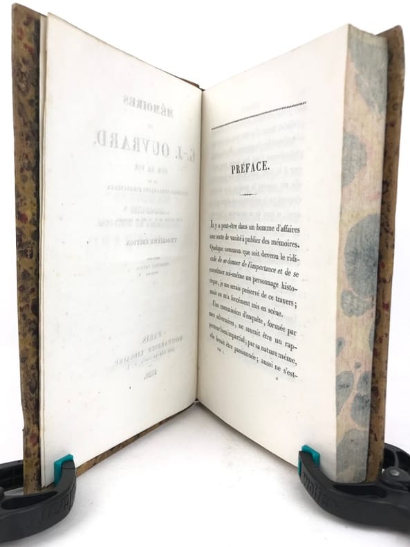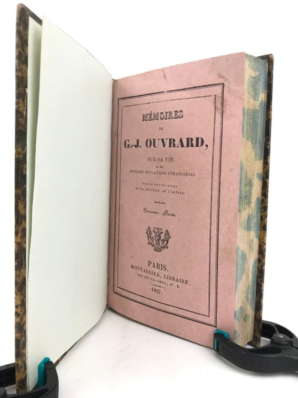 3 volumes in-8 (20,5 cm x 12 cm), demi-veau fauve (reliure de l’époque), dos lisses à filets dorés, fleurons à froid aux dos, fleurons différents sur le tome III, tranches marbrées, couverture conservée au tome III, le tome III ne porte pas la mention de troisième édition. xv-1 bl.-365-1 bl. ; [4]-368 ; [4]-412-[4] pages (complet). Rares rousseurs. Bon état. Troisième édition illustrée de deux fac-similés ainsi que d’un portrait de l’auteur au tome III. Gabriel-Julien Ouvrard, (1770-1846), est un financier français. Homme d'affaires, munitionnaire de la marine et créancier du Directoire, il fut disgracié d'abord par Bonaparte, redevint le banquier du gouvernement puis, comme fournisseur des armées, gagna une énorme fortune. Il fit faillite en 1807 et fut emprisonné de 1809 à 1813. Il aida plus tard, en 1817, le duc de Richelieu à régler les indemnités de guerre, mais ses fraudes dans les fournitures à l'expédition d'Espagne en 1823 lui valurent encore un procès et de la prison. Agréable exemplaire.