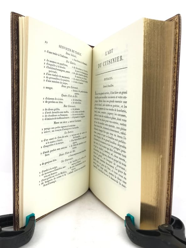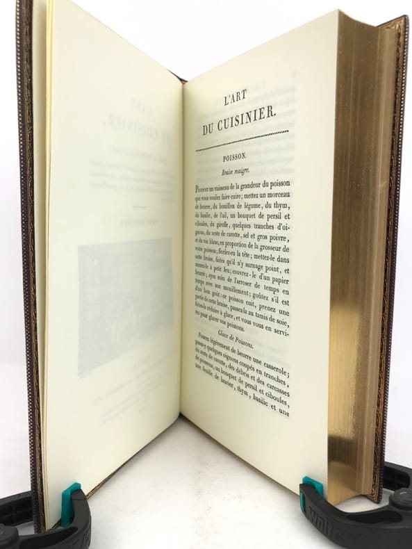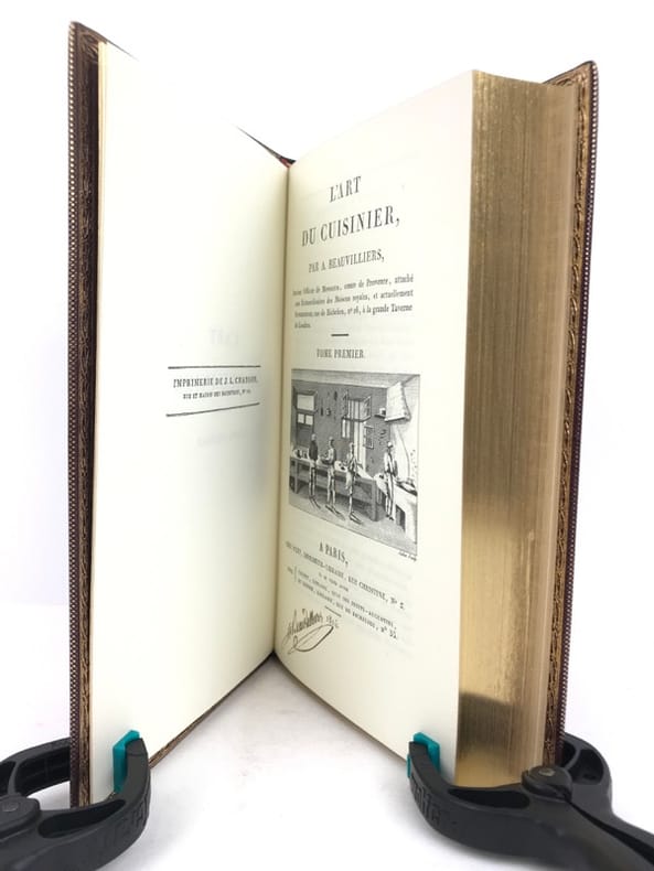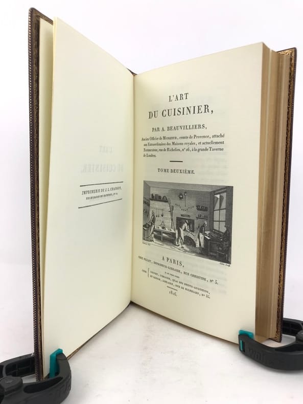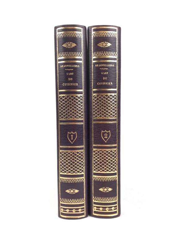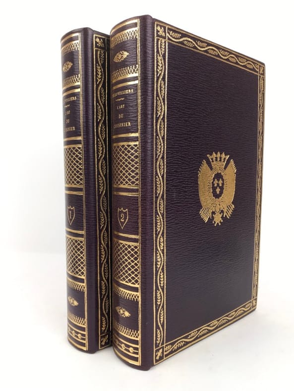 2 volumes in-8 (20 cm x 12 cm), maroquin à longs grains violet moderne (reliure pastiche), dos lisse à motifs dorés, roulette dorée en encadrement des plats avec armes dorées au centre, tranches dorées, gardes en moires violet, xii-388 ; [4]-376-38-2 bl.-[1] pages (complet). Très bon état. Reproduction en fac-similé de l’édition de Pillet à Paris en 1816, réimprimée à la demande de Daniel Morcrette, bibliophile parisien. Édition illustrée de 9 planches dépliantes hors-texte placées à la fin des deux volumes. Antoine Beauvilliers,(1754-1817), est un restaurateur français, célèbre pour avoir ouvert le premier véritable grand restaurant à Paris. Il est d’abord chef de cuisine du prince de Condé puis officier de bouche du comte de Provence, le futur Louis XVIII. Beauvilliers ouvre, en 1782, «La Grande Taverne de Londres», rue de Richelieu, à Paris. C’est le premier véritable grand restaurant de Paris, avec des salles décorées, des salons élégants, un service parfait et surtout une cuisine exquise et une cave admirable. Beauvilliers reste pendant plus de vingt ans sans rival auprès de la haute société parisienne. En 1814, il écrit L’art du cuisinier, où il traite de la cuisine, de l’ordonnance des mets et du service. Agréable exemplaire.