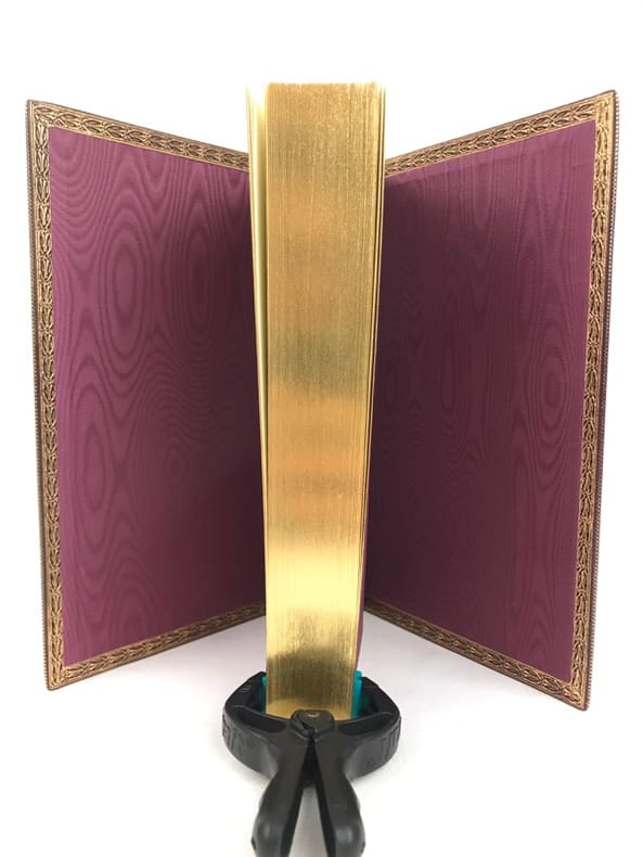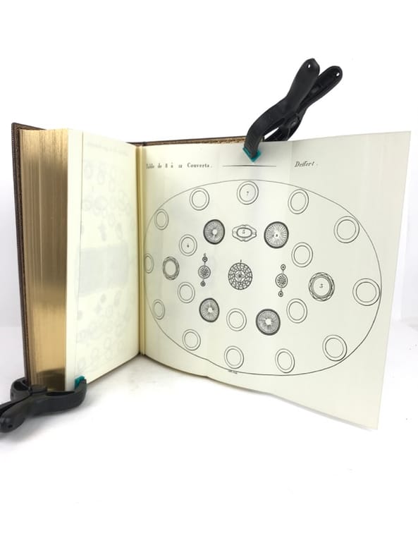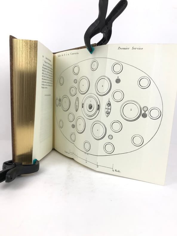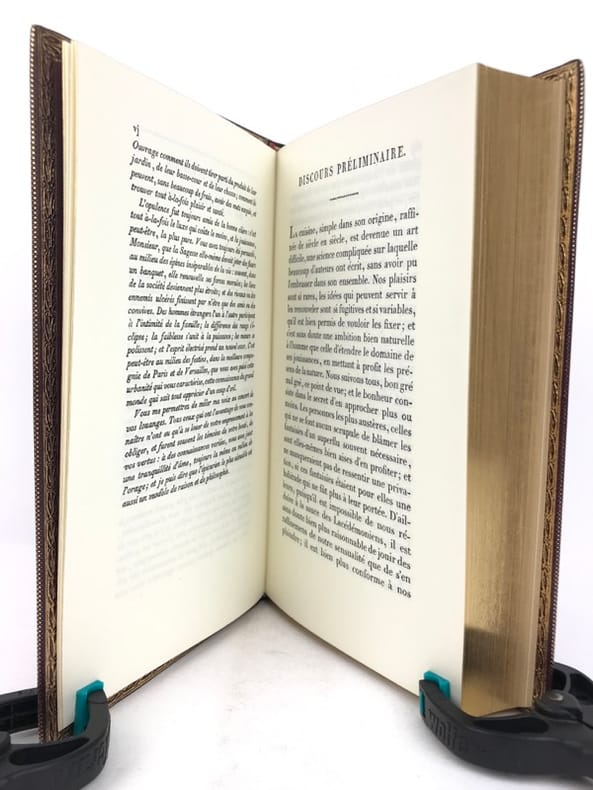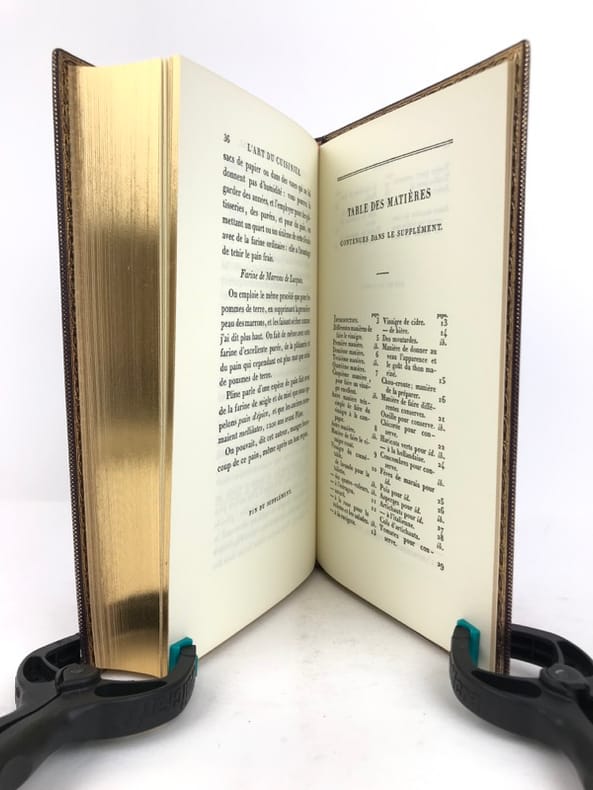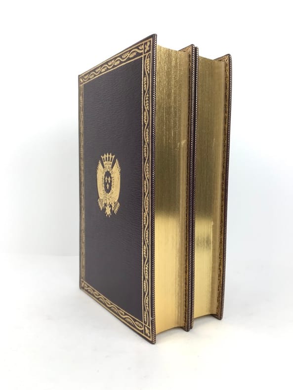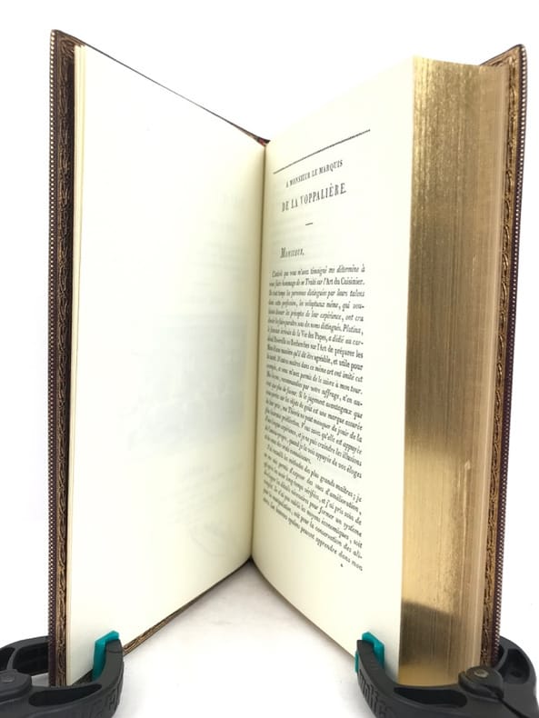 2 volumes in-8 (20 cm x 12 cm), maroquin à longs grains violet moderne (reliure pastiche), dos lisse à motifs dorés, roulette dorée en encadrement des plats avec armes dorées au centre, tranches dorées, gardes en moires violet, xii-388 ; [4]-376-38-2 bl.-[1] pages (complet). Très bon état. Reproduction en fac-similé de l’édition de Pillet à Paris en 1816, réimprimée à la demande de Daniel Morcrette, bibliophile parisien. Édition illustrée de 9 planches dépliantes hors-texte placées à la fin des deux volumes. Antoine Beauvilliers,(1754-1817), est un restaurateur français, célèbre pour avoir ouvert le premier véritable grand restaurant à Paris. Il est d’abord chef de cuisine du prince de Condé puis officier de bouche du comte de Provence, le futur Louis XVIII. Beauvilliers ouvre, en 1782, «La Grande Taverne de Londres», rue de Richelieu, à Paris. C’est le premier véritable grand restaurant de Paris, avec des salles décorées, des salons élégants, un service parfait et surtout une cuisine exquise et une cave admirable. Beauvilliers reste pendant plus de vingt ans sans rival auprès de la haute société parisienne. En 1814, il écrit L’art du cuisinier, où il traite de la cuisine, de l’ordonnance des mets et du service. Agréable exemplaire.
