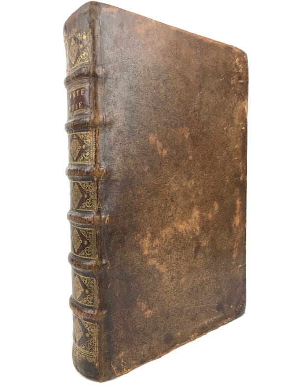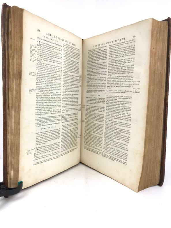 1 volume in-folio (38,5 x 25 cm), veau moucheté (reliure de l’époque), dos à nerfs orné, dos à nerfs orné, pièce de titre en maroquin grenat, monogramme “S.B” en coin du plat supérieur, roulette dorée sur les coupes, tranches mouchetées, titre en rouge et noir, texte sur double colonne, xi-[1]-854-248 pages (complet). Mors, coins et coiffes restaurés, frottements sur les plats, rousseurs éparses. État correct. Nouvelle édition de la célèbre Bible de Port-Royal. Mise en page et traduite par Louis-Isaac Lemaistre (1613-1684), sieur de Sacy, un prêtre catholique proche de Port-Royal, théologien, bibliste et humaniste français, elle comprend, à la différence d’autres entreprises, des “explications du sens littéral et du sens spirituel, tirées des Saints Pères”. Agréable exemplaire.