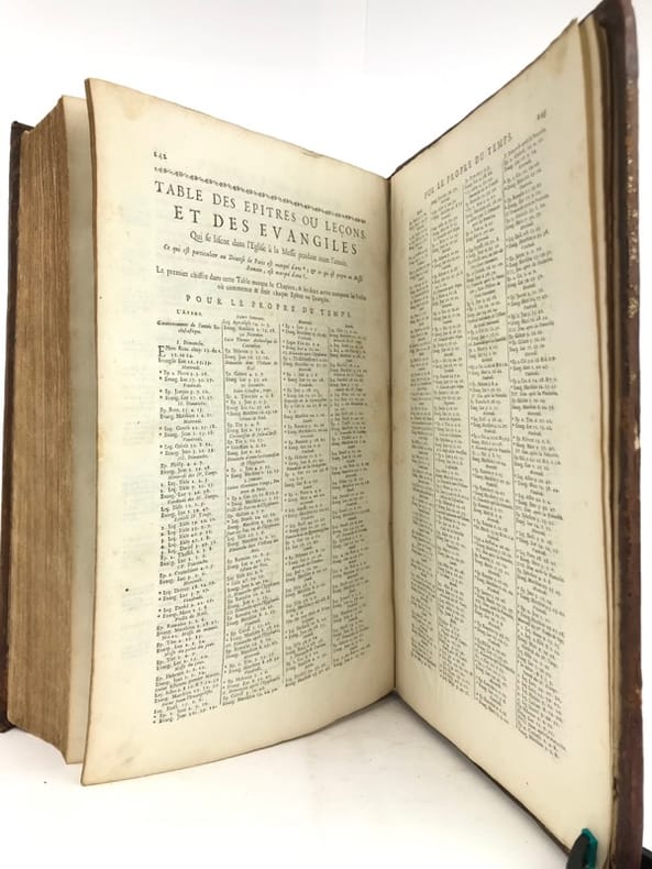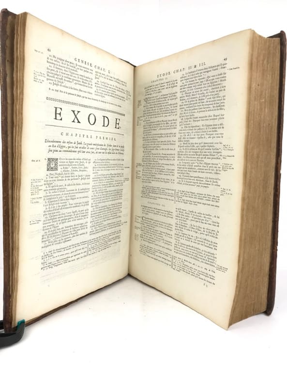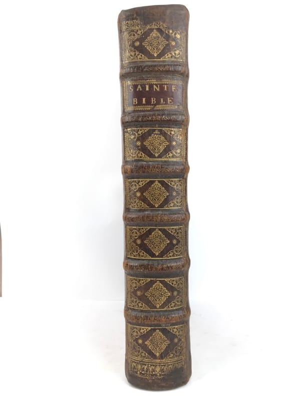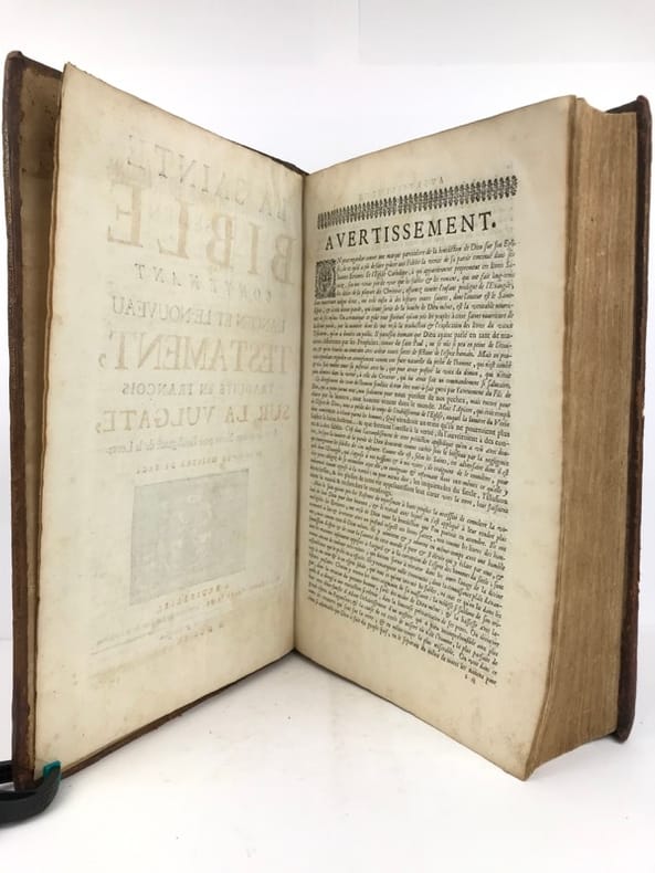 Edition in-12 de 1717 de la Bible dite de Port-Royal, traduction de Louis-Isaac Le Maistre de Sacy principalement, qui fera date au-delà du domaine religieux. Avec le privilège relié en fin du tome I. Texte sur deux colonnes, lettrines, bandeaux, cul-de-lampe en fin des différents livres composant les volumes, vignettes pour le Nouveau Testament (tome III). Premier volume: épidermures, un mors fendu, coiffes arasées avec manque de cuir (tranchefiles intactes), coins émoussés. Second volume : épidermures, coiffes arasées avec manque en tête. Début de travail de ver dans la partie supérieure du premier caisson. Troisième volume : épidermures, coiffes arasées, coins émoussés. Légères brunissures sinon intérieur frais, reliures solides.