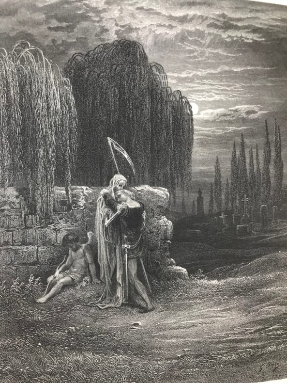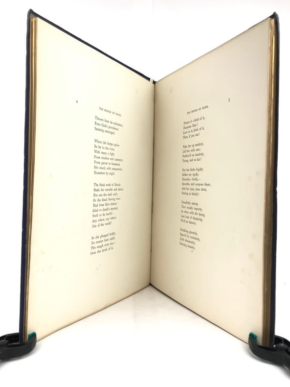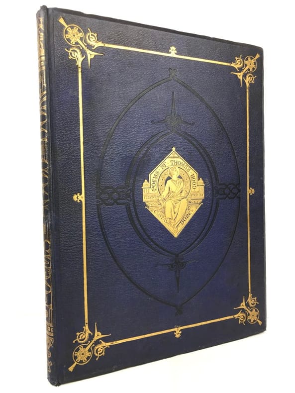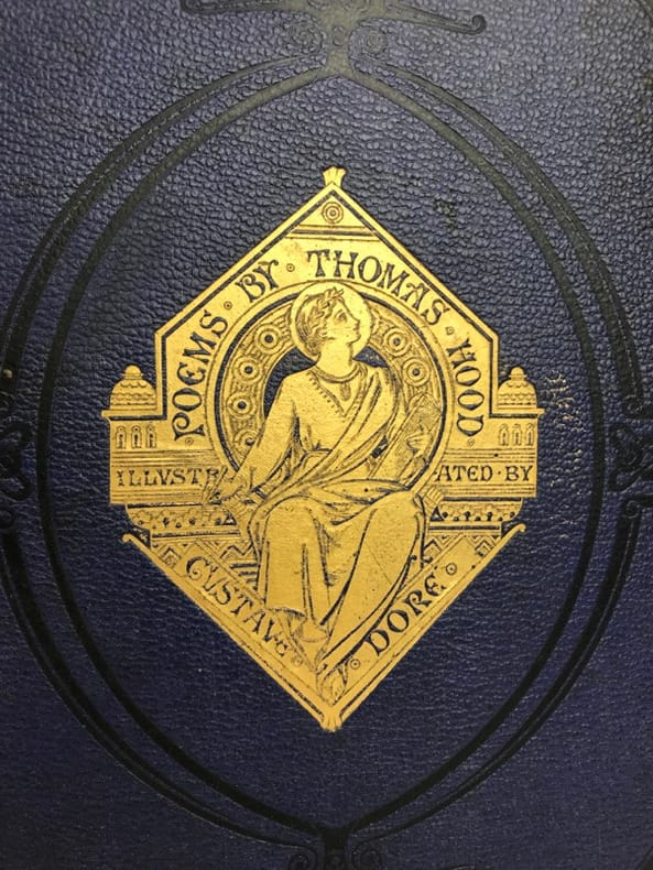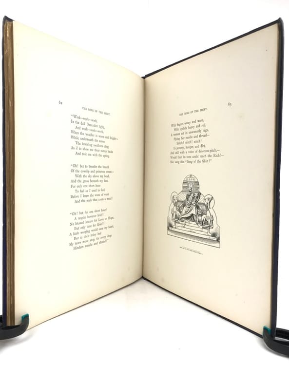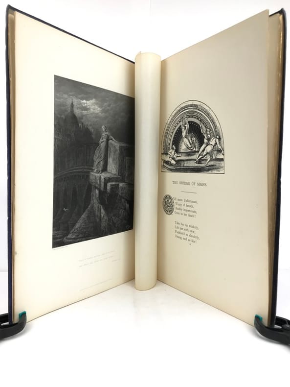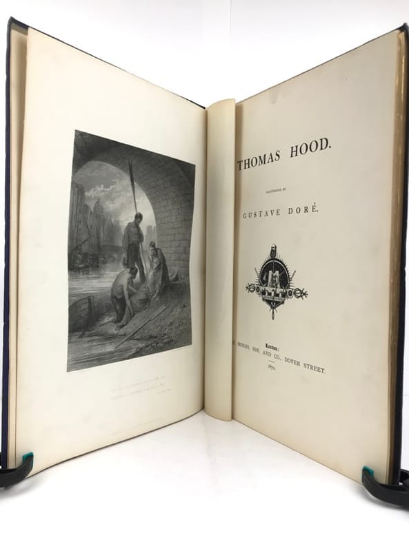1 volume in-folio (41, cm x 29,5 cm), percaline bleue à la bradel, dos lisse à motifs dorés, filet doré en encadrement des plats avec motifs en coins et motifs dorés au centre, filet à froid sur les plats, tranches dorées, ex-dono sur la première garde à Monsieur Edward Langlay [?], par F.B. Blake[?], texte en anglais, [6]-63-1 bl. pages (complet). Frottements à la reliure, rares rousseurs. État très correct. Nouvelle édition illustrée d’un frontispice ainsi que de 8 gravures hors-texte par Gustave Doré. Recueil de poèmes choisis parmi les textes de Thomas Hood. Thomas Hood, (1799-1845), est un poète anglais. Il était surtout apprécié pour ses vers comiques et satiriques, faits de jeux de mots et de quiproquos. Cependant les vers émus et profonds qu'il écrivit avant de mourir restent aujourd'hui parmi ses chefs-d'œuvre : The Song of the Shirt (1843), The Bridge of Sighs (1844). C'est de ce dernier poème qu'est sortie la fameuse formule "Any where out of the world", citée par Poe dans The Poetic Principle et reprise en titre d'un des poèmes en prose de Baudelaire, qui a traduit The Bridge of Sighs en avril 1865. Agréable exemplaire.