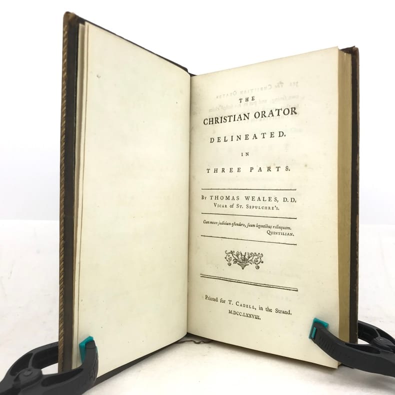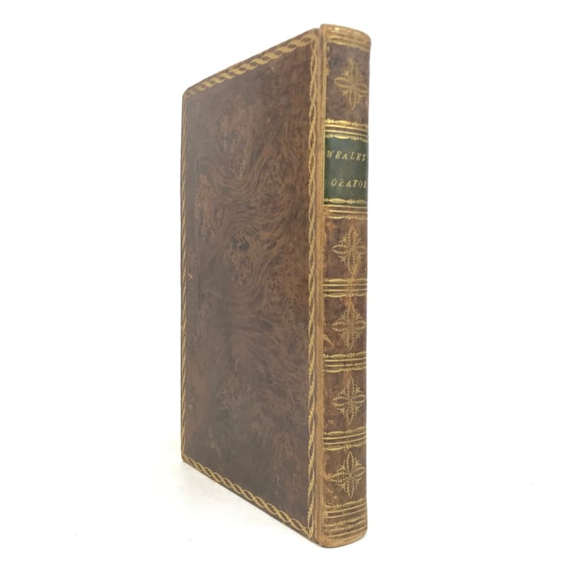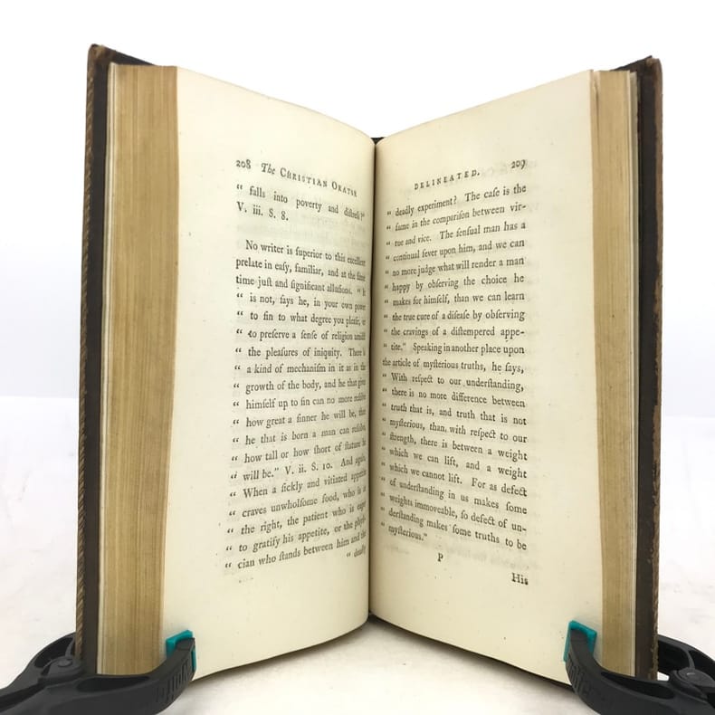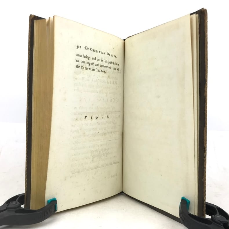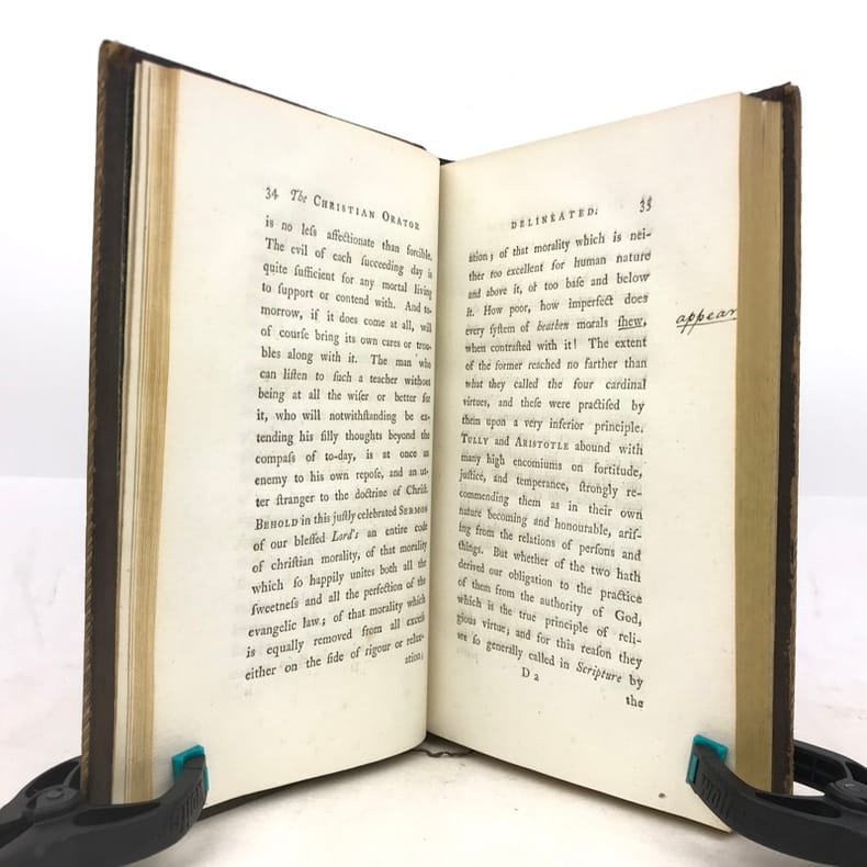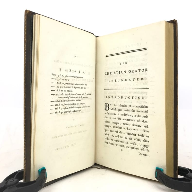 1 volume in-8 (21, 12,5 cm), plein veau brun raciné (reliure de l’époque), dos lisse orné, pièce de titre de maroquin vert, roulette encadrant les plats, une autre sur les coupes, texte en anglais. [4]-322 pages (complet). Frottements angulaires, coins légèrement émoussés, intérieur clair. État très correct. Édition originale de ce guide complet de l’art oratoire chrétien : la bonne communication du message, la sincérité et l’humilité de l’orateur, la langue, le style et la prononciation des sermons. Ouvrage intéressant sur la sensibilité rhétorique du XVIIIe, et qui a pu inspirer les écrits de Laurence Sterne. Provenance : De la bibliothèque du révérend Henry Collet, probablement d’Oxford, avec son ex-libris armorié sur le contreplat. Bon exemplaire.