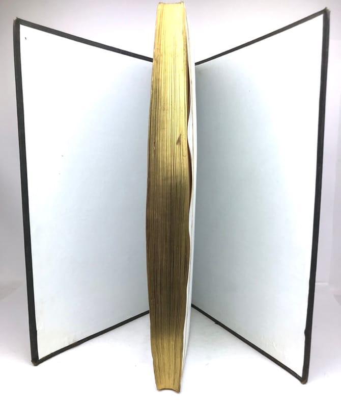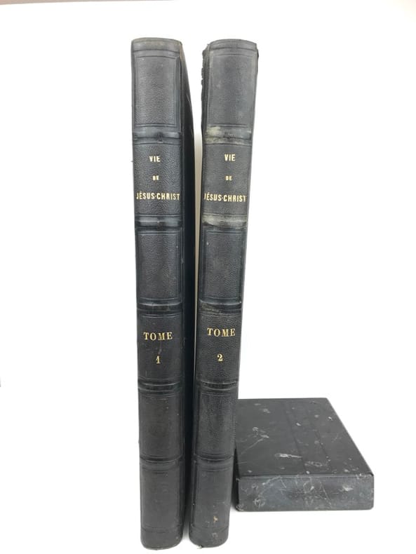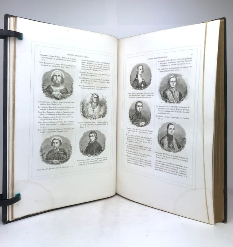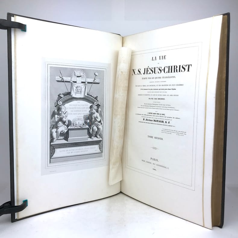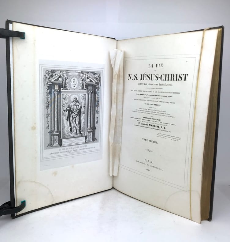2 volumes in-folio (43 cm x 28,5 cm), demi-chagrin noir (reliure de l’époque), dos à nerfs, filets à froid en encadrement des plats avec croix à froid au centre, tranches dorées, gardes en moires blanches, textes sur deux colonnes, [6]-xii-156 ; [4]-107-[1] pages (complet). Frottements à la reliure, mouillures, rousseurs sur les serpentes. État très correct tout de même. Nouvelle édition richement illustrée de 130 gravures sur acier hors-texte de P. Jérôme Natalis, dont 2 frontispices. Agréable exemplaire.