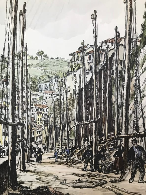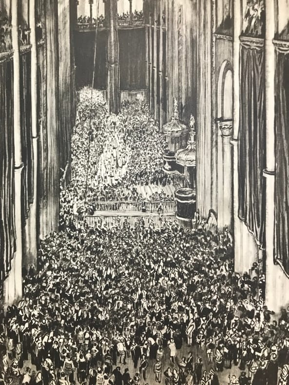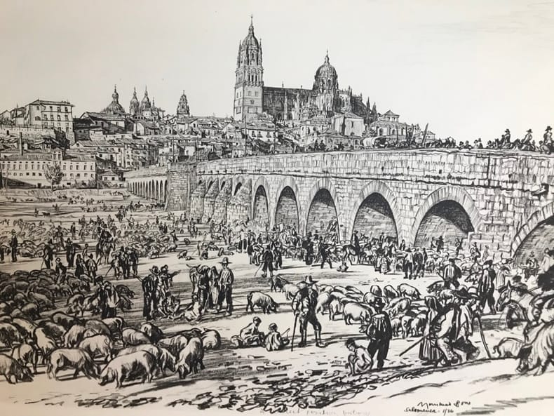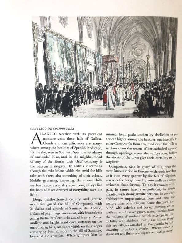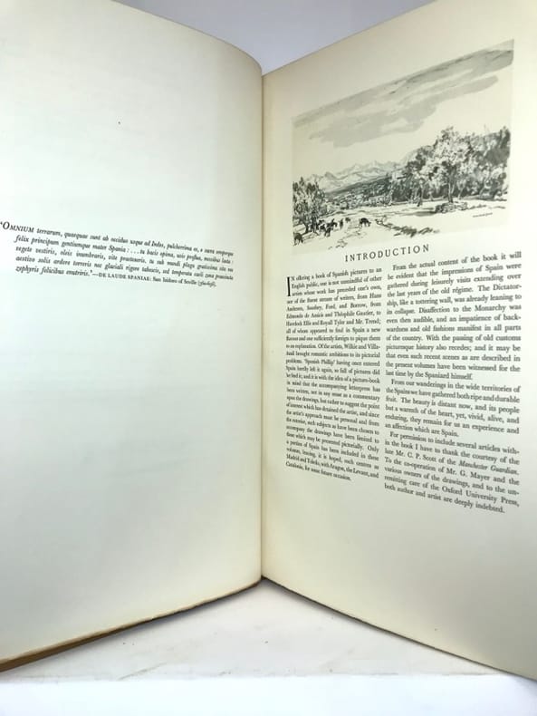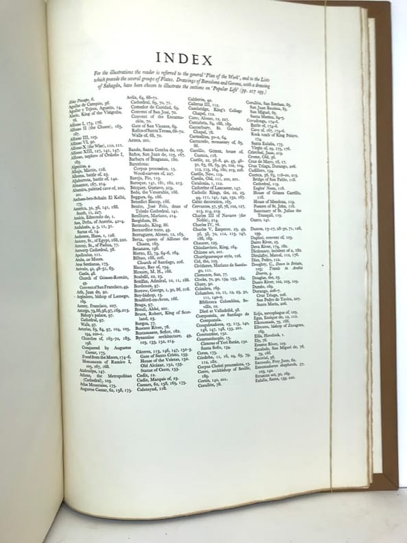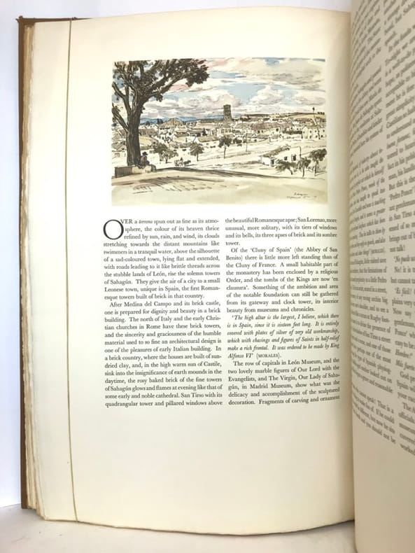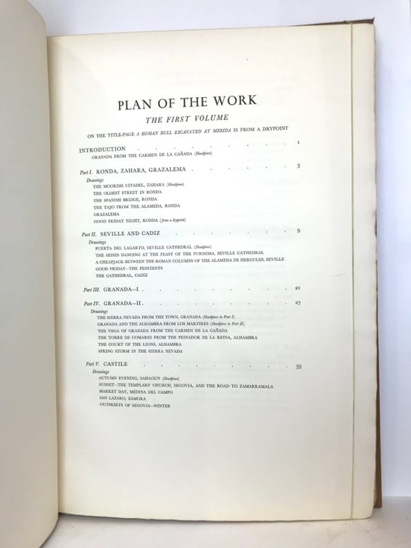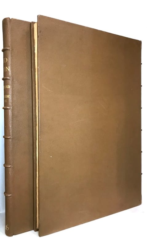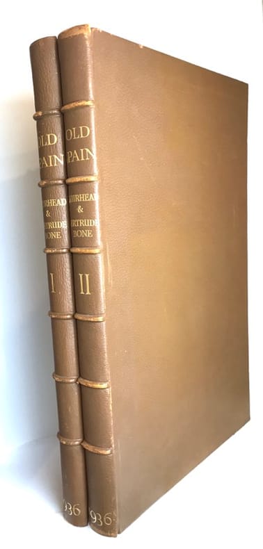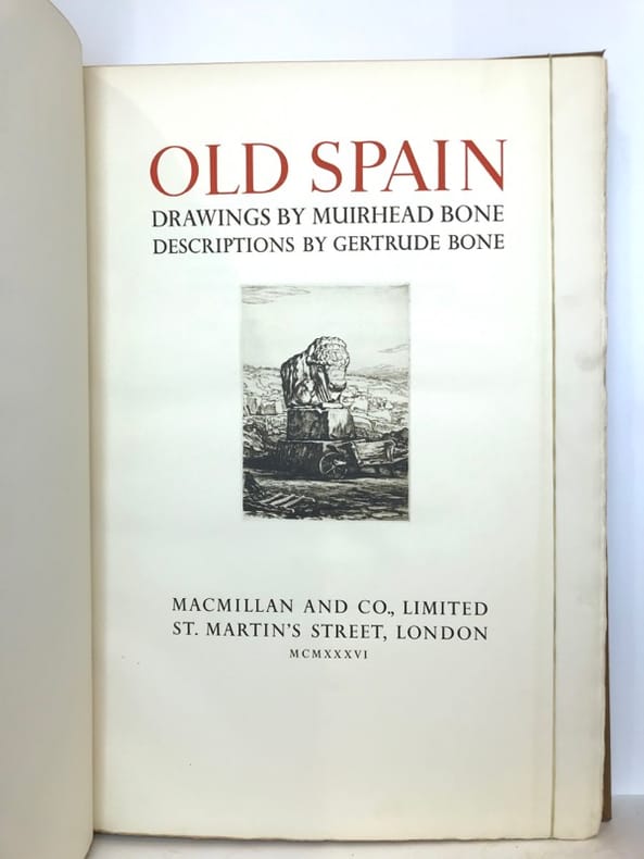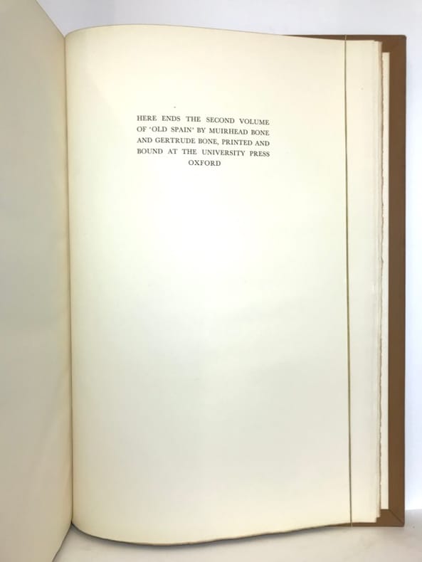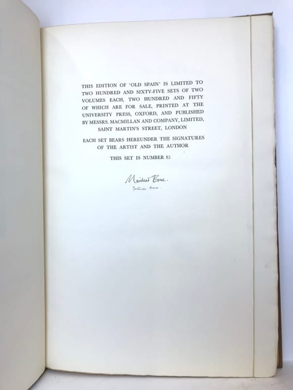 2 volumes in-plano (52 cm x 35 cm), maroquin moderne brun (reliure pastiche), dos à nerfs, tête dorée, texte sur deux colonnes, xiv-[2]-120-[4] ; vii-1 bl.-123 à 235-1 bl.-[1]-1 bl. pages. Manque 4 illustrations. Légers frottements à la reliure, rares rousseurs. État très correct. ÉDITION ORIGINALE illustrée de 116 illustrations de Muirhead Bone. Tirage à 265 exemplaires avec signatures de l’auteur et de l’illustrateur, ici n°83. Gertrude Helena Bone, Lady Bone (1876–1962) est une écrivaine britannique de l’ère édouardienne. Elle a écrit des nouvelles, trois romans et plusieurs collections illustrées. Gertrude Bone a souvent collaboré avec son mari et son fils Stephen pour des livres qui combinaient écriture et illustration. Le livre Des îles occidentales notamment, que Stephen a illustré, a remporté une médaille d’or à l’Exposition universelle de 1925 à Paris. En 1936, Gertrude et Muirhead Bone publient Old Spain, une collection en deux volumes d’aquarelles de Muirhead accompagnées d’un texte écrit par Gertrude. Ce livre devient rapidement populaire et le tirage initial très restreint, a été réimprimé sous le titre Days in the Old Spain en 1939 et 1942. Bel exemplaire.