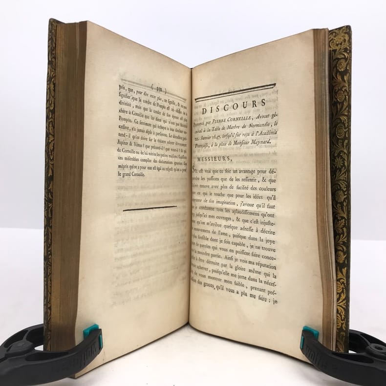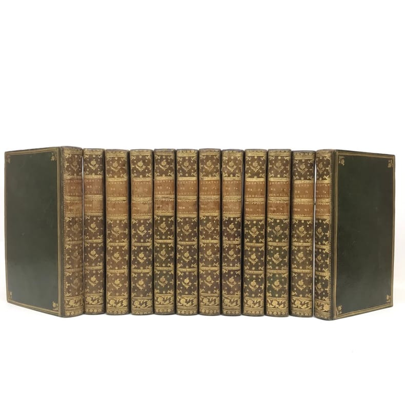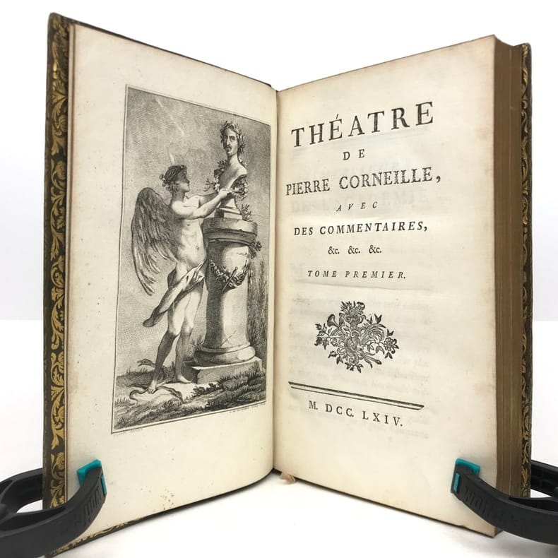 12 volumes in-8 (20 cm x 11,5 cm), maroquin olive (reliure XIXe), dos lisse orné de motifs dorés, pièce de titre et de tomaison fauve, triple filet doré en encadrement des plats avec fleurons dorés en coins, tranches dorées sur marbrure, roulette dorée intérieure, ex-libris de Wallace of Carleton et de Lucien Tissot-Dupont contrecollés sur le contreplat. [8]-454-[1] ; [12]-413-[1]-2 bl.-9-1 bl.-[1] ; [4]-510 ; [4]-482-[1] ; [4]-429-[2] ; [4]-442 ; [4]-463-[1] ; [4]-388 ; [4]-443-[1] ; [4]-495-[1] ; [4]-500 ; [4]-355-[1]-47-1 bl. pages (complet). Légers frottements à la reliure, dos légèrement insolé, quelques feuillets brunis, piqures.Très bon état. Nouvelle édition, commentée par Voltaire, illustrée d’un frontispice ainsi que de 34 gravures hors-texte par Gravelot. Pierre Corneille (1606-1684) nous a livré quinze pièces de théâtre baroques, pleines de vie et d’invention ainsi que quatre tragédies héroïques (Le Cid, Horace, Cinna, Polyeucte). Mais c’est dans une dizaine de pièces tardives que son génie se déploie : Théodore, Rodogune, Héraclius, Othon... On y découvre le fond de l’expérience humaine : le tragique, et parfois le comique, se révèlent moins dans le coût du devoir ou de l’erreur que dans l’impossibilité de savoir quoi faire.Bel exemplaire.