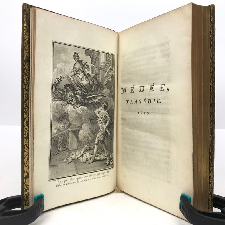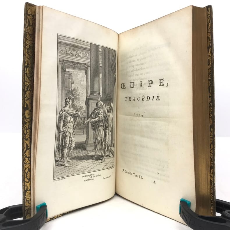 10 volumes in-folio (32 cm x 23,5 cm), demi-maroquin rouge à coins (reliure postérieure signée Boutigny), dos à nerfs orné de fleurons dorés, tête dorée, ex-libris du premier marquis de France contrecollé au contreplat. viii-550 ; [4]-462-[1] ; [4]-526 ; [4]-564 ; [4]-417[492] ; [4]-530 ; [4]-572 ; [4]-551-[1] ; [4]-427-[1] ; [4]-462-[2] pages (complet). Légers frottements à la reliure, épidermures sur les plats, quelques feuillets légèrement brunis, déchirures marginales. État très correct. Nouvelle édition, commentée par Voltaire, illustrée de 10 frontispices, 3 portraits, ainsi que de 43 planches hors-texte composé de la suite complète de 34 figures de Gravelot (gravées par Le Mire, Baquoy Lempereur etc., dont 9 frontispices), d’une suite de 18 figures gravée de Moreau Le Jeune (gravées par Bosq) et de 4 frontispices et portraits supplémentaires au tome I, gravés d’après Pierre, St Aubin, Le Brun et Devéria. La suite de Gravelot avait été tirée pour figurer dans l’édition genevoise de 1764. L’ensemble des gravures présente un bel encadrement.Pierre Corneille (1606-1684), nous a livré quinze pièces de théâtre baroques, pleines de vie et d’invention ainsi que quatre tragédies héroïques (Le Cid, Horace, Cinna, Polyeucte). Mais c’est dans une dizaine de pièces tardives que son génie se déploie : Théodore, Rodogune, Héraclius, Othon... On y découvre le fond de l’expérience humaine : le tragique, et parfois le comique, se révèlent moins dans le coût du devoir ou de l’erreur que dans l’impossibilité de savoir quoi faire.Bel exemplaire.