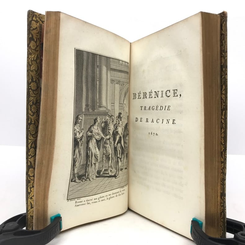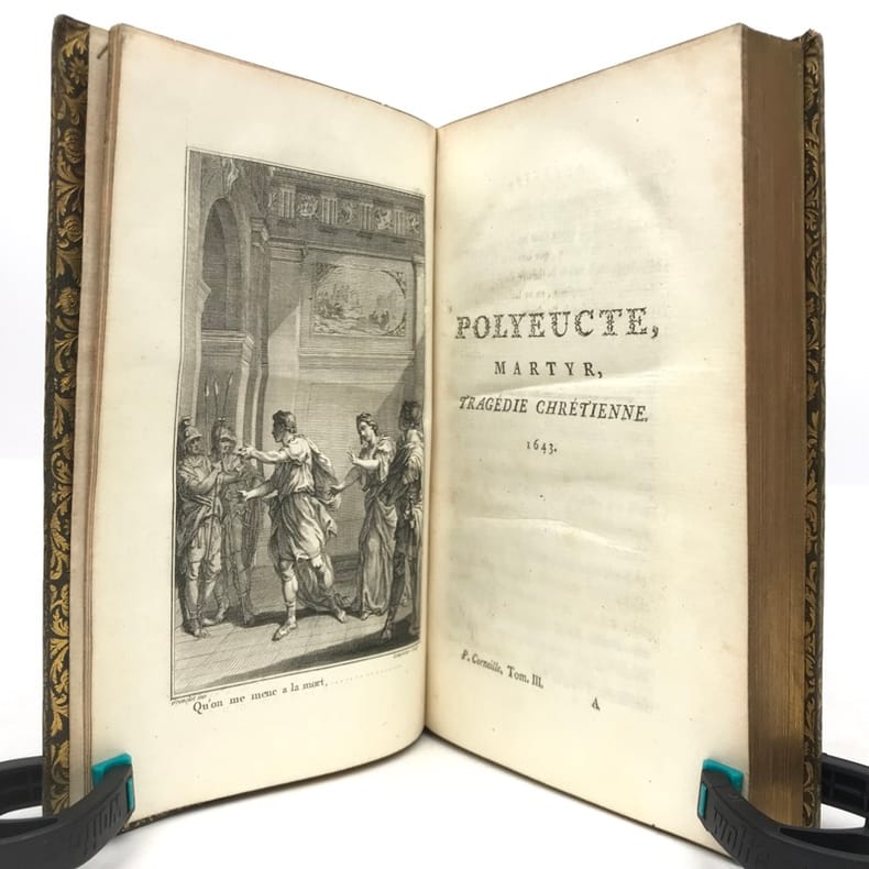 ...1 volume in 8°(12,5x 20 cm), relié veau marbré (avec une sorte de quadrillage décoratif très flou sur les plats).429 pages avec en frontispice, pour deux des trois pièces, une gravure significative de Gravelot (donc, ici, 2). On trouve également, au début de la 1ére et de la dernière pièce une “préface de l’éditeur”. Au début de la 2ème pièce, on trouve une variante: “ Remarque de l’Editeur sur un passage concernant Héraclius”). il s’agit sans doute des Commentaires (de Voltaire) annoncés dans le titre.Le numéro du tome est légèrement estompé mais notre exemplaire est en très bon état.