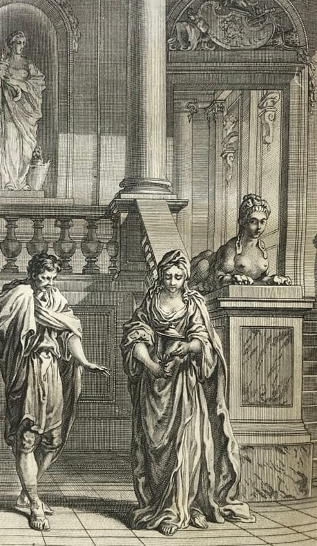 ...1 volume in 8°(12,5x 20 cm), relié veau marbré (avec une sorte de quadrillage décoratif très flou sur les plats).495 pages avec en frontispice, pour chacune des quatre pièces, une gravure significative de Gravelot (donc, ici, 4). On trouve également, au début des 3 premières pièces une “préface de l’éditeur”. il s’agit sans doute du Commentaire (de Voltaire) annoncé dans le titre.Le numéro du tome est légèrement estompé mais notre exemplaire est en très bon état.