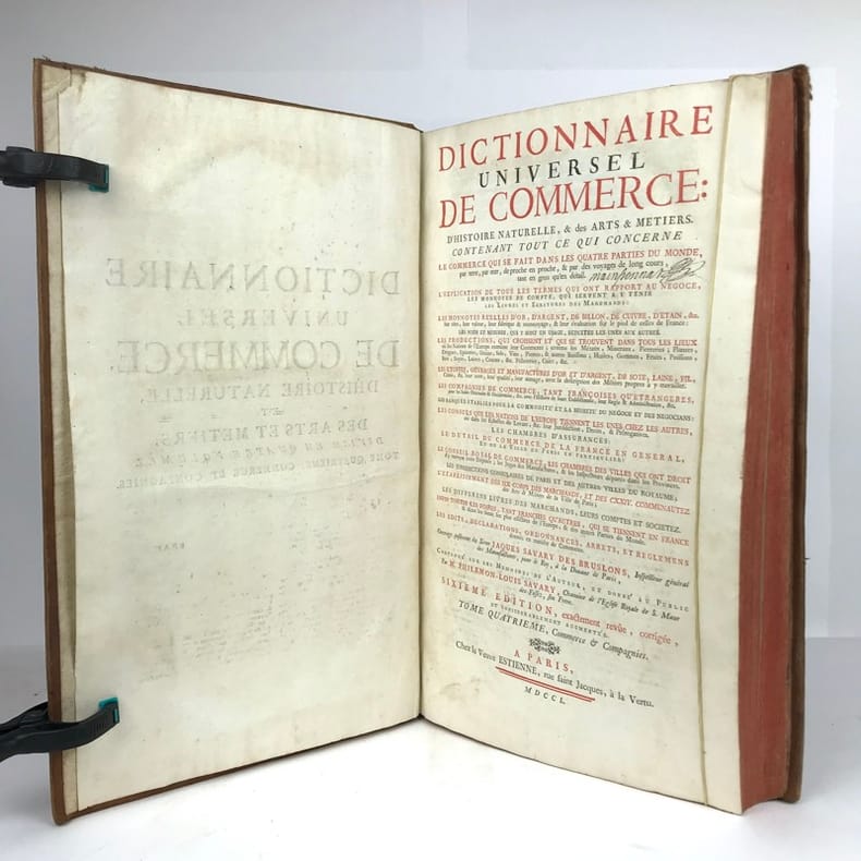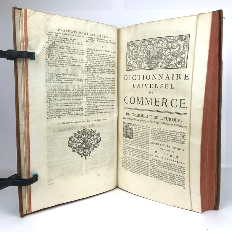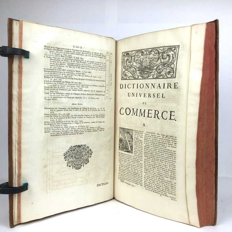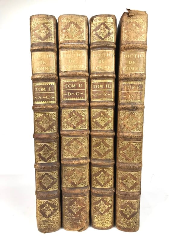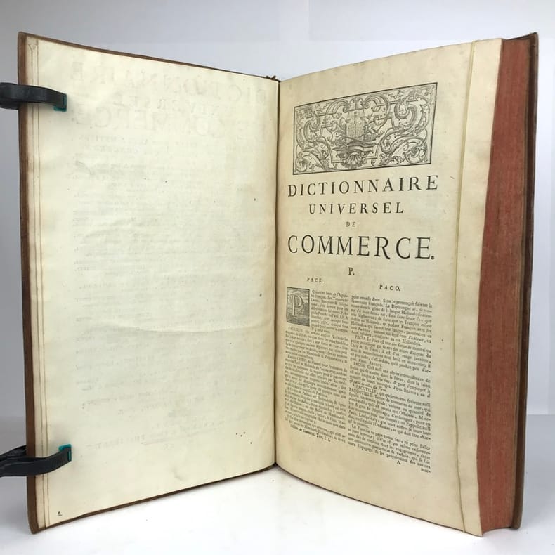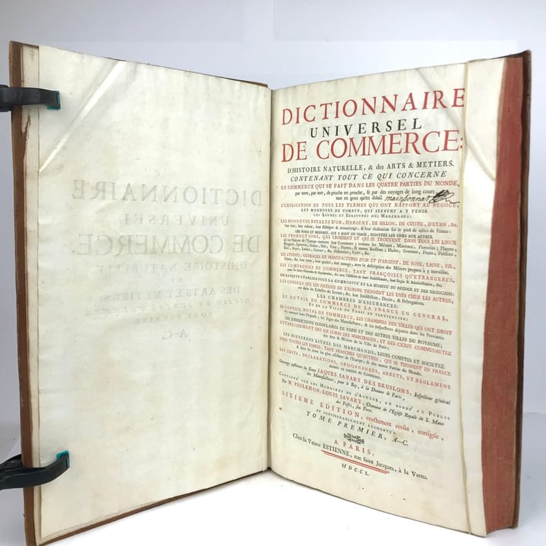 4 volumes in-folio (40 cm x 23,5 cm), basane brune (reliure de l’époque), dos à nerfs orné, pièce de titre blonde, tranches rouges, ex-libris de D. Gilbertii Mainsonnat contrecollé sur le contreplat et manuscrit sur la page de titre, texte et pagination sur deux colonnes, xliv-[8]-1310-1 bl. ; [4]-1635 ; [4]-1406-1 bl. ; [64]-1227-31-1 bl. pages (complet). Frottements à la reliure, coiffe de tête du tome 4 accidentée, épidermures sur les plats, rousseurs, erreurs de pagination inhérente à l’édition, page xxix imprimée deux fois (la deuxième fois à la place de la page XXXIII). Sixième édition. Les frères Jacques et Philémon Louis Savary des Bruslons partagent pour le commerce une passion qu’ils tiennent de leur père. Celui-ci, influent commerçant, a pris une part importante dans l’élaboration de l’Ordonnance sur le commerce de 1673 , parfois dénommée Code Savary, et rédigé Le parfait négociant. Le dictionnaire des Savary quant à lui, paru en deux tomes en 1723. En 1730, un supplément établi à partir de documents inédits des frères Savary complète l’ensemble. Par la suite, les diverses versions seront corrigées, actualisées et amendées, dont celle ici présentée. Le dictionnaire aborde tout ce qui concerne le commerce pris au sens large. On trouve dans les définitions aussi bien des termes techniques propres au négoce et à la douane, des marchandises très diverses que des moyens de transport, des termes de marine, les différents titres de paiement ou encore le vocabulaire des artisans. Des notes insérées dans les articles et de longs chapitres abordent les règlements et ordonnances en vigueur. Très détaillée, la partie consacrée aux compagnies commerciales présente l’histoire et le fonctionnement des compagnies françaises et européennes comme la Compagnie de Guinée, la Compagnie des Indes orientales ou la Compagnie d’Ostende. Précisons enfin que les collaborateurs de l’Encyclopédie de Diderot et D’Alembert puiseront allègrement dans ce dictionnaire pour écrire leurs propres articles. Agréable exemplaire.