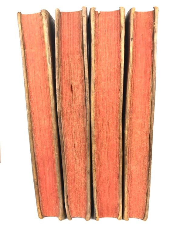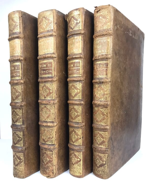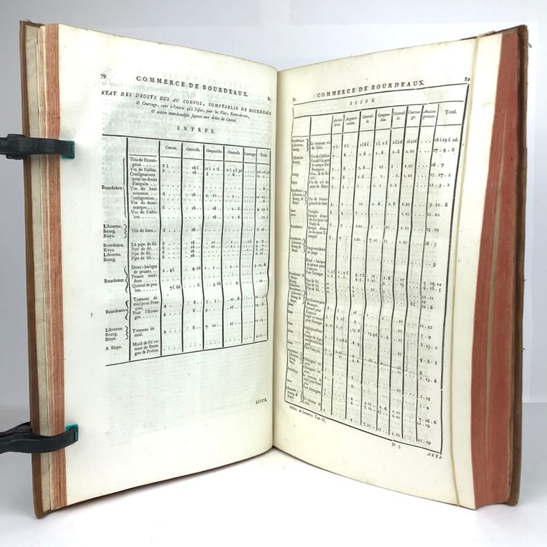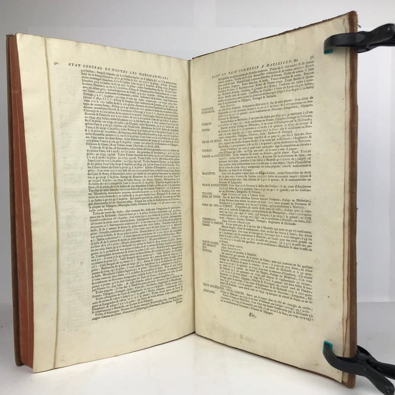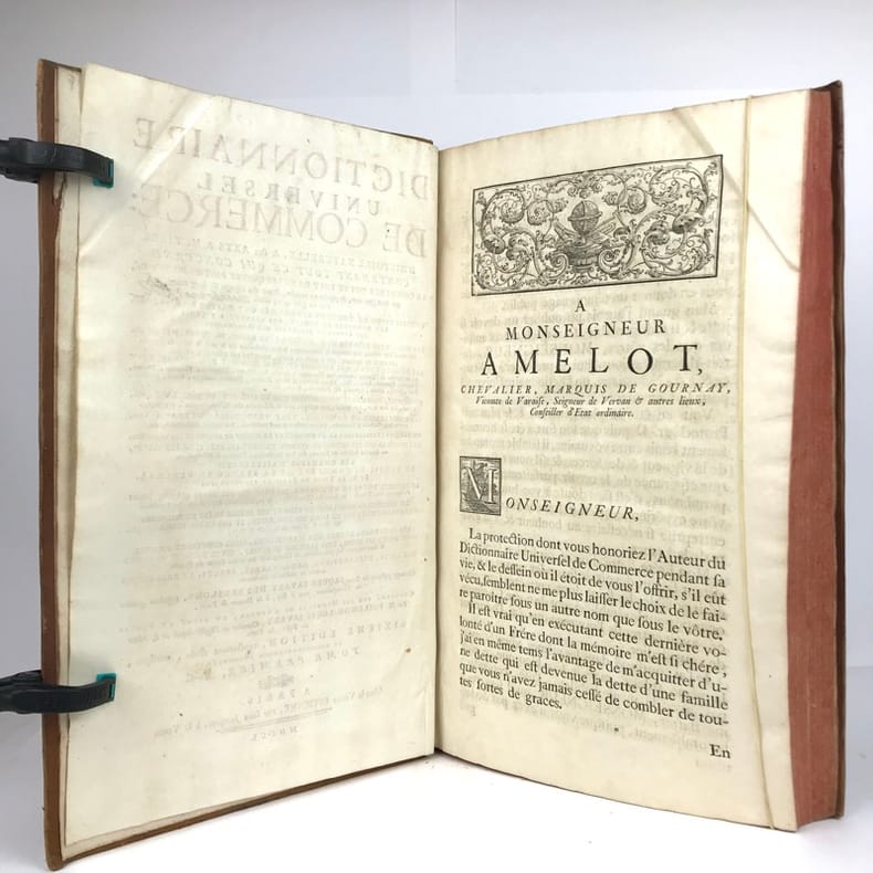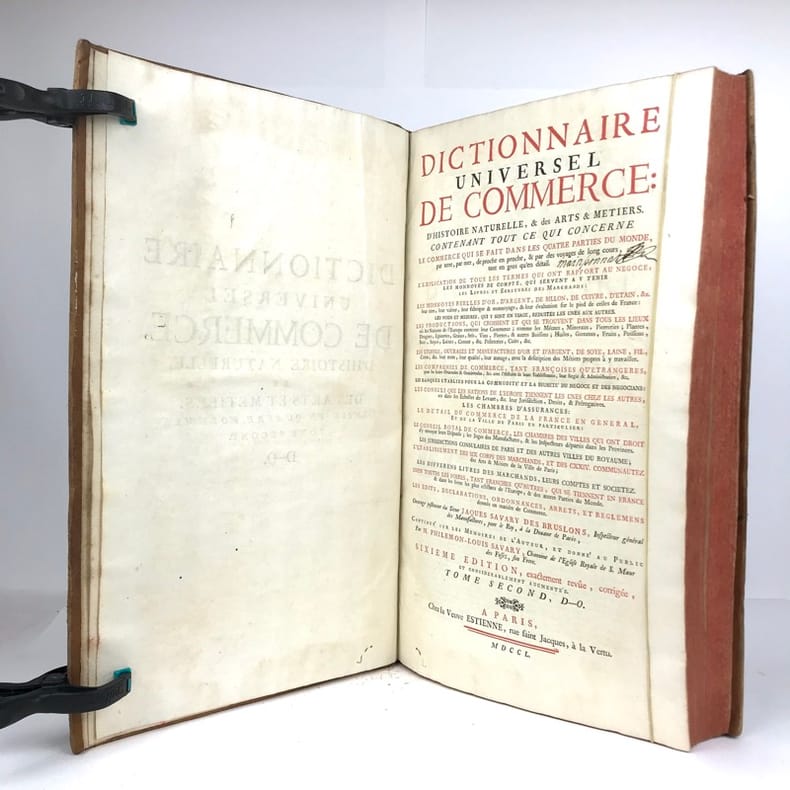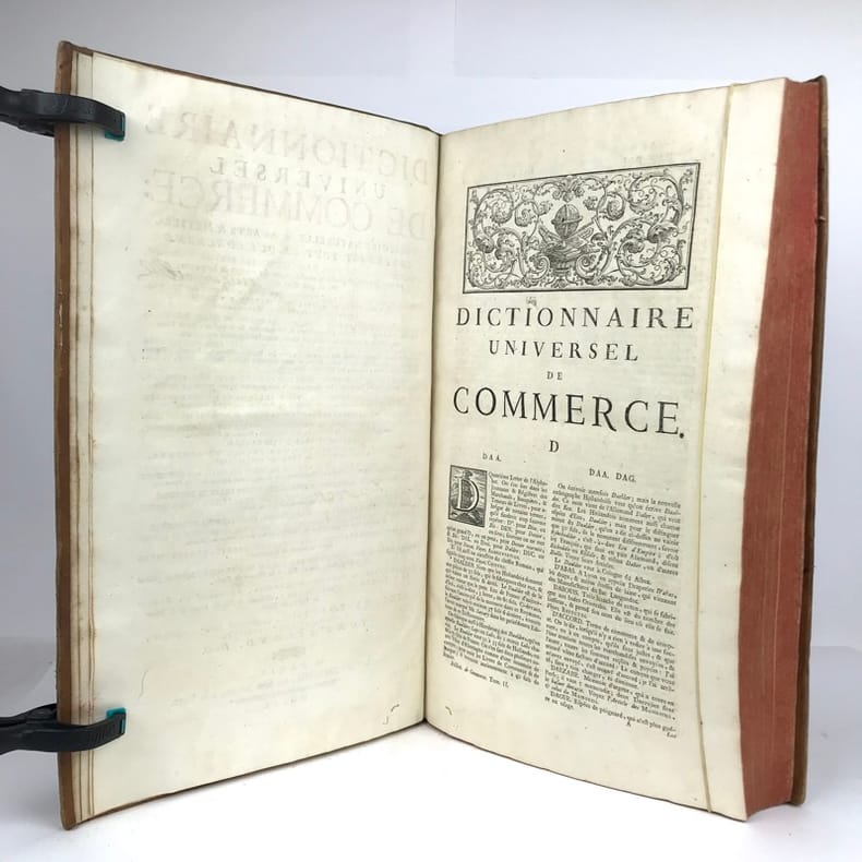 4 volumes in-folio (40 cm x 23,5 cm), basane brune (reliure de l’époque), dos à nerfs orné, pièce de titre blonde, tranches rouges, ex-libris de D. Gilbertii Mainsonnat contrecollé sur le contreplat et manuscrit sur la page de titre, texte et pagination sur deux colonnes, xliv-[8]-1310-1 bl. ; [4]-1635 ; [4]-1406-1 bl. ; [64]-1227-31-1 bl. pages (complet). Frottements à la reliure, coiffe de tête du tome 4 accidentée, épidermures sur les plats, rousseurs, erreurs de pagination inhérente à l’édition, page xxix imprimée deux fois (la deuxième fois à la place de la page XXXIII). Sixième édition. Les frères Jacques et Philémon Louis Savary des Bruslons partagent pour le commerce une passion qu’ils tiennent de leur père. Celui-ci, influent commerçant, a pris une part importante dans l’élaboration de l’Ordonnance sur le commerce de 1673 , parfois dénommée Code Savary, et rédigé Le parfait négociant. Le dictionnaire des Savary quant à lui, paru en deux tomes en 1723. En 1730, un supplément établi à partir de documents inédits des frères Savary complète l’ensemble. Par la suite, les diverses versions seront corrigées, actualisées et amendées, dont celle ici présentée. Le dictionnaire aborde tout ce qui concerne le commerce pris au sens large. On trouve dans les définitions aussi bien des termes techniques propres au négoce et à la douane, des marchandises très diverses que des moyens de transport, des termes de marine, les différents titres de paiement ou encore le vocabulaire des artisans. Des notes insérées dans les articles et de longs chapitres abordent les règlements et ordonnances en vigueur. Très détaillée, la partie consacrée aux compagnies commerciales présente l’histoire et le fonctionnement des compagnies françaises et européennes comme la Compagnie de Guinée, la Compagnie des Indes orientales ou la Compagnie d’Ostende. Précisons enfin que les collaborateurs de l’Encyclopédie de Diderot et D’Alembert puiseront allègrement dans ce dictionnaire pour écrire leurs propres articles. Agréable exemplaire.