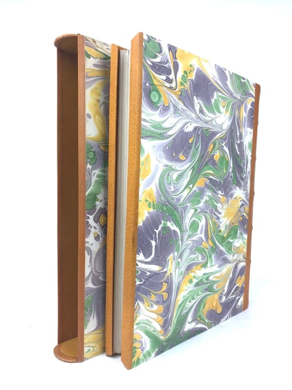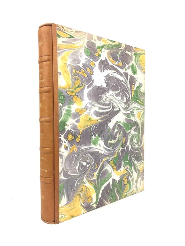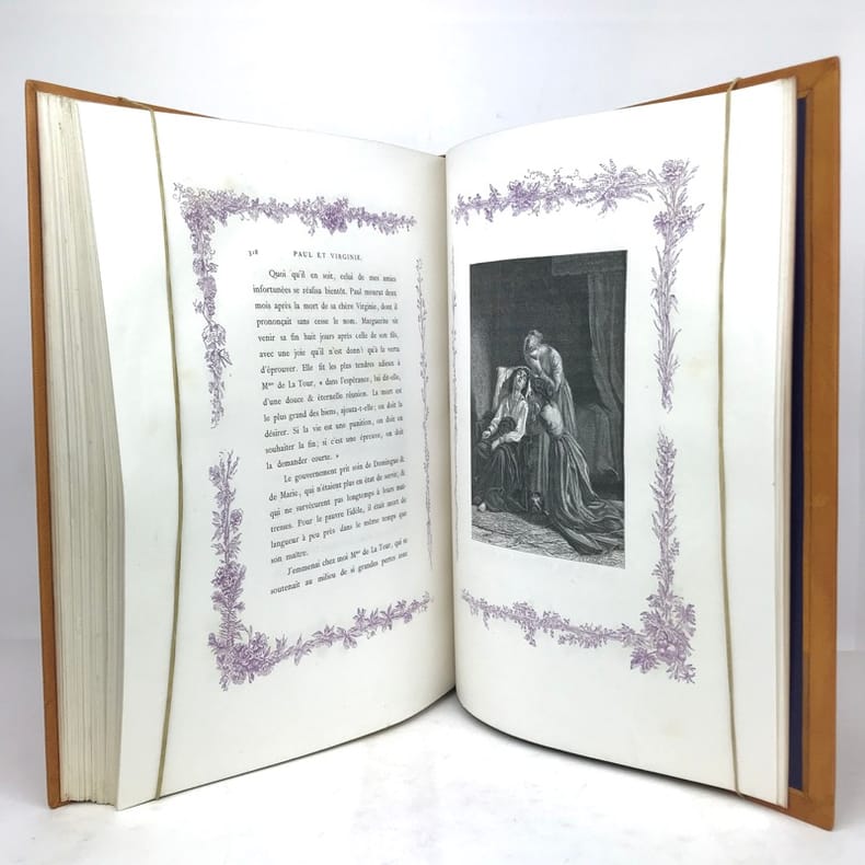 Edition célèbre de Paul et Virginie, considérée comme l’une des plus belles productions de la période romantique. Carteret, III, 532; Vicaire, VII, 42-48. On trouve à la suite de Paul et Virginie: La Chaumière indienne et la Flore de Paul et Virginie. L’abondante illustration se compose d’environ 450 vignettes dans le texte, dessinées par Meissonier, Français, Tony Johannot, Isabey, Paul Huet, Marville, Steinheil, … gravées sur bois par Lavoignat, Brévière, Porret, … de 29 planches hors texte dessinées et gravées sur bois par les mêmes artistes, de 7 portraits gravés sur acier par Cousin, Pelée, Pigeot et Revel et d’une carte coloriée de l’Ile de France. «L’éditeur avait le désir que ‘Paul et Virginie’ fût relié convenablement par des relieurs de son choix, ‘reliures très soignées, analogues à l’ouvrage, d’un prix modéré, reliures en basane, mouton, veau, maroquin, chagrin, cuir de Russie, vélin, soie, moire, velours, etc.; des demi-reliures et cartonnages, par conséquent, des reliures à tous prix, mais nous avons fait disposer une reliure magnifique et toute spéciale. M. Simier, relieur du roi, est chargé de ce travail. Hélas! presque tous ces exemplaires reliés de leur temps sont très piqués, surtout les gravures hors texte, et ces taches d’humidité sont la cause que les amateurs, avec raison d’ailleurs, préfèrent constituer un bel exemplaire en reliure moderne». (Carteret). Très bel exemplaire d’une grande fraicheur, dans une magnifique reliure en maroquin rouge à grande plaque dorée dite «à l’indienne» attribuable à Simier.