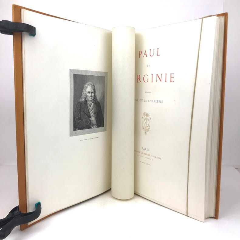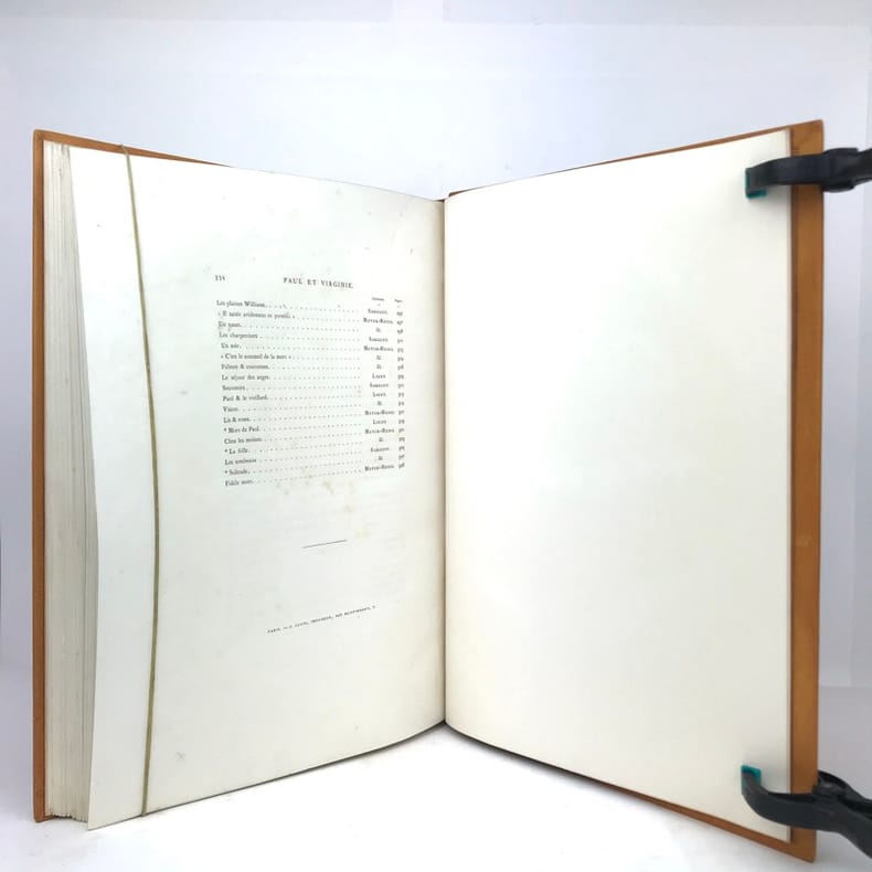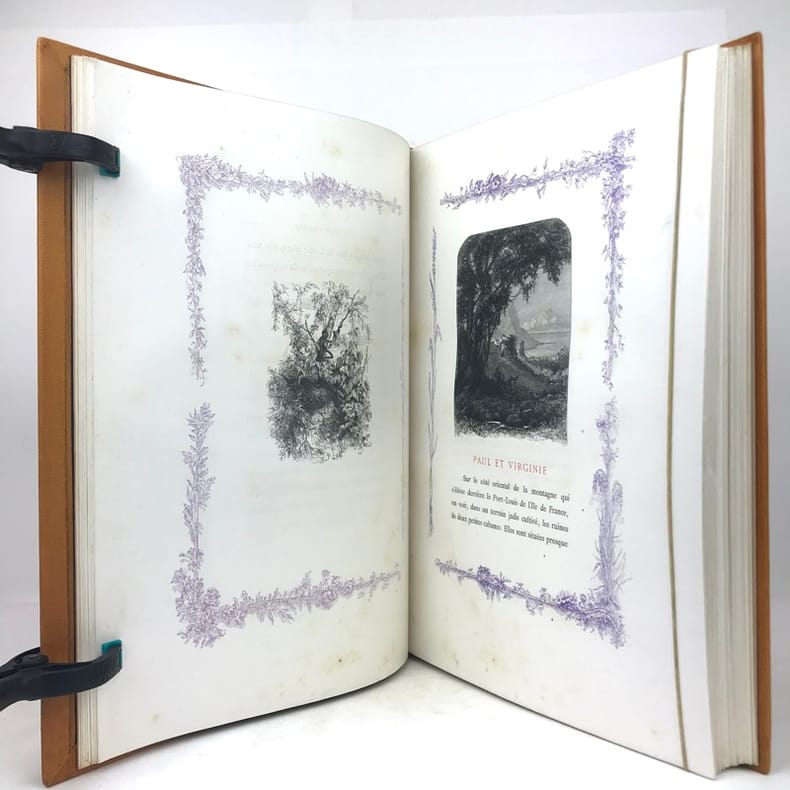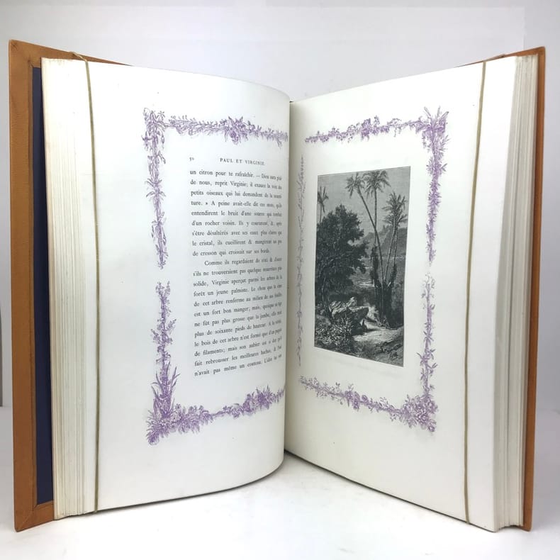 1 volume in-folio (34,5 x 24,5 cm), cuir moderne fauve (reliure de l’époque réalisée par Eugène Quinet), étui et jaquette, dos à nerfs orné, tranche de tête dorée, titre en rouge et noir, ex-libris de Monique de Nervo, texte encadré, xxvii-[1]-334 pages (complet). Rousseurs. État correct. Nouvelle édition, illustrée d’un portrait de l’auteur en frontispice, d’une gravure hors-texte in-fine, ainsi que de nombreuses figures in-texte, dont 36 à pleine page, réalisées par Hippolyte de La Charlerie (1828-1869). Premier des romans exotiques et maritimes, Paul et Virginie connut un triomphe à la fin du 18e siècle. Élevés ensemble depuis leur plus jeune âge, au sein d’une nature paradisiaque qui les a rendus beaux, bons et vertueux, deux jeunes gens voient leur idylle tourner court. Romantique avant l’heure, le roman est la source du lyrisme descriptif à laquelle ont puisé Chateaubriand, Flaubert, Loti et tant d’autres. Agréable exemplaire.