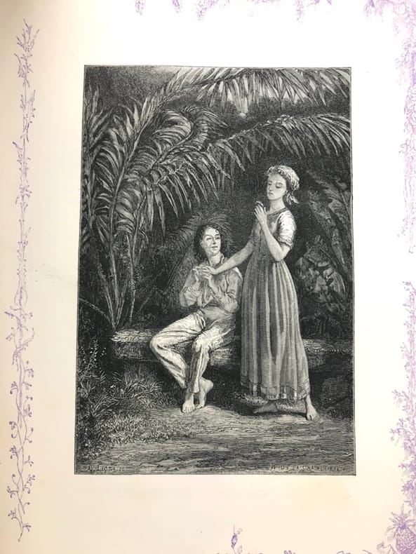 Exemplaire revêtu d'une reliure décorative du temps. Il s'ouvre sur un portrait-frontispice figurant l'auteur tiré sur Chine appliqué signé de Laffite. L'iconographie - outre de très nombreuses (environ 450) figures dans le texte et larges ornements typographiques figuratifs - est complétée par une carte de l'île Maurice sur Chine appliqué en coloris gommés, ainsi que 6 portraits sur Chine et 29 planches hors-texte. Réimpression de la célèbre édition Curmer de 1838, considérée telle l'une des meilleures productions de l'illustré romantique. Issus de deux familles différentes, Paul et Virginie sont élevés en commun comme frère et sœur, dans la splendeur naturelle des paysages tropicaux de lîle Maurice. Mais à l'adolescence, des sentiments amoureux naissent entre les deux personnages. La mère de Virginie, Madame de la Tour décide alors de l'éloigner de Paul en envoyant sa fille étudier en France, laissant Paul à son chagrin. Plusieurs années après, Virginie annonce son retour sur l'île, mais le navire qui la ramène de France est pris dans une tempête... Appartenant au registre pathétique, Paul et Virginie décrit avec force les sentiments amoureux et la nostalgie du paradis perdu. Au-delà du cadre exotique et de la description d'une société idyllique, Bernardin de Saint-Pierre expose dans ce roman sa vision pessimiste de l'existence. A la suite, est imprimé le texte intitulé ''Flore'', se proposant de décrire les principales espèces rencontrées au cours de la lecture de ''Paul et Virginie'' ainsi que de ''La Chaumière indienne''. Pour l'édition Curmer de 1838 : Vicaire VII, Manuel de l'amateur de l'amateur de livres du XIXème siècle, 71 - Carteret III, L eTrésor du bibliophile, p. 552. Angles élimés. Dos passé. Exception faite des planches sur Chine, l'ouvrage ne présente que peu de rousseurs.