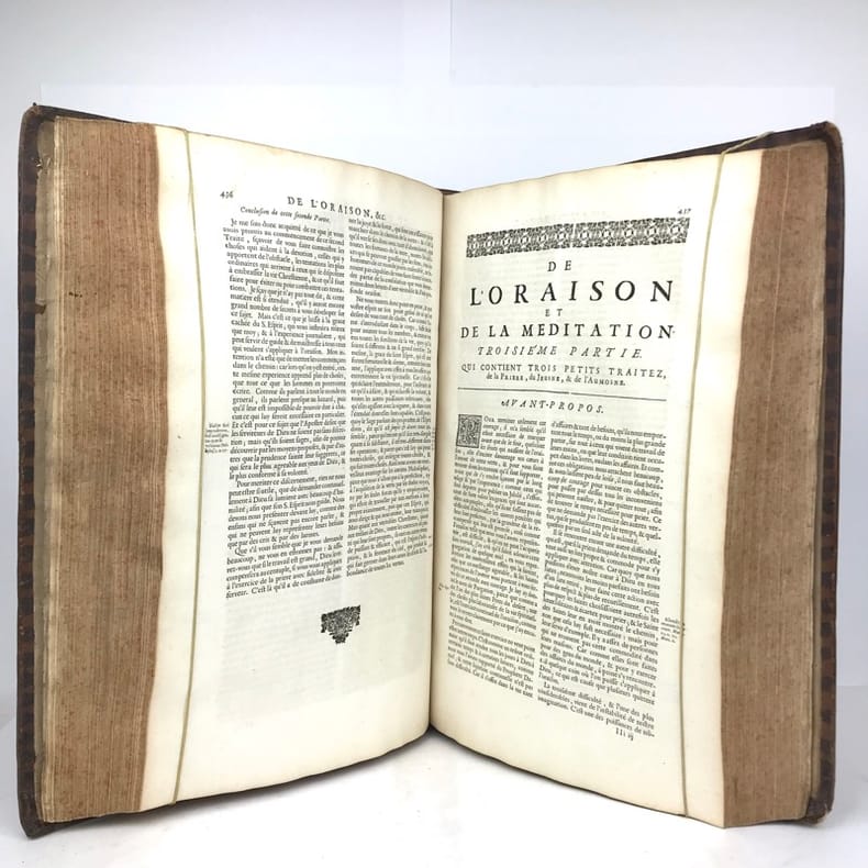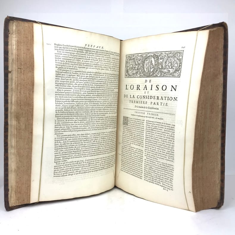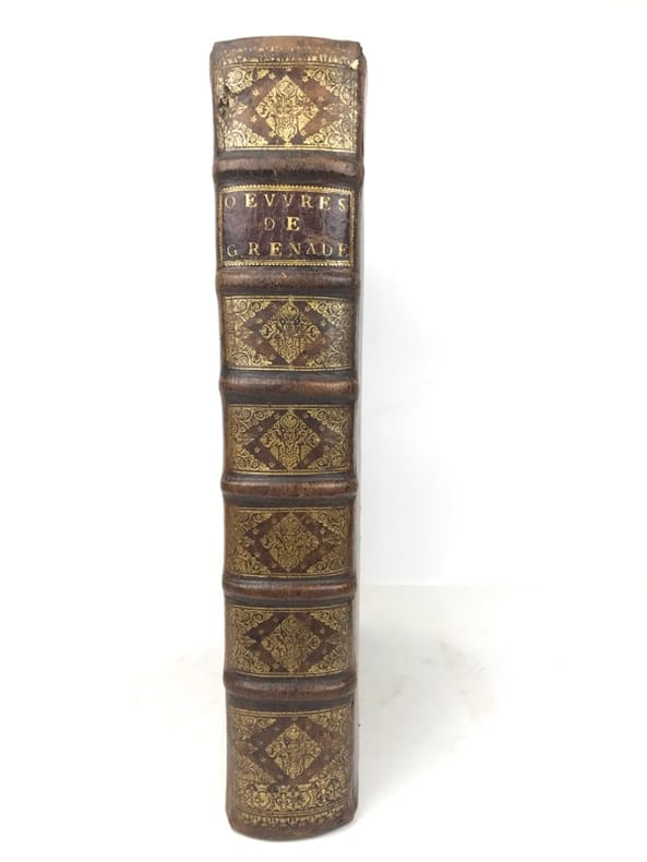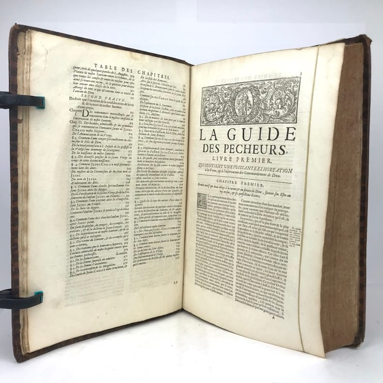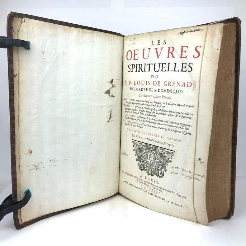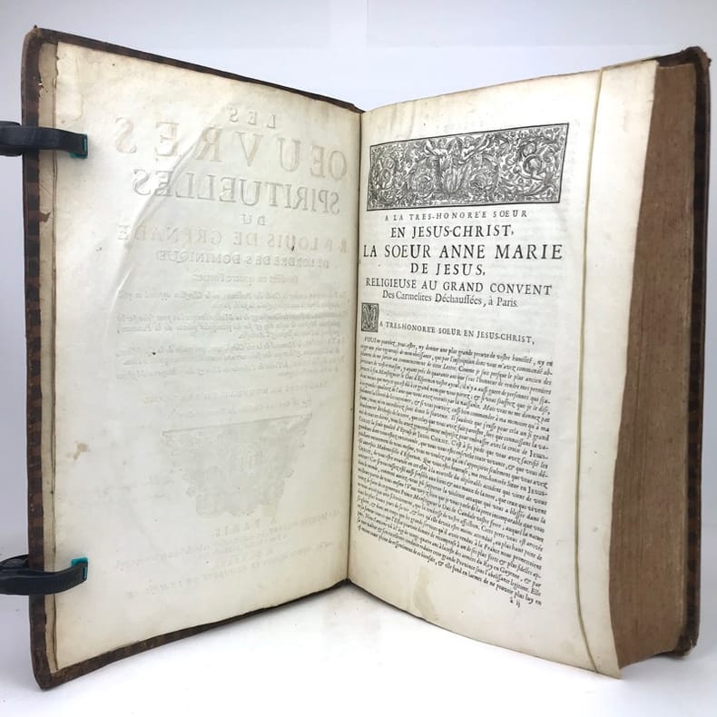 1 volume in-folio (38 cm x 24,5 cm), veau (reliure de l’époque), dos à nerfs orné, pièce de titre rouge, titre à l’encre noire et rouge, ex-libris manuscrit sur la page de titre, [20]-1049-[35] pages (complet). Frottements à la reliure, 1 mors fendu (6 cm), coins émoussés, feuillet RRrrii déchiré sans manque, mouillures. État très correct. Nouvelle édition traduite de l’espagnol en français par M. Girard. Louis de Grenade, (1504-1588), est un prêtre dominicain espagnol, prédicateur et écrivain spirituel de renom. Il est considéré comme 'Vénérable' par l'Église catholique. Entré chez les dominicains, il devint un orateur éblouissant et recherché, ainsi qu’un écrivain mystique d’une grande sensibilité et de grande notoriété, grand admirateur et défenseur de Jean de Avila, un autre grand mystique, peu à peu oublié. Il écrivit — en castillan et en portugais — plusieurs ouvrages parmi lesquels on peut citer : Le livre de l’oraison et de la méditation (1554), Le guide des pécheurs (1556), une Vie de Dom Barthélemy des Martyrs, archevêque de Braga, au Portugal, Introduction au Symbole de la foi (1583) ; celui-ci, très documenté, est comme une vraie encyclopédie de la religion chrétienne et catholique, à la lumière du mysticisme espagnol. Louis utilisa toujours une prose exemplaire par sa netteté et sa clarté, devenant de ce fait l’un des auteurs le plus prisé de son temps. Agréable exemplaire.