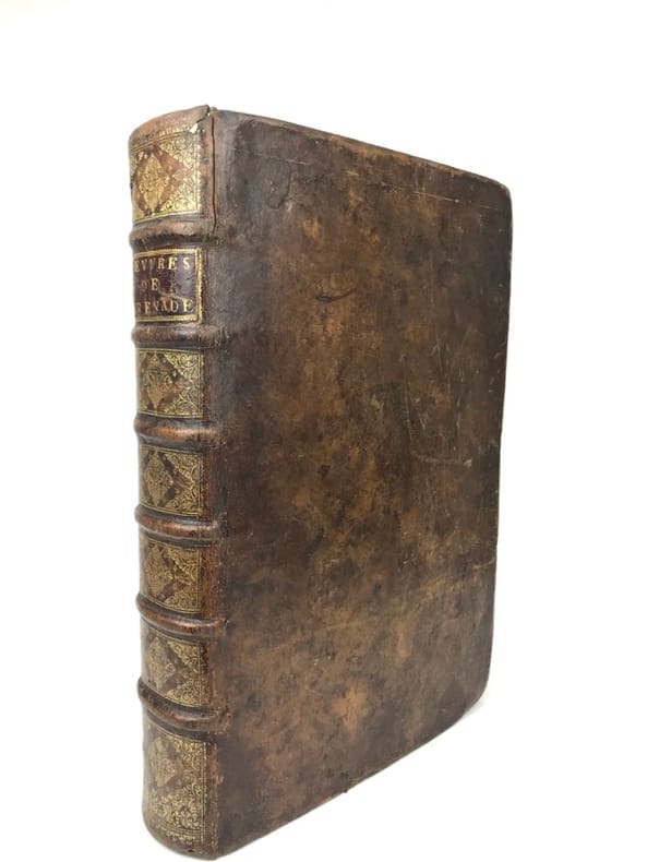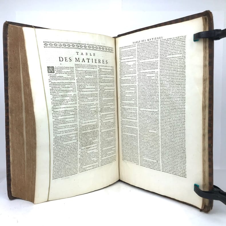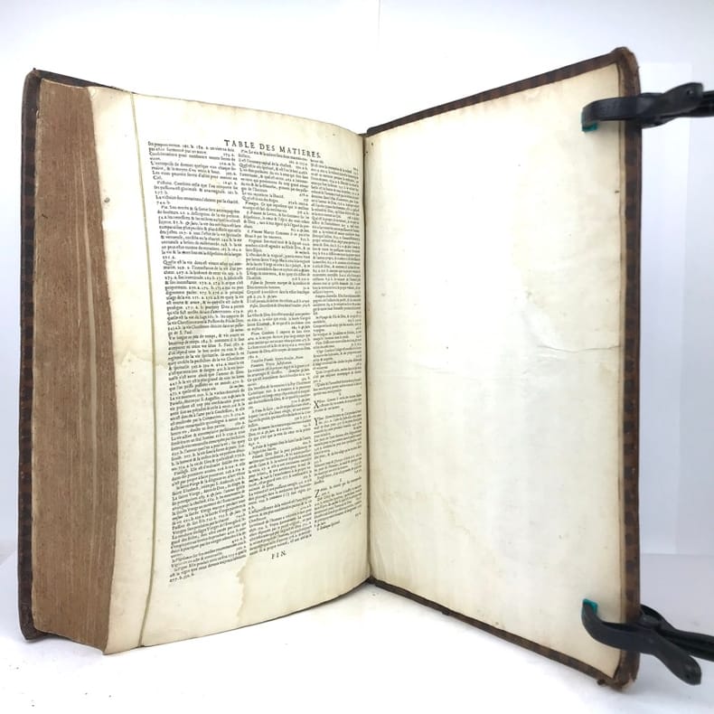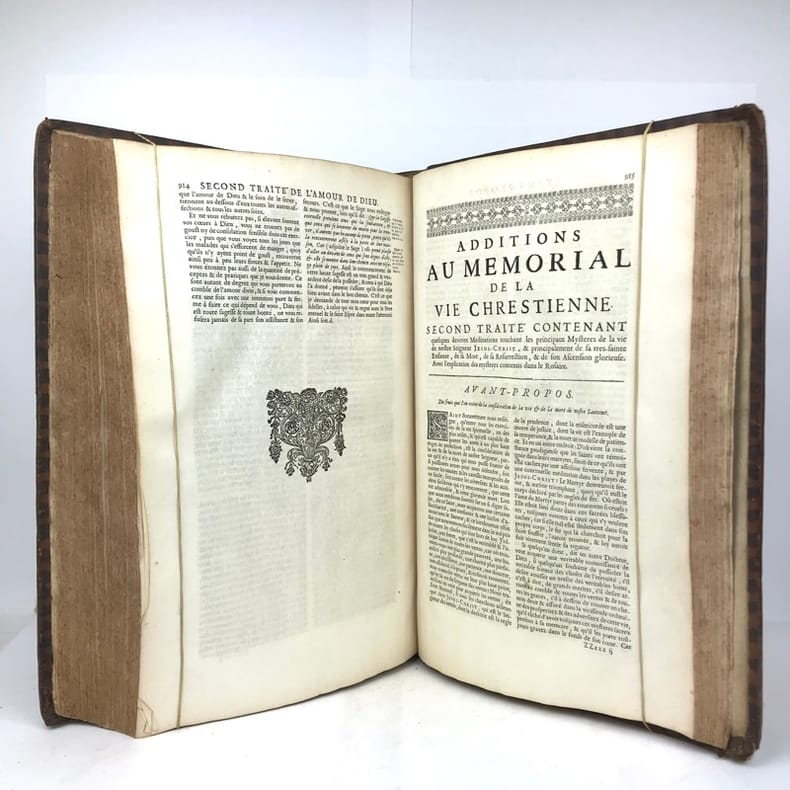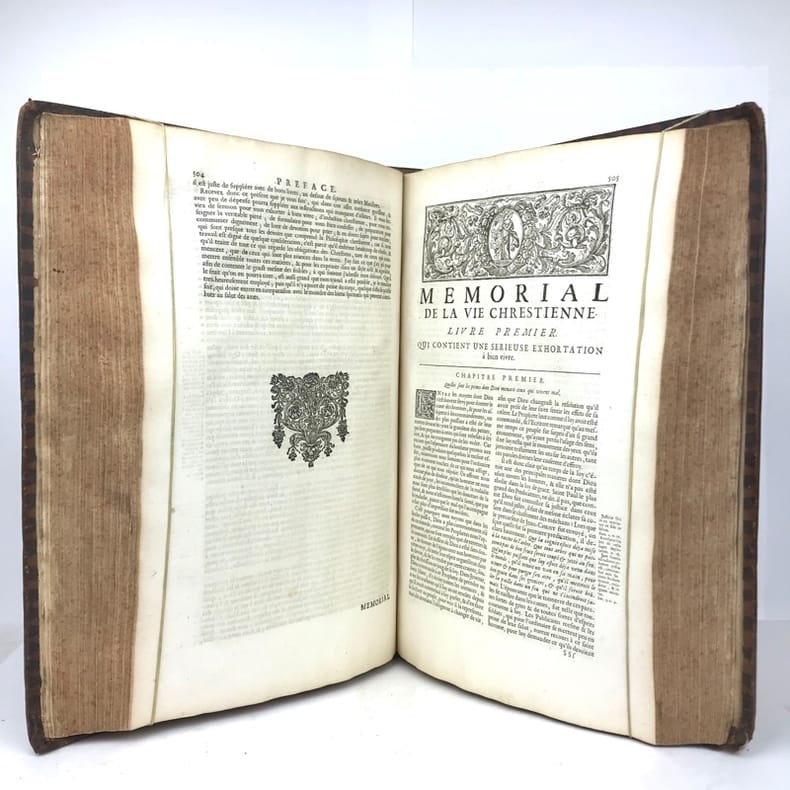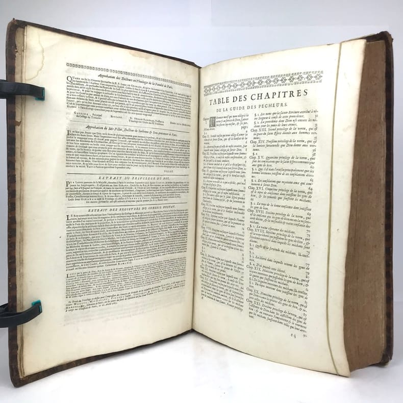 1 volume in-folio (38 cm x 24,5 cm), veau (reliure de l’époque), dos à nerfs orné, pièce de titre rouge, titre à l’encre noire et rouge, ex-libris manuscrit sur la page de titre, [20]-1049-[35] pages (complet). Frottements à la reliure, 1 mors fendu (6 cm), coins émoussés, feuillet RRrrii déchiré sans manque, mouillures. État très correct. Nouvelle édition traduite de l’espagnol en français par M. Girard. Louis de Grenade, (1504-1588), est un prêtre dominicain espagnol, prédicateur et écrivain spirituel de renom. Il est considéré comme 'Vénérable' par l'Église catholique. Entré chez les dominicains, il devint un orateur éblouissant et recherché, ainsi qu’un écrivain mystique d’une grande sensibilité et de grande notoriété, grand admirateur et défenseur de Jean de Avila, un autre grand mystique, peu à peu oublié. Il écrivit — en castillan et en portugais — plusieurs ouvrages parmi lesquels on peut citer : Le livre de l’oraison et de la méditation (1554), Le guide des pécheurs (1556), une Vie de Dom Barthélemy des Martyrs, archevêque de Braga, au Portugal, Introduction au Symbole de la foi (1583) ; celui-ci, très documenté, est comme une vraie encyclopédie de la religion chrétienne et catholique, à la lumière du mysticisme espagnol. Louis utilisa toujours une prose exemplaire par sa netteté et sa clarté, devenant de ce fait l’un des auteurs le plus prisé de son temps. Agréable exemplaire.