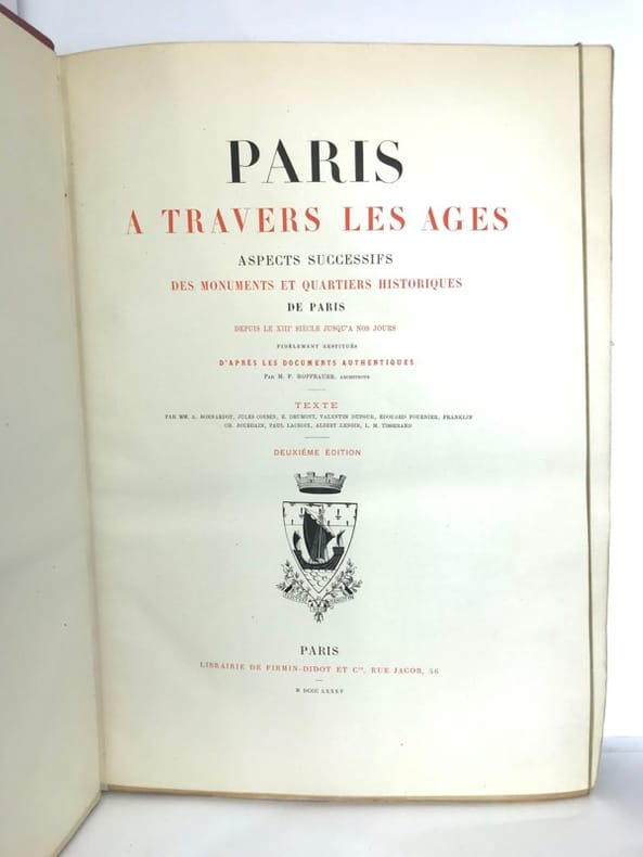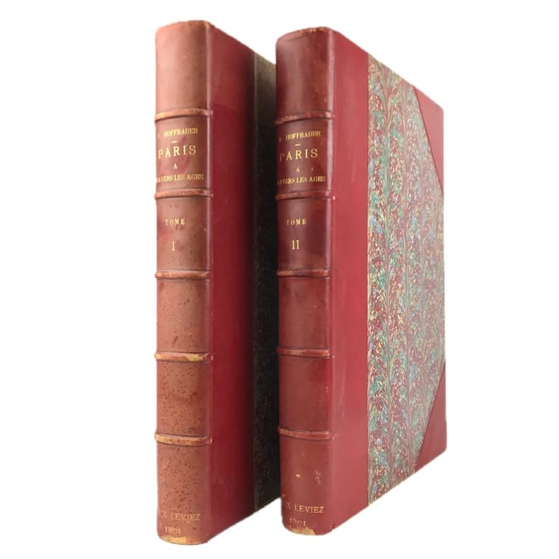 2 volume in-plano (45 cm x 32 cm), demi chagrin rouge à coins (reliure de ‘l'époque), dos à nerfs avec certificat de Prix Leviez en queue, tête dorée, texte encadré d’un filet rouge, [4]-vi-[2-56-75-[1]-72-44-64-75-[1]-56 ; [8-47-[1-54-[1]-1 bl.-60-[1]-1 bl.-44-75-[1]-55-[1] pages (complet). Frottements à la reliure. Bon état. Deuxième édition richement illustrée de 92 planches hors-texte par Hoffbauer, gravées pour la plupart par Eugène Cicéri et Philippe Benoist, ainsi que de très nombreuses in-texte. Paris à travers les âges. Aspects successifs des monuments et quartiers historiques de Paris depuis le XIIIe siècle jusqu’à nos jours, est publiée d’abord entre 1875 et 1882 par l’éditeur Firmin-Didot. Richement illustré, l’ouvrage aborde en réalité une période plus longue que celle indiquée par son sous-titre, et remontant notamment jusqu’à la ville gallo-romaine. Le livre se présente sous la forme de 14 fascicules, réunis en 2 volumes dans la 2e édition parue en 1885, qui sera définitive. Chaque fascicule traite d’un aspect de Paris ou d’un quartier, souvent représentatif d’une époque de l’histoire de la capitale. Les illustrations d’Hoffbauer sont au cœur de chaque livret : imprimées en couleur, elles rendent vivants les monuments et rues de Paris, quartier par quartier. Bel exemplaire. Vendu 02/10/2025