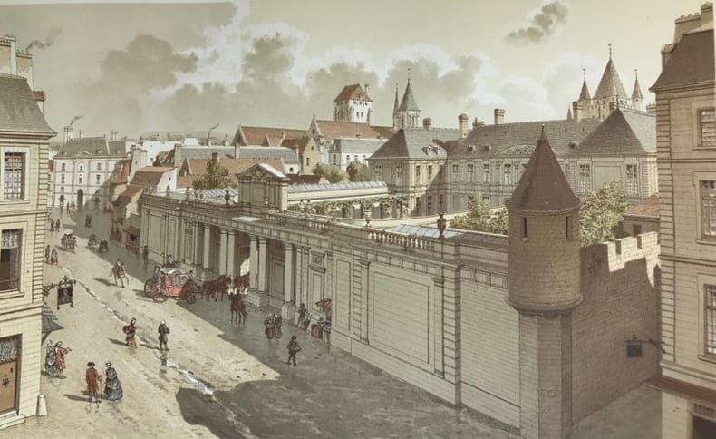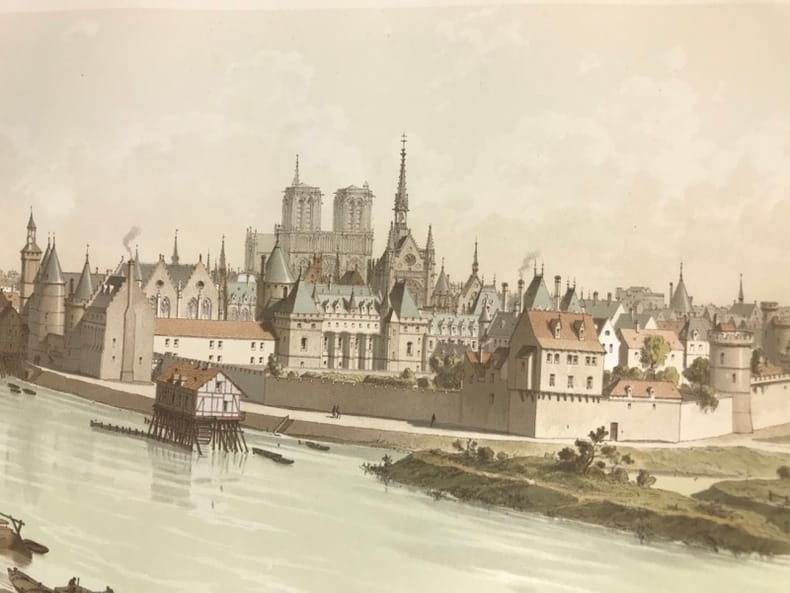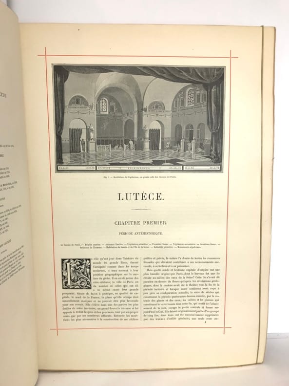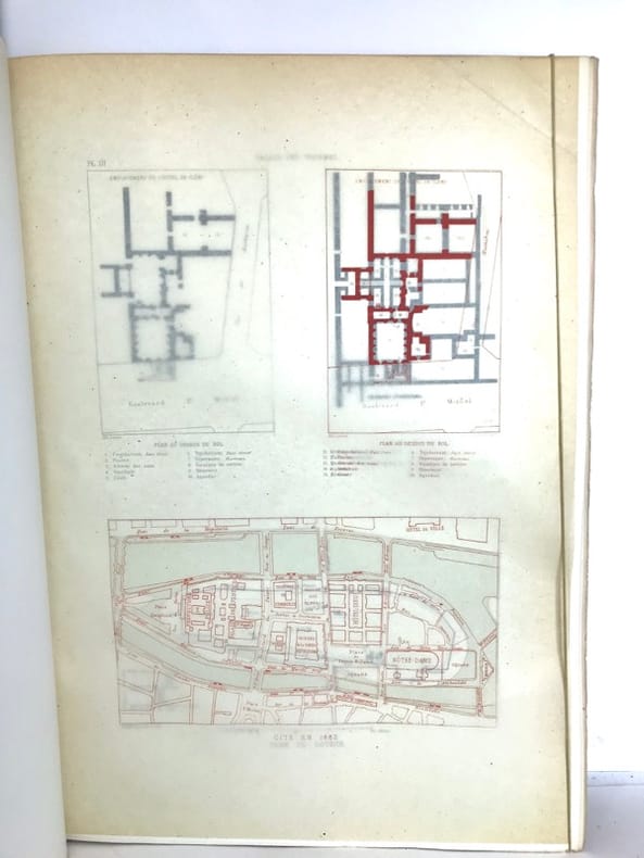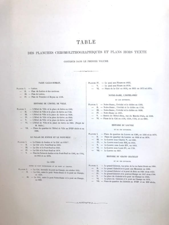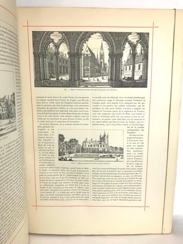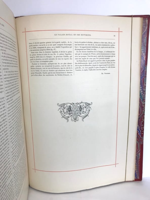 7 lithographies en couleurs réalisées à partir des dessins de l’architecte Fedor Hoffbauer, présentées selon le même point de vue, depuis le Moyen Âge ou le XVIe siècle jusqu’à l’époque de l’ouvrage. Édition originale de l’un des plus beaux livres du XIXe siècle sur l’histoire de Paris. Parue en livraison, cette publication comprend des textes composés spécialement pour ce livre par Édouard Drumont, Anatole de Montaiglon, Édouard Fournier, Alfred Bonnardot, Jules Cousin, l’abbé Valentin Dufour, Paul Lacroix, Ch. Jourdain, Alfred Franklin et Lazare-Maurice Tisserand. Ces textes, imprimés sur fond teinté, portent sur les lieux de Paris les plus pittoresques et les plus intéressants d’un point de vue historique L’illustration comprend de très nombreuses figures sur bois dans le texte, les plans sont chacun accompagnés d’un papier transparent légendé. Format 45x32cm, sous couvertures rouges, couleurs un peu passées, complet Paris : Firmin Didot et Cie, 1875-1882 D'autres livraisons en vente, groupez les achats!
