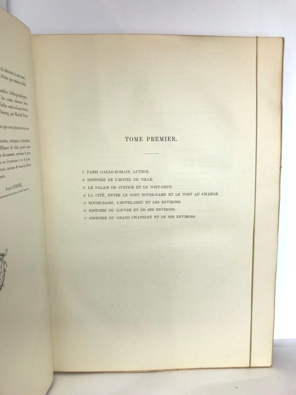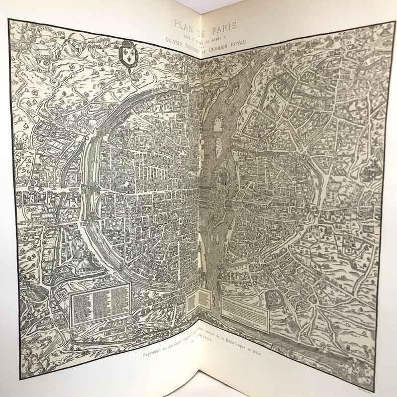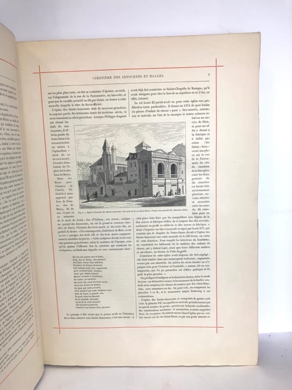 4 lithographies en couleurs réalisées à partir des dessins de l’architecte Fedor Hoffbauer, présentées selon le même point de vue, depuis le Moyen Âge ou le XVIe siècle jusqu’à l’époque de l’ouvrage. Édition originale de l’un des plus beaux livres du XIXe siècle sur l’histoire de Paris. Parue en livraison, cette publication comprend des textes composés spécialement pour ce livre par Édouard Drumont, Anatole de Montaiglon, Édouard Fournier, Alfred Bonnardot, Jules Cousin, l’abbé Valentin Dufour, Paul Lacroix, Ch. Jourdain, Alfred Franklin et Lazare-Maurice Tisserand. Ces textes, imprimés sur fond teinté, portent sur les lieux de Paris les plus pittoresques et les plus intéressants d’un point de vue historique L’illustration comprend de très nombreuses figures sur bois dans le texte, les plans sont chacun accompagnés d’un papier transparent légendé. Format 45x32cm, sous couvertures rouges, couleurs un peu passées, complet Paris : Firmin Didot et Cie, 1875-1882 D'autres livraisons en vente, groupez les achats!