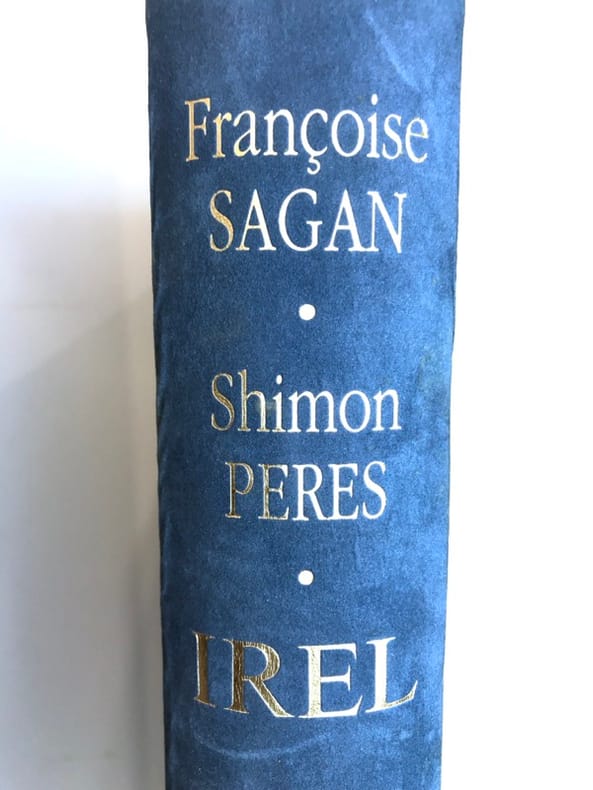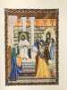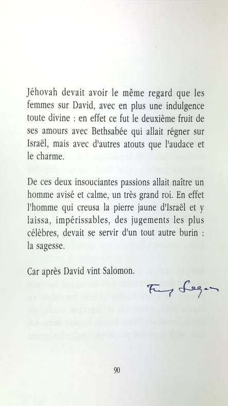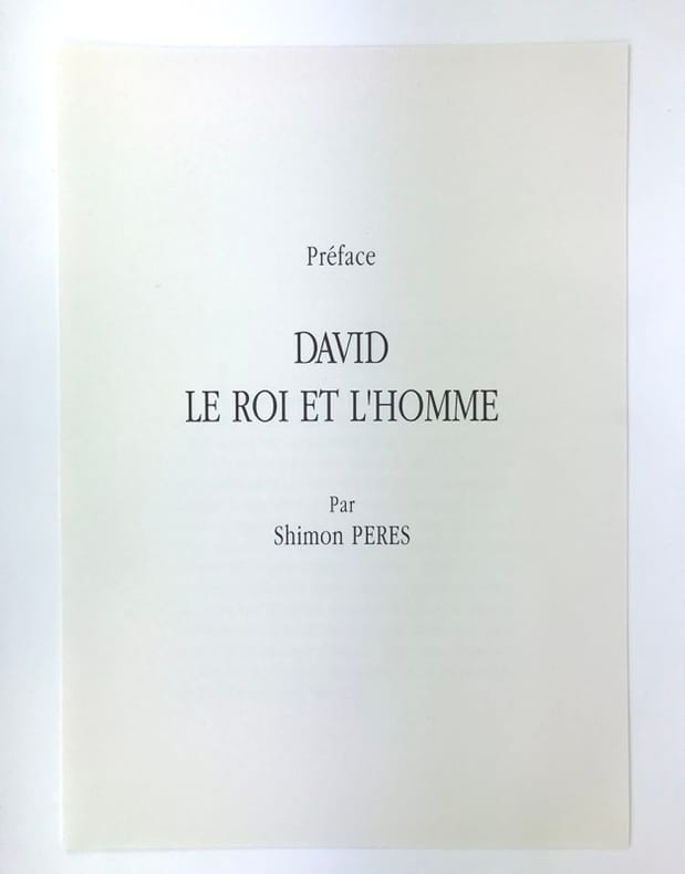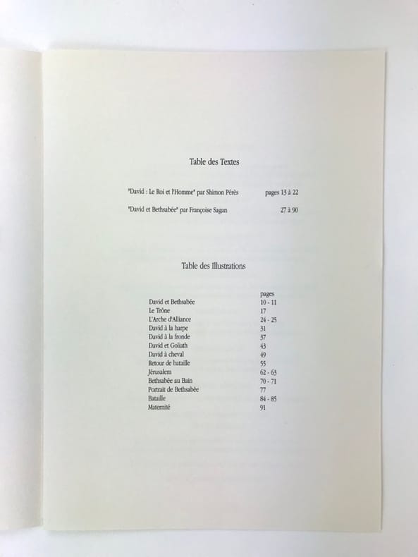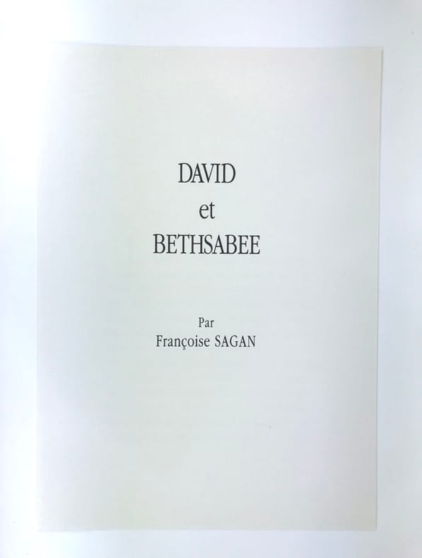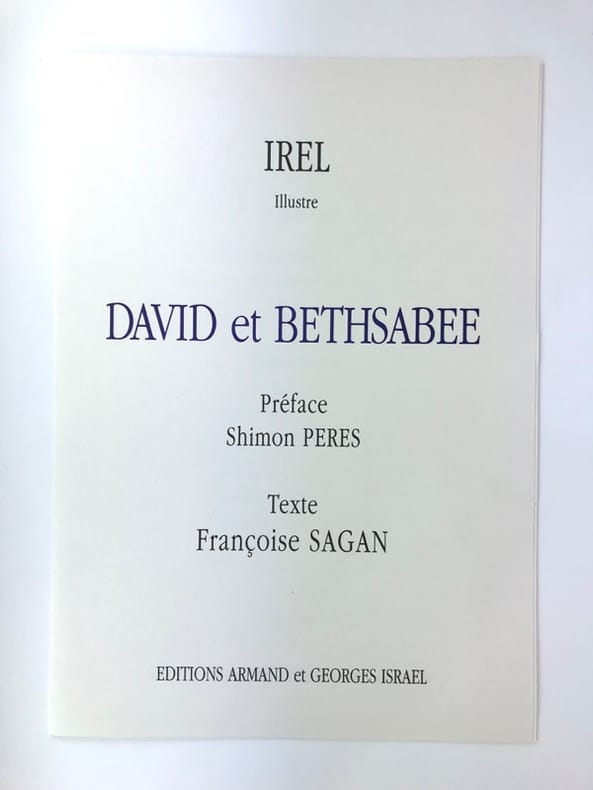 1 volume in-plano (48 x 33,5 cm), en feuilles sous emboîtage en velours bleu, 90 pages (complet). Bon état. Édition illustrée de 13 compositions en couleurs, dont certaines à double page, réalisées par Irel. Le tirage de cette édition fut limité, entre autres, à 363 exemplaires sur papier Vélin d’Arches, numérotés de 201 à 563 (exemplaire n°272). Ce texte reprend la célèbre histoire biblique narrant la relation entre le roi d’Israël David, et Bethsabée, initialement femme d’Urie le Hittite. Il est ici remis en prose par Françoise Sagan (1935-2004) et préfacé par Shimon Peres (1923-2016), ancien premier ministre d’Israël. Plaisant exemplaire.