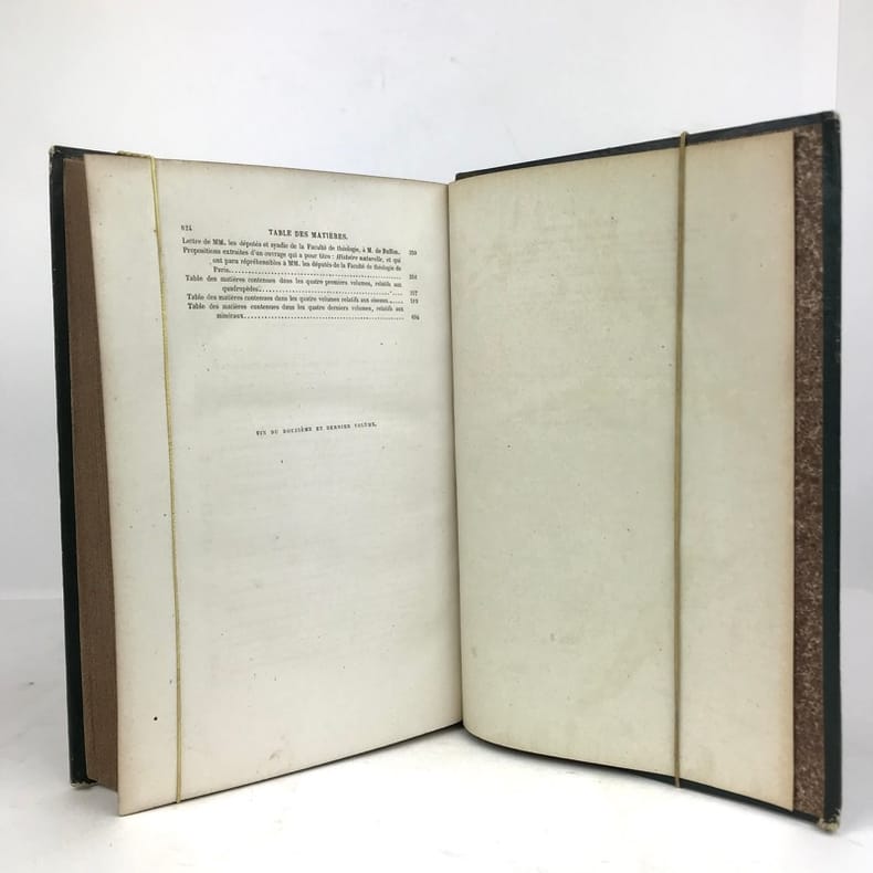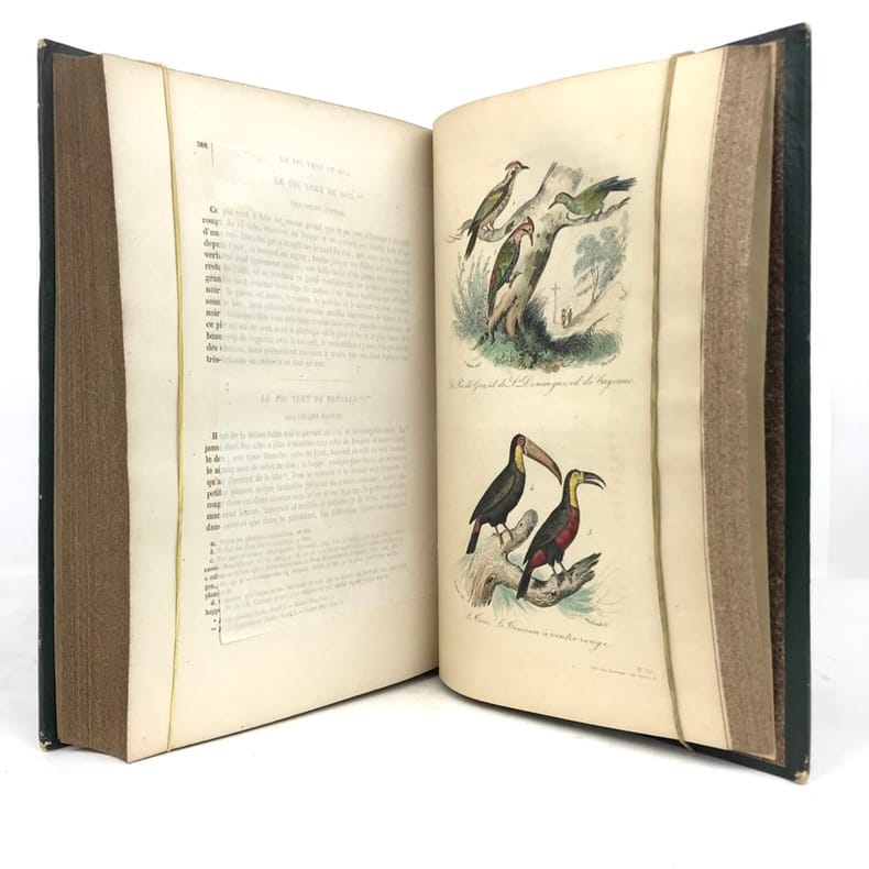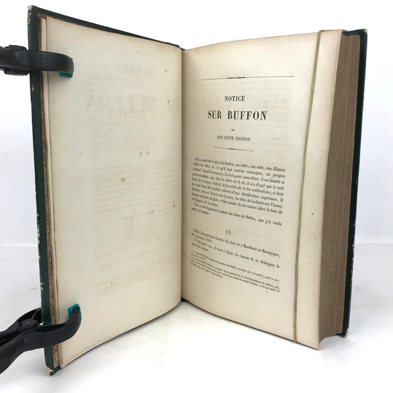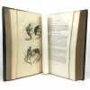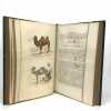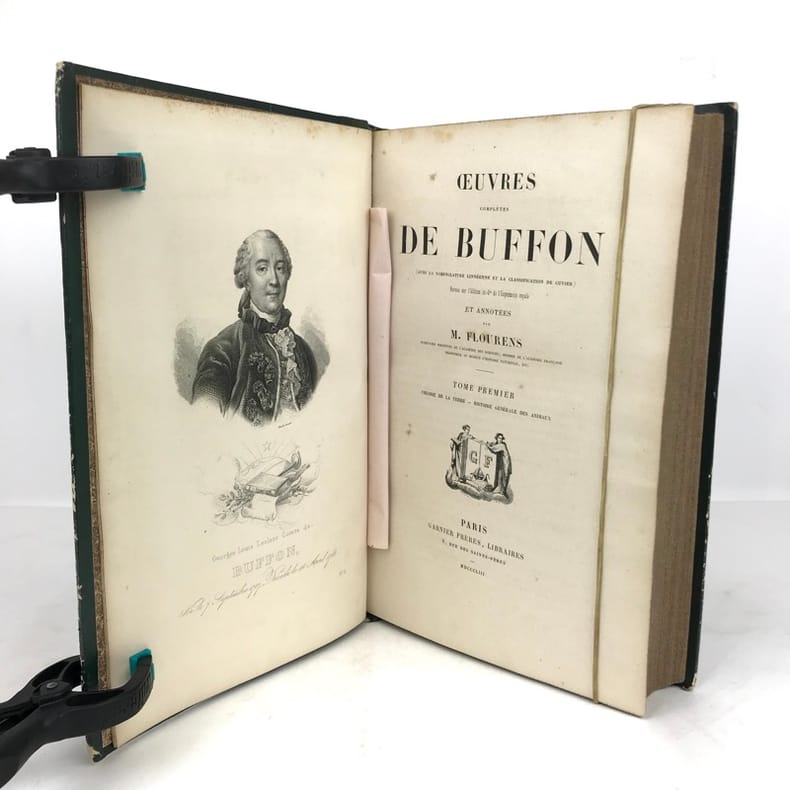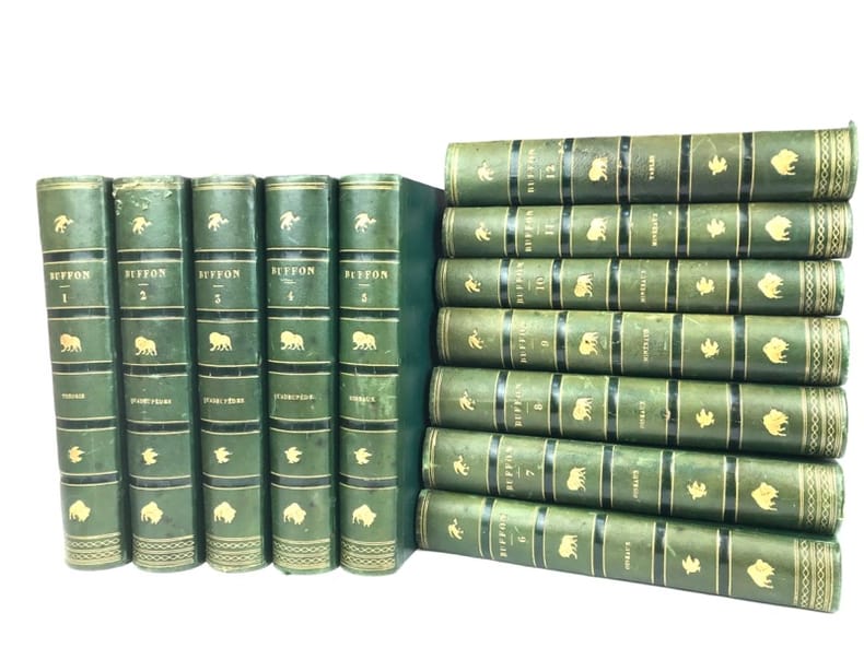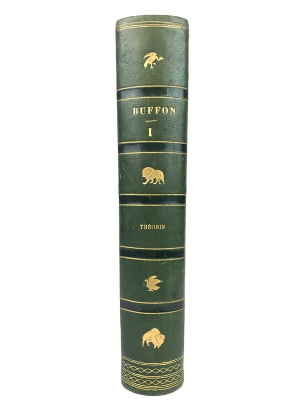 12 volumes grand in-8 (26,5 x 17,5 cm), demi maroquin vert (reliure de l’époque), dos lisse orné de motifs animaliers, tranches mouchetées, [4]-xxxvi-686 ; [4]-677-[3] ; [4]-597-[1] ; [4]-680 ; [4]-597-[1] ; [4]-586 ; [4]-624 ; [4]-631-[1] ; [4]-670 ; [4]-568-[2] ; [4]-609-[1] ; [4]-824 pages (texte complet). Deux gravures manquantes, quelques frottements aux coins et aux coupes, rousseurs. État correct. Édition richement illustrée de deux frontispices, deux cartes, et 154 gravures hors-texte, en couleurs. Nouvelle collection des œuvres complètes de Georges-Louis Leclerc (1707-1788), comte de Buffon, naturaliste et mathématicien français. Elle se divise comme suit : Tome I de Théorie de la Terre ; Tomes II à IV pour les Quadrupèdes ; Tomes V à VIII pour les Oiseaux ; Tomes IX à XI pour les Minéraux . Et enfin le tome XII pour la table des matières. Agréable ensemble.