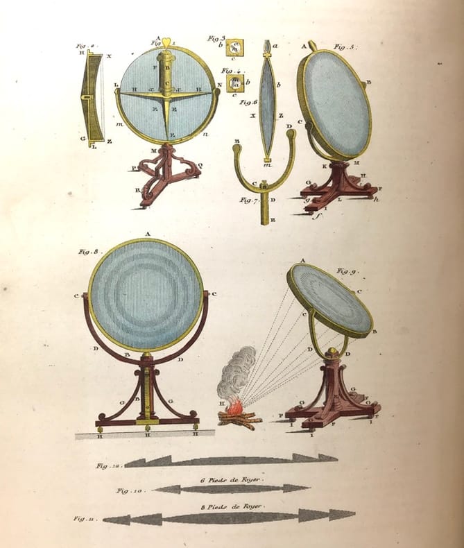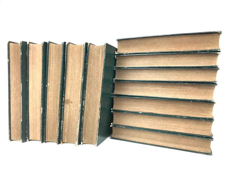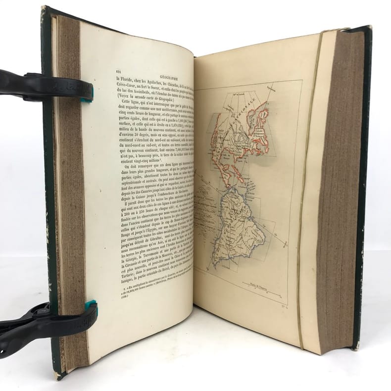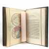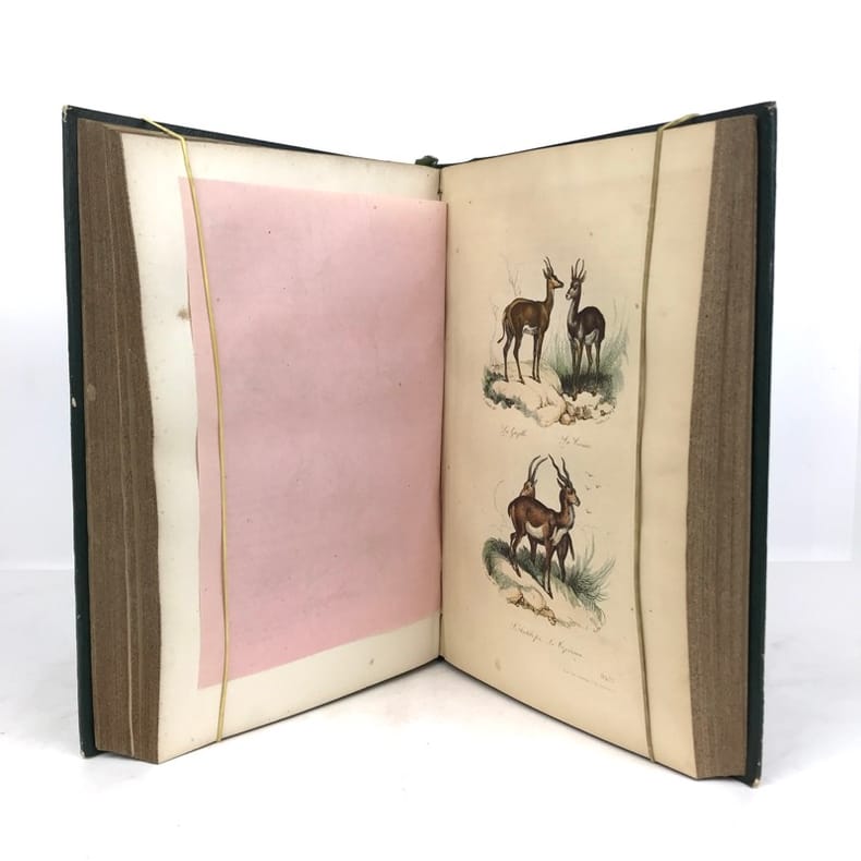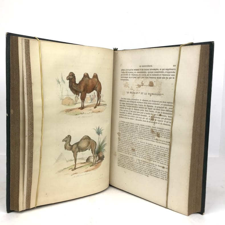 12 volumes grand in-8 (26,5 x 17,5 cm), demi maroquin vert (reliure de l’époque), dos lisse orné de motifs animaliers, tranches mouchetées, [4]-xxxvi-686 ; [4]-677-[3] ; [4]-597-[1] ; [4]-680 ; [4]-597-[1] ; [4]-586 ; [4]-624 ; [4]-631-[1] ; [4]-670 ; [4]-568-[2] ; [4]-609-[1] ; [4]-824 pages (texte complet). Deux gravures manquantes, quelques frottements aux coins et aux coupes, rousseurs. État correct. Édition richement illustrée de deux frontispices, deux cartes, et 154 gravures hors-texte, en couleurs. Nouvelle collection des œuvres complètes de Georges-Louis Leclerc (1707-1788), comte de Buffon, naturaliste et mathématicien français. Elle se divise comme suit : Tome I de Théorie de la Terre ; Tomes II à IV pour les Quadrupèdes ; Tomes V à VIII pour les Oiseaux ; Tomes IX à XI pour les Minéraux . Et enfin le tome XII pour la table des matières. Agréable ensemble.
