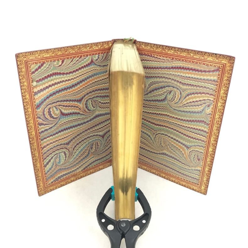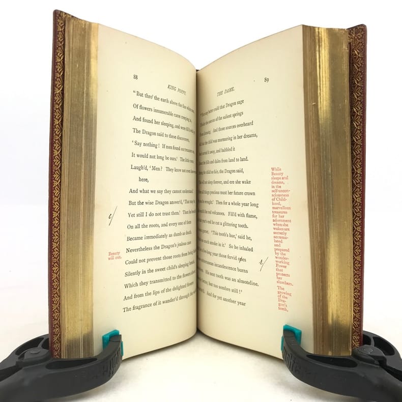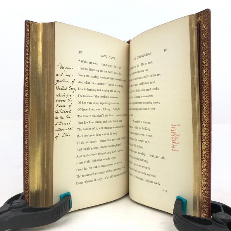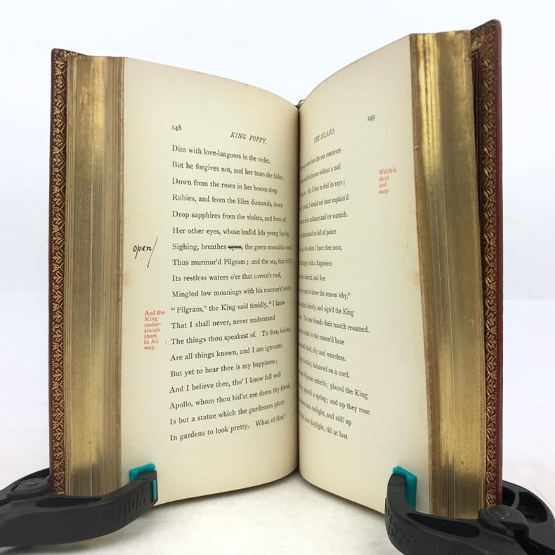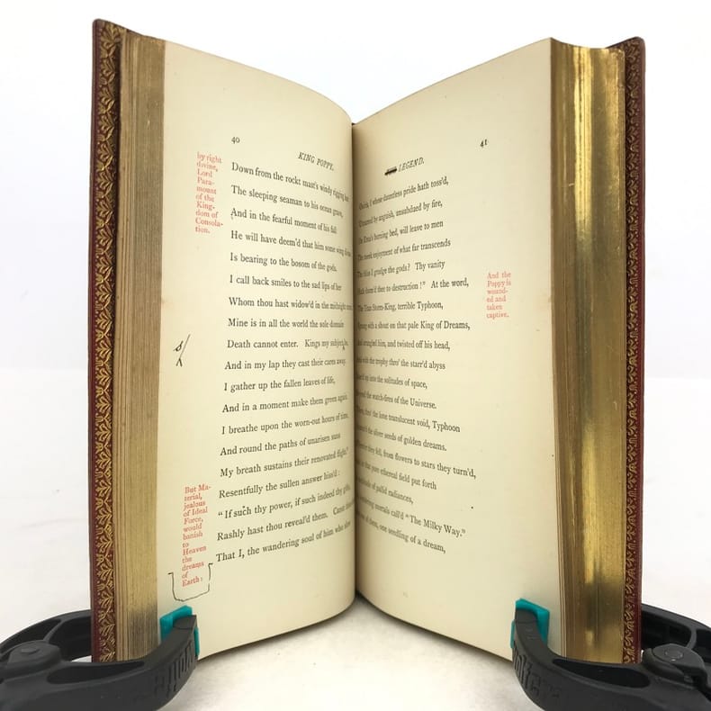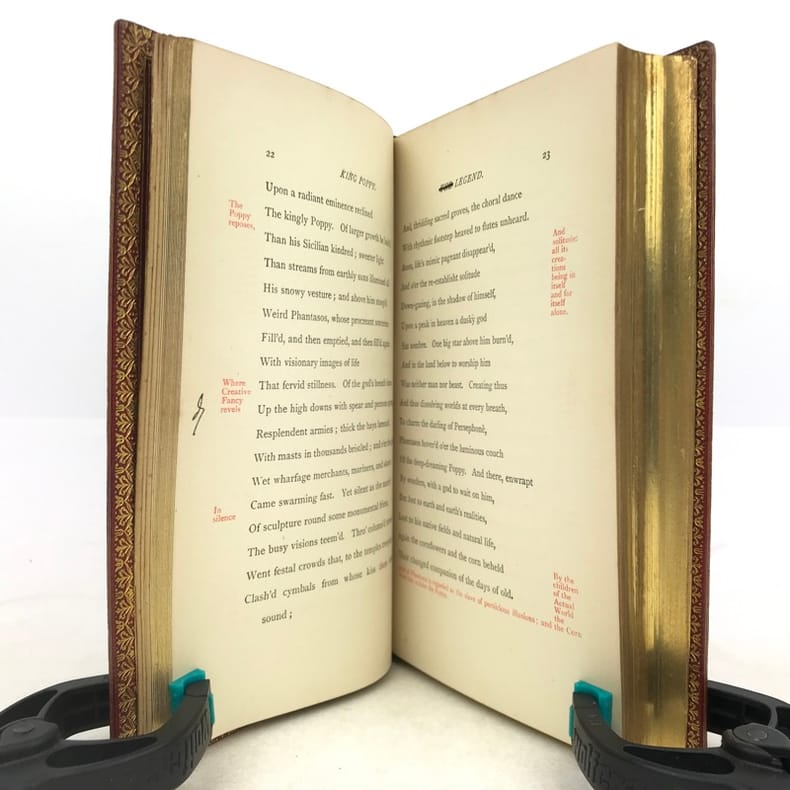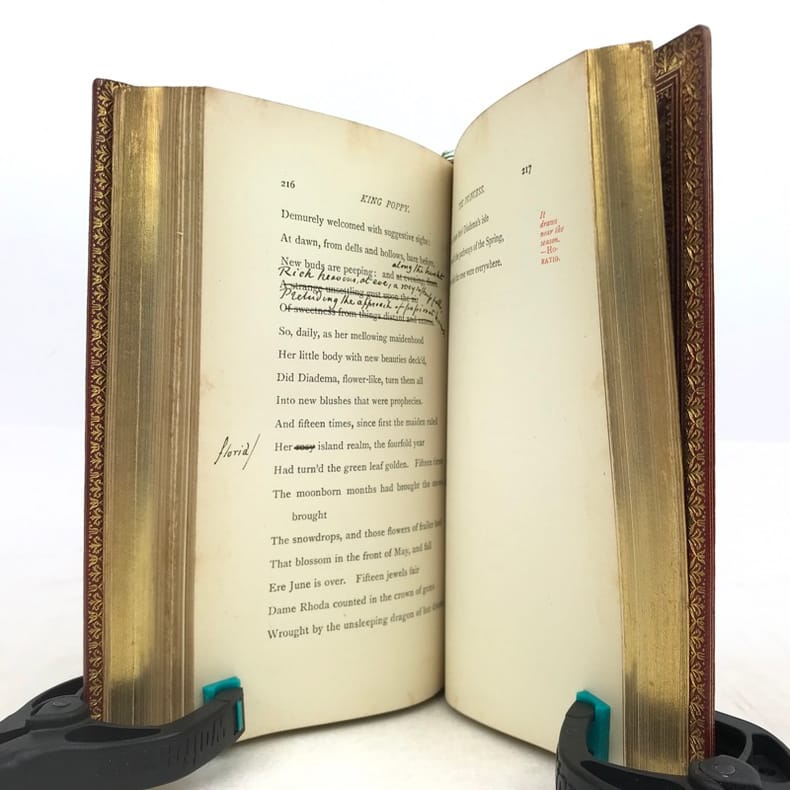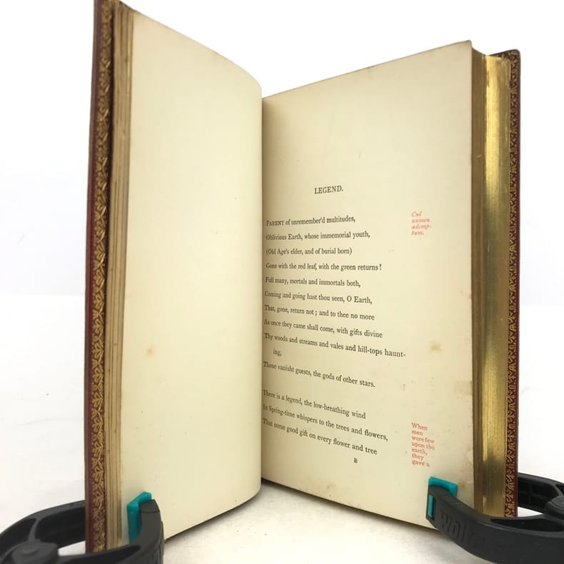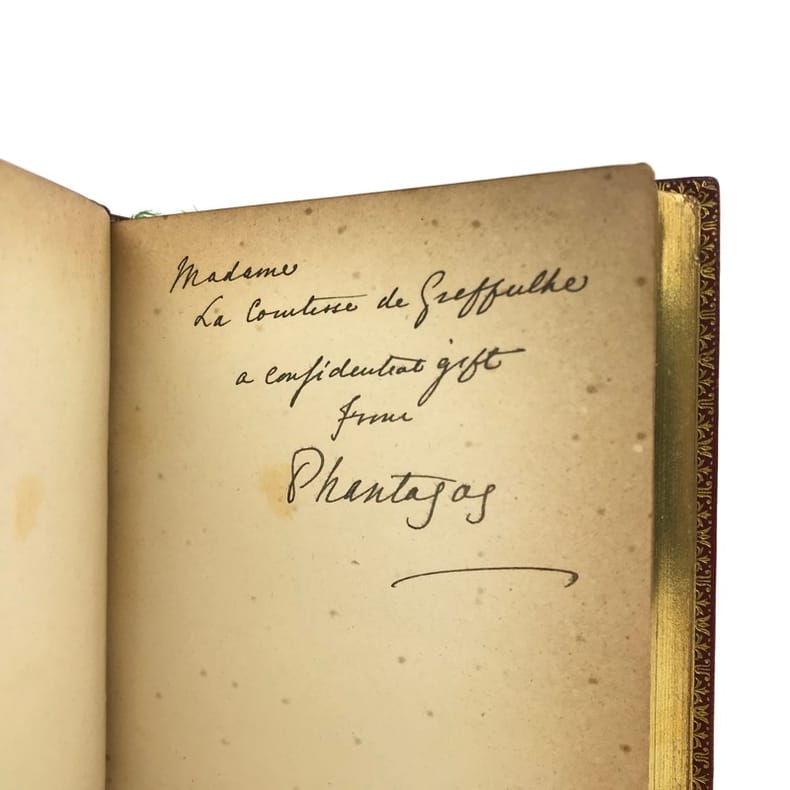 1 volume in-8 (16,5 x 10,5 cm), maroquin rouge (reliure de l’époque, signée Dodé), dos à nerfs avec titre doré, double filet doré sur les coupes, dentelle dorée sur les chasses, tranches dorées, inscription manuscrite : “Unpublished and most private”, notes en marges imprimées en rouge, [8]-330 pages. Feuillets D7, F4, H4, I7, L4, N1, O3, P5, Q6, R5, S5, U4 manquants (corrections possibles de l’auteur), légers frottements aux mors et coiffes. État très correct tout de même. ENVOI AUTOGRAPHE de l’auteur à “Madame La Comtesse de Greffulhe, a confidential gift from Phantasos”. De son nom de naissance Marie-Joséphine-Anatole-Louise-Élisabeth de Riquet, comtesse de Caraman-Chimay (1860-1952), dont il tomba amoureux, est une aristocrate parisienne de la Belle Époque, l'un des modèles d'inspiration de Marcel Proust pour le personnage de la duchesse de Guermantes dans À la recherche du temps perdu. EXEMPLAIRE D’ÉPREUVES, comprenant quelques corrections auctoriales à l’encre noire. Edward Robert Bulwer-Lytton (1831-1891) est un diplomate, un homme d'État et un poète britannique. Ce poème, conçu en 1872 et mis en vers pour la première fois en 1874, n'a jamais été entièrement abandonné par son auteur, qui l'a presque entièrement réécrit au cours des dernières années de sa vie, et en particulier lors de son ambassade parisienne durant l'été 1887, qu’il passe à proximité de la comtesse de Greffulhe. L’œuvre sera finalement publiée sous un nom d’emprunt, Owen Meridith. UNIQUE EXEMPLAIRE.