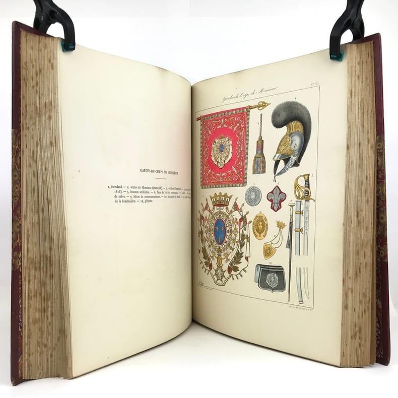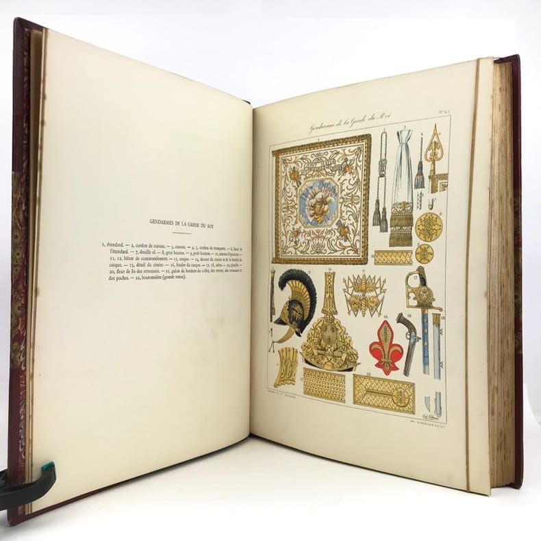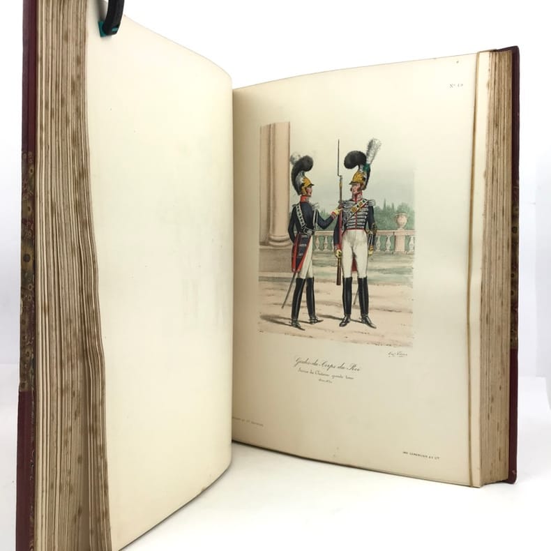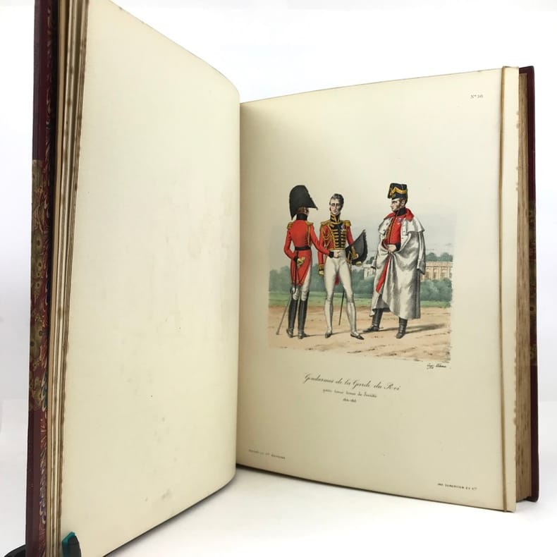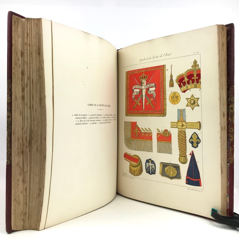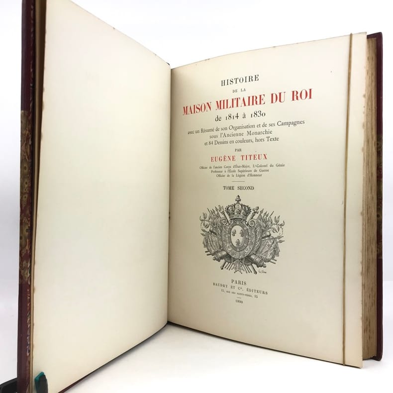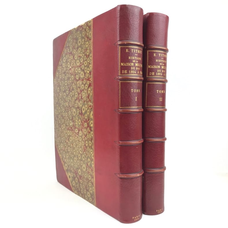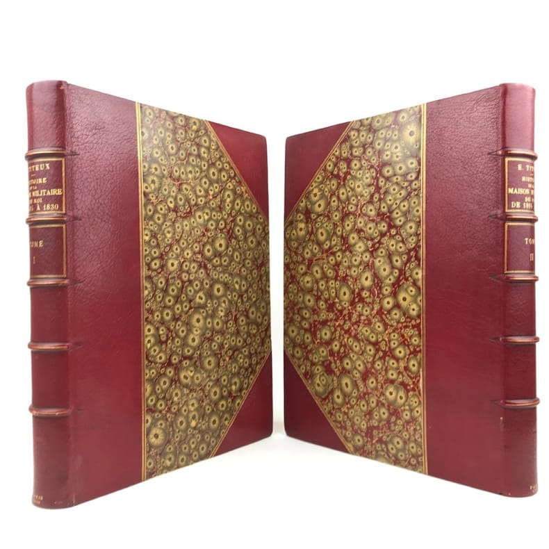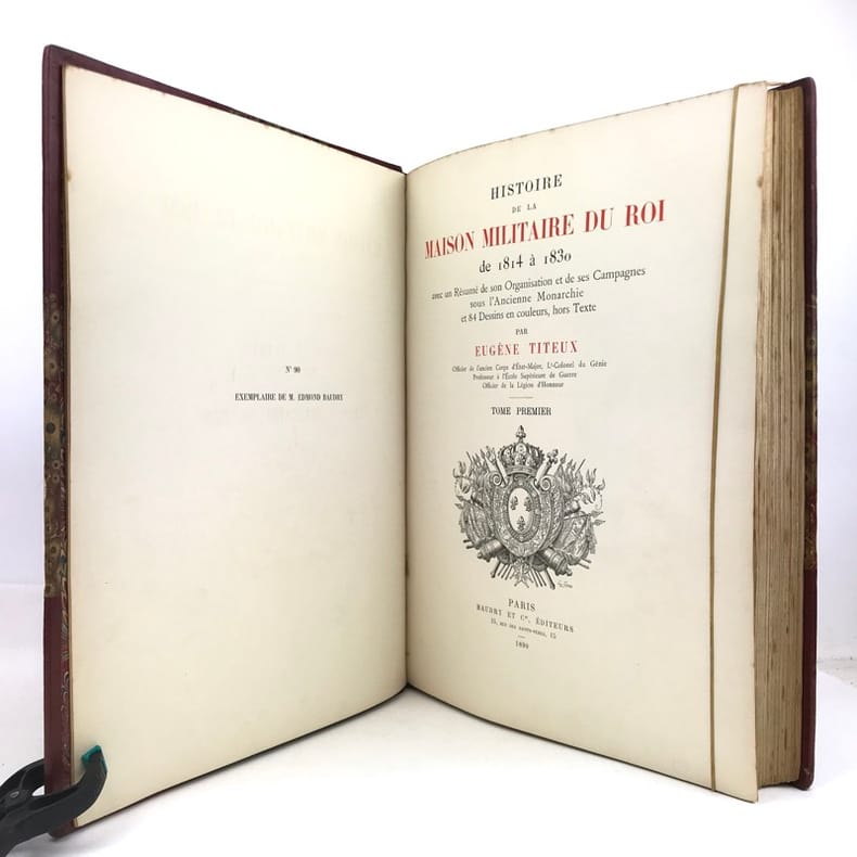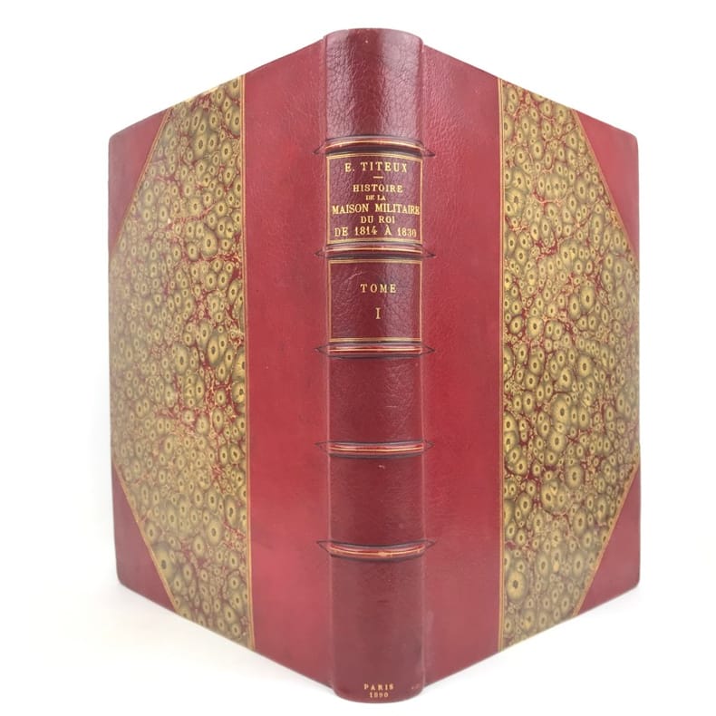 2 volumes in-folio (36,5 x 28 cm), demi-maroquin rouge à coins (reliure de l’époque), dos à nerfs orné, triple filet en bordures, tranche de tête dorée, titre en rouge et noir, [4]-viii-331-[1] ; [2]-338-[2] pages (complet). Bon état. ÉDITION ORIGINALE, illustrée de 84 planches hors-texte en couleurs. Exemplaire n°90, imprimé pour M. Edmond Baudry. Eugène Titeux (1838-1904) est un officier militaire et historien français, qui s’attèle ici à décrire le fonctionnement précis de l’armée française durant la Restauration, et en particulier sous le règne de Louis XVIII et Charles X. Il évoque notamment la garde rapprochée du roi, les Cent-Suisses, la cavalerie, ou encore les maréchaux. BEL EXEMPLAIRE.