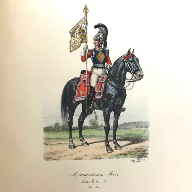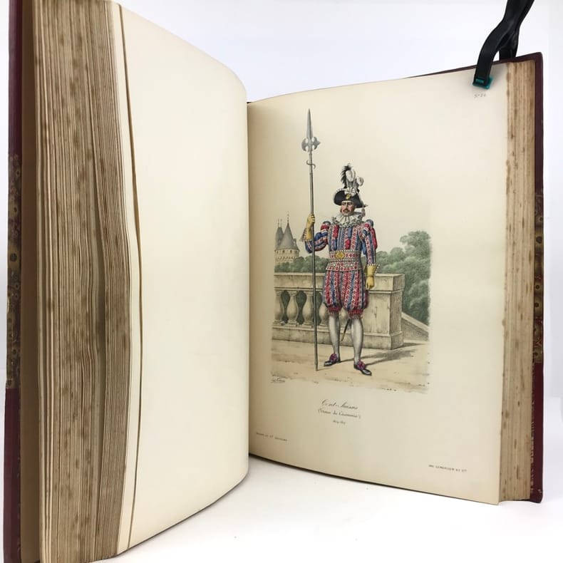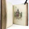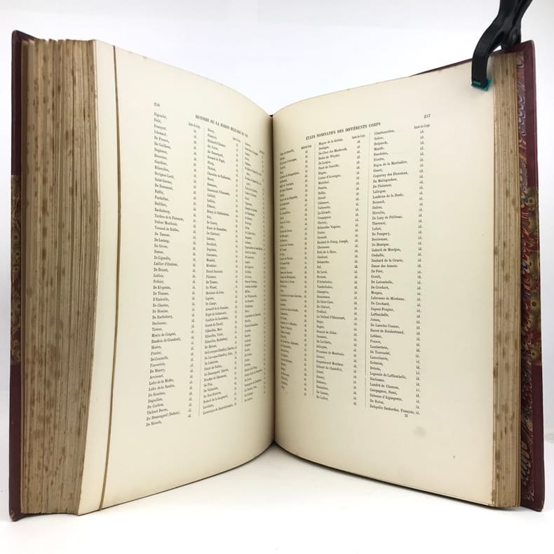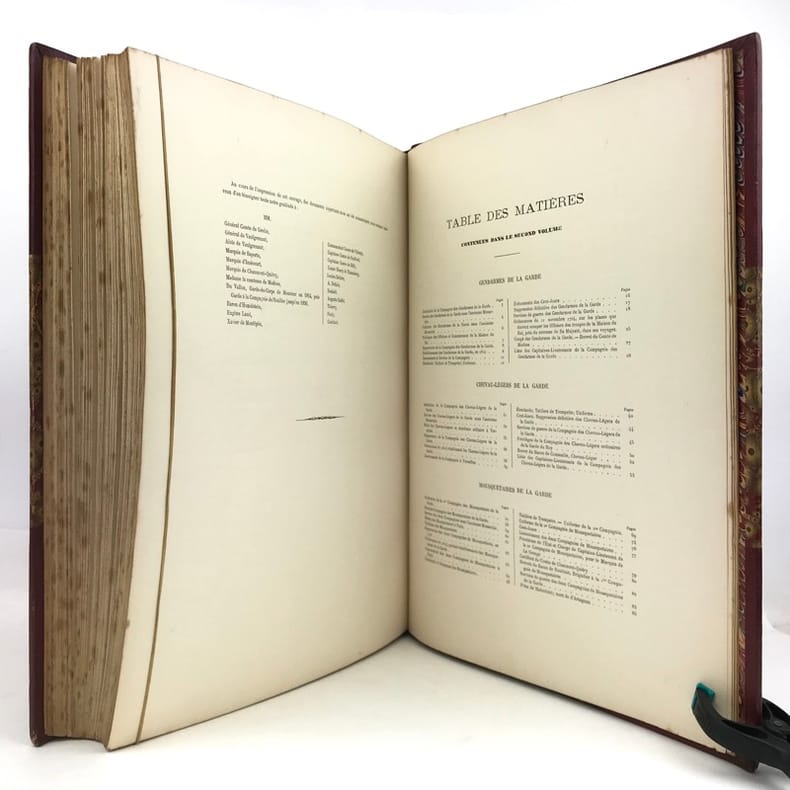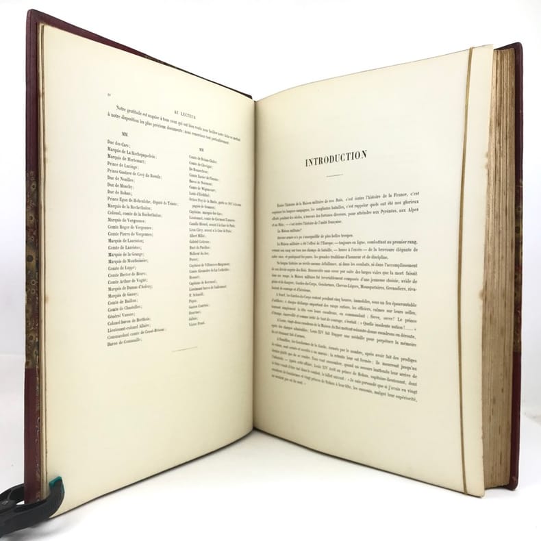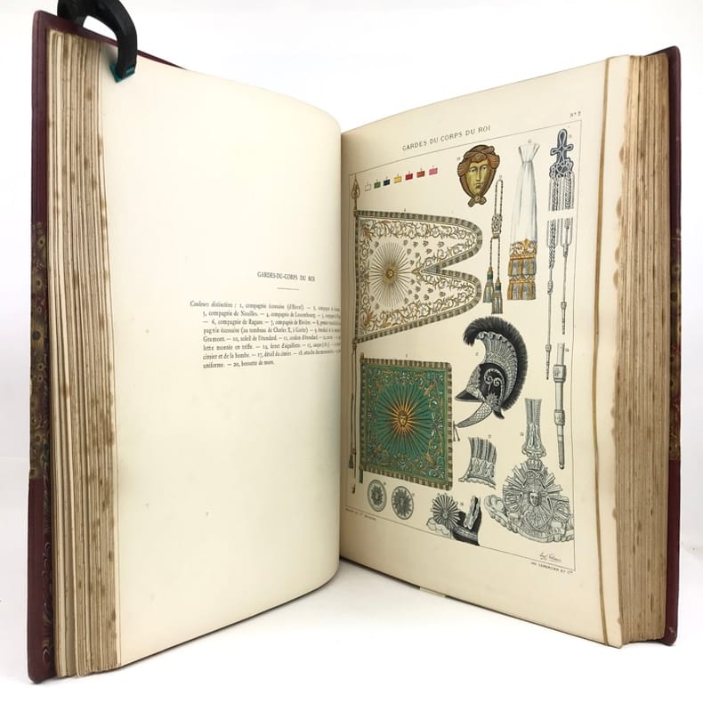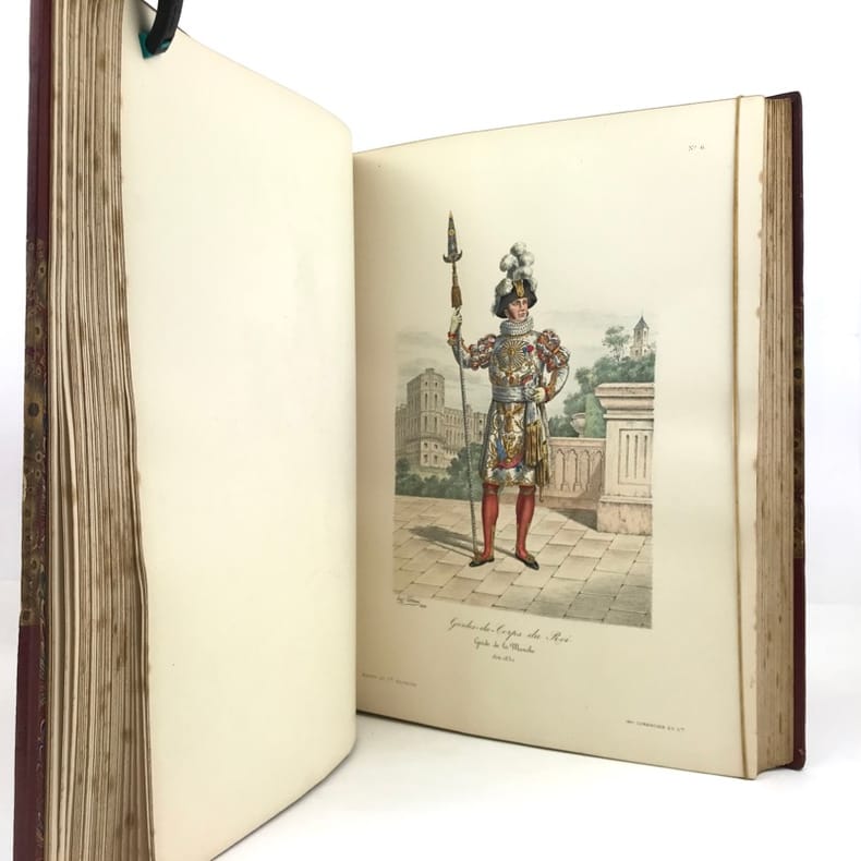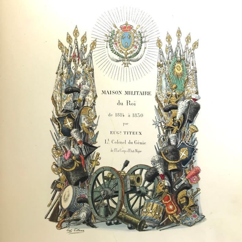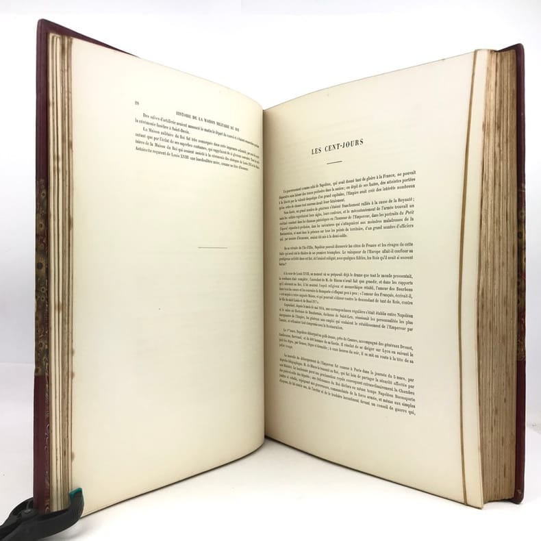 2 volumes in-folio (36,5 x 28 cm), demi-maroquin rouge à coins (reliure de l’époque), dos à nerfs orné, triple filet en bordures, tranche de tête dorée, titre en rouge et noir, [4]-viii-331-[1] ; [2]-338-[2] pages (complet). Bon état. ÉDITION ORIGINALE, illustrée de 84 planches hors-texte en couleurs. Exemplaire n°90, imprimé pour M. Edmond Baudry. Eugène Titeux (1838-1904) est un officier militaire et historien français, qui s’attèle ici à décrire le fonctionnement précis de l’armée française durant la Restauration, et en particulier sous le règne de Louis XVIII et Charles X. Il évoque notamment la garde rapprochée du roi, les Cent-Suisses, la cavalerie, ou encore les maréchaux. BEL EXEMPLAIRE.