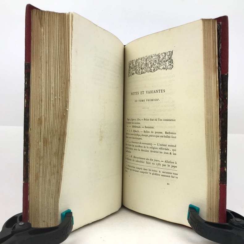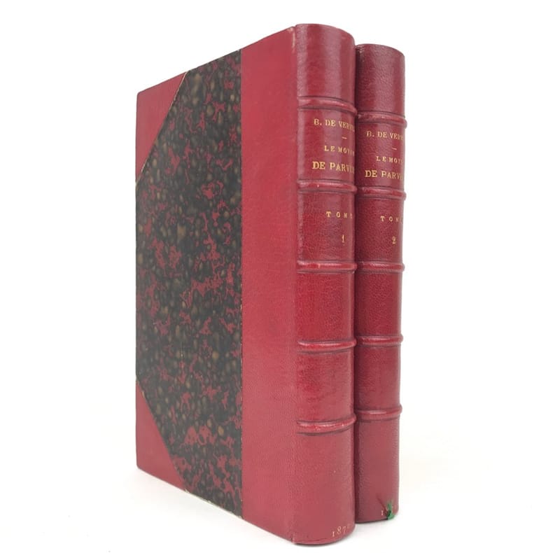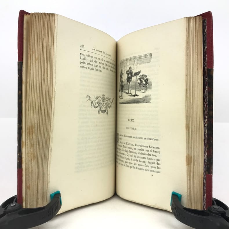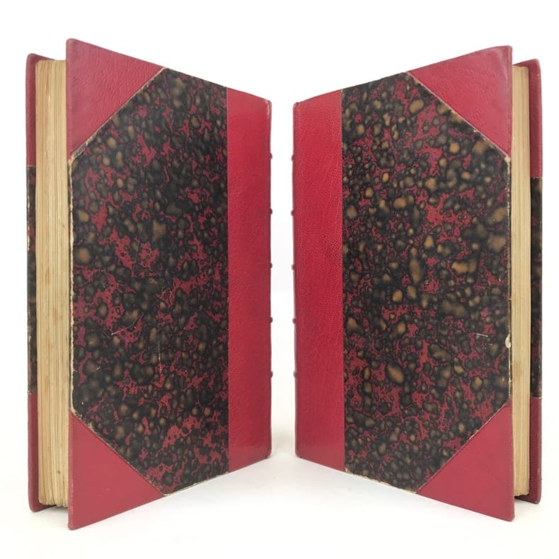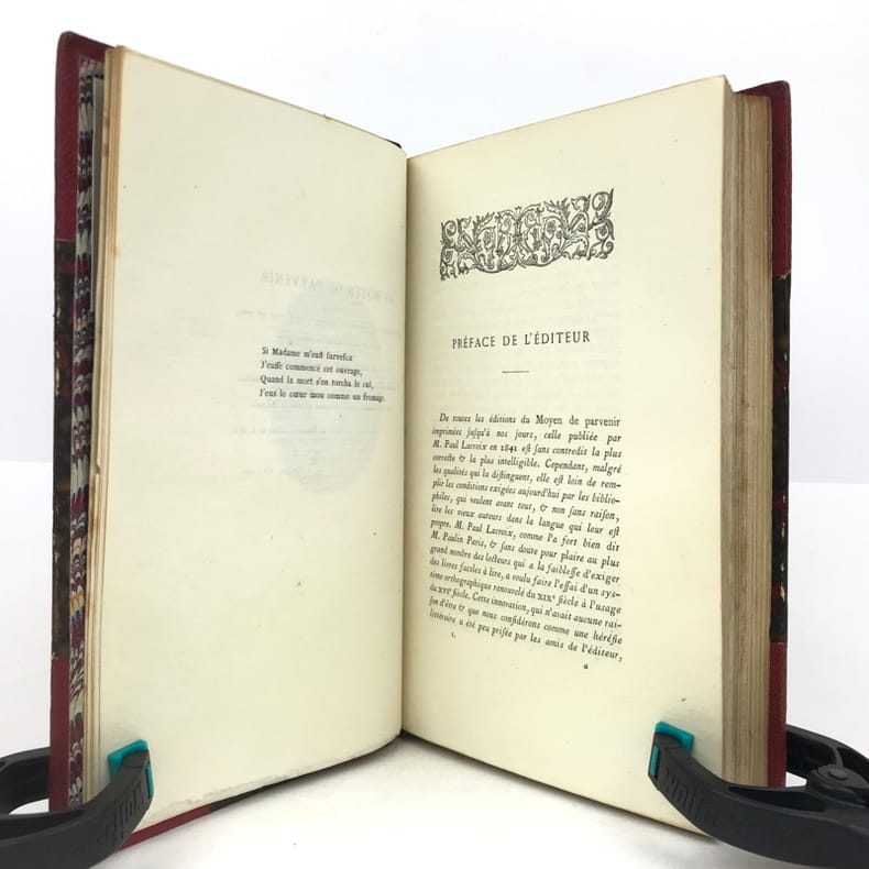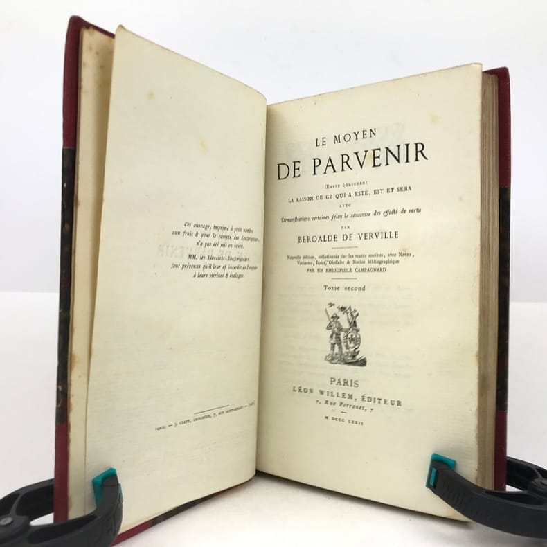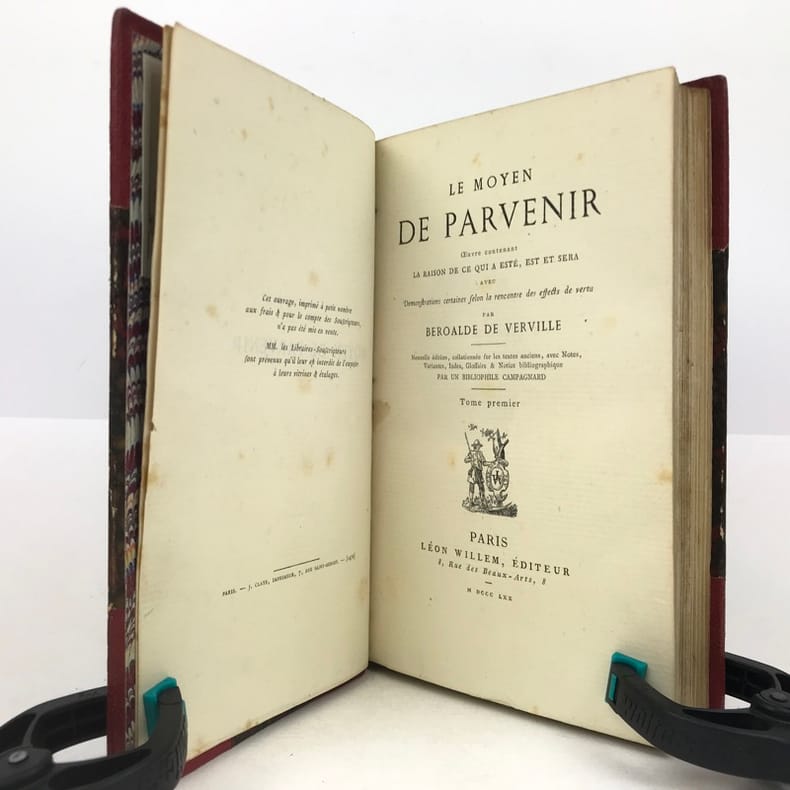 2 volumes in-12 (18,6 x 11,5 cm), demi-maroquin rouge à coins (reliure de l’époque), dos à nerfs avec auteur, titre et tomaison frappés à l’or, têtes dorées, ex-libris contrecollé sur le contreplat de Serge Barrier, [6]-xlviii-382 ; [4]-xv-1 bl.-471 [au lieu de 417]-[3] pages (complet). Légers frottements aux dos, quelques rousseurs éparses. Bon état. Édition illustrée d’un portrait hors texte et de charmantes vignettes gravées sur bois en tête de chaque chapitre. Charmante édition hors commerce établie par un Bibliophile campagnard avec notes, variantes, index, glossaire et notice bibliographique. François Béroalde de Verville de son vrai nom François Vatable Brouard (1556-1626) poète français. Le plus connu des ouvrages de François Béroalde est Le Moyen de parvenir, publié pour la première fois en 1616 ; imprimé sous le titre de Salmigondis, ainsi que sous celui de Coupe-cu de la Mélancolie, ou Vénus en belle humeur. Bel exemplaire.