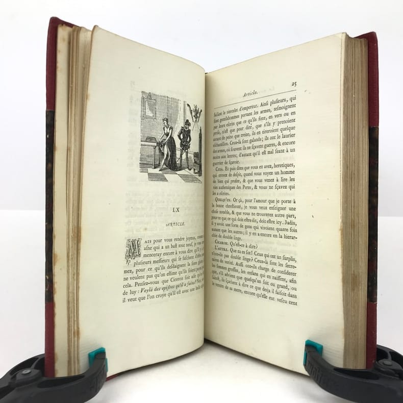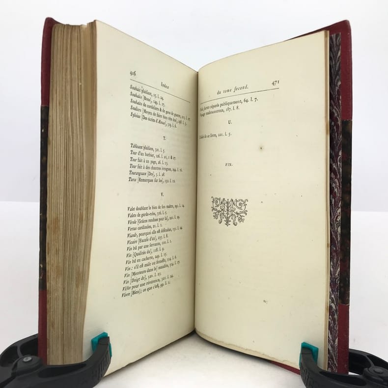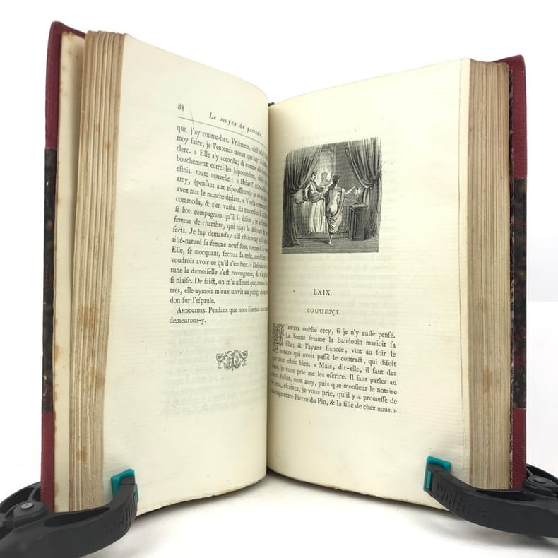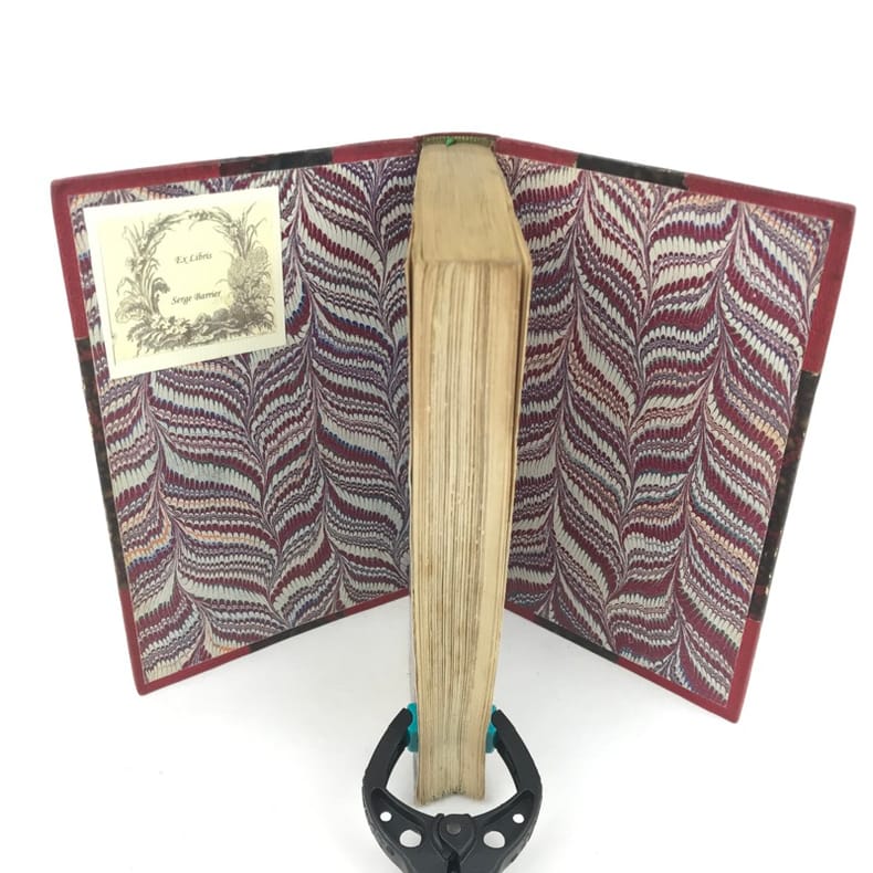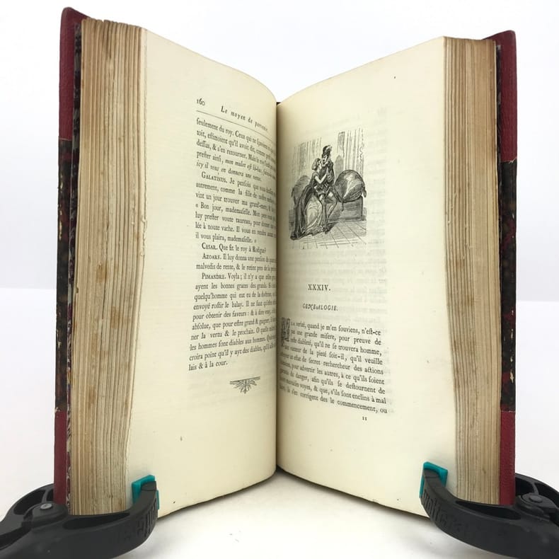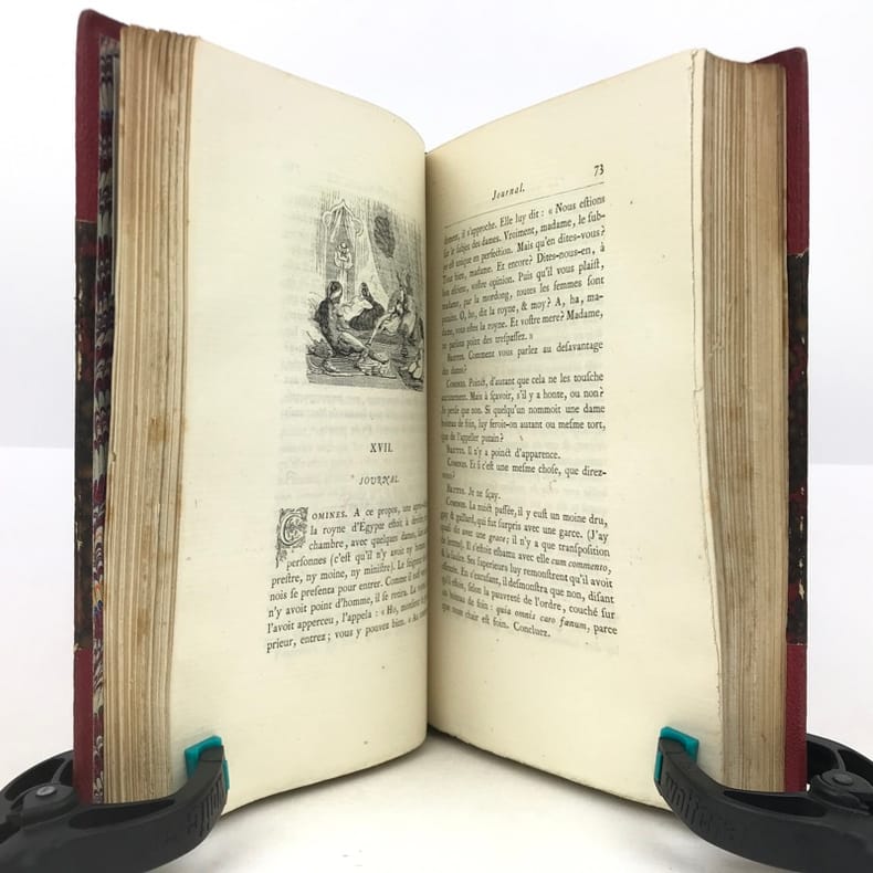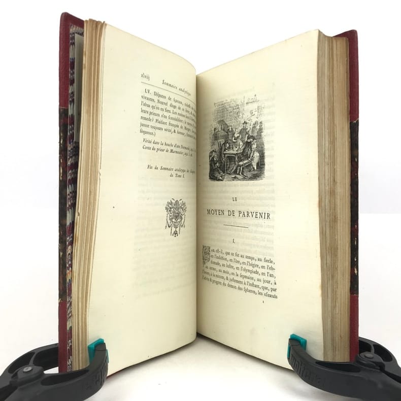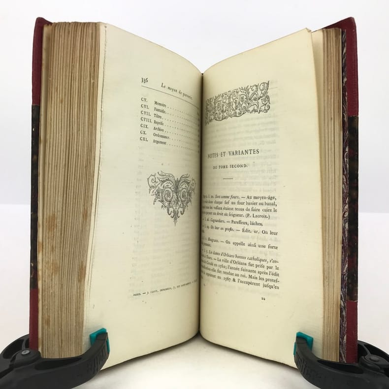 2 volumes in-12 (18,6 x 11,5 cm), demi-maroquin rouge à coins (reliure de l’époque), dos à nerfs avec auteur, titre et tomaison frappés à l’or, têtes dorées, ex-libris contrecollé sur le contreplat de Serge Barrier, [6]-xlviii-382 ; [4]-xv-1 bl.-471 [au lieu de 417]-[3] pages (complet). Légers frottements aux dos, quelques rousseurs éparses. Bon état. Édition illustrée d’un portrait hors texte et de charmantes vignettes gravées sur bois en tête de chaque chapitre. Charmante édition hors commerce établie par un Bibliophile campagnard avec notes, variantes, index, glossaire et notice bibliographique. François Béroalde de Verville de son vrai nom François Vatable Brouard (1556-1626) poète français. Le plus connu des ouvrages de François Béroalde est Le Moyen de parvenir, publié pour la première fois en 1616 ; imprimé sous le titre de Salmigondis, ainsi que sous celui de Coupe-cu de la Mélancolie, ou Vénus en belle humeur. Bel exemplaire.